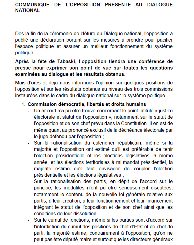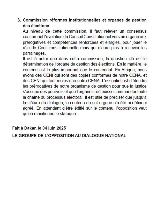 A la Une Actualité Politique COMMUNIQUE DE L’OPPOSITION PRESENTE AU DIALOGUE NATIONAL H Wane juin 5, 2025 0 Post navigation Previous: Ismaïla Sarr victime d’escroquerie immobilière à Diamniadio : 32 millions de FCFA envolésNext: Décès de Nicolas Diop : ministre de la Culture, artistes et animateurs lui rendent un vibrant hommage More Stories A la Une Actualité Politique Ce que change la nouvelle loi électorale adoptée par les députés Bour Sine avril 28, 2026 0 A la Une Actualité Politique « Ensemble, nous sommes une force »Par Hamidou Thiaw, Président du MPR Bour Sine avril 28, 2026 0 A la Une Actualité Pape Malick Ndour envoyé en prison Bour Sine avril 28, 2026 0 Laisser un commentaire Annuler la réponseVotre adresse e-mail ne sera pas publiée. Les champs obligatoires sont indiqués avec *Commentaire * Nom * E-mail * Site web Enregistrer mon nom, mon e-mail et mon site dans le navigateur pour mon prochain commentaire.
