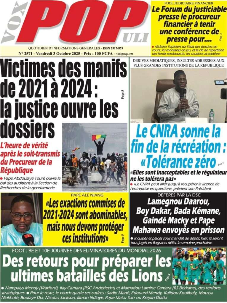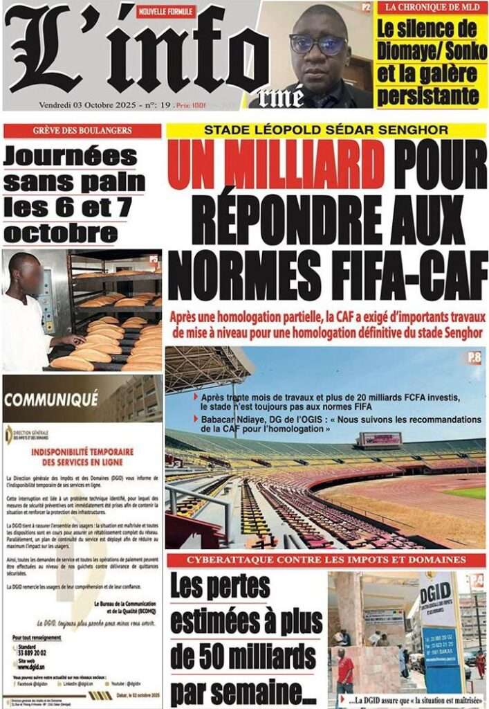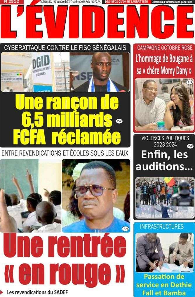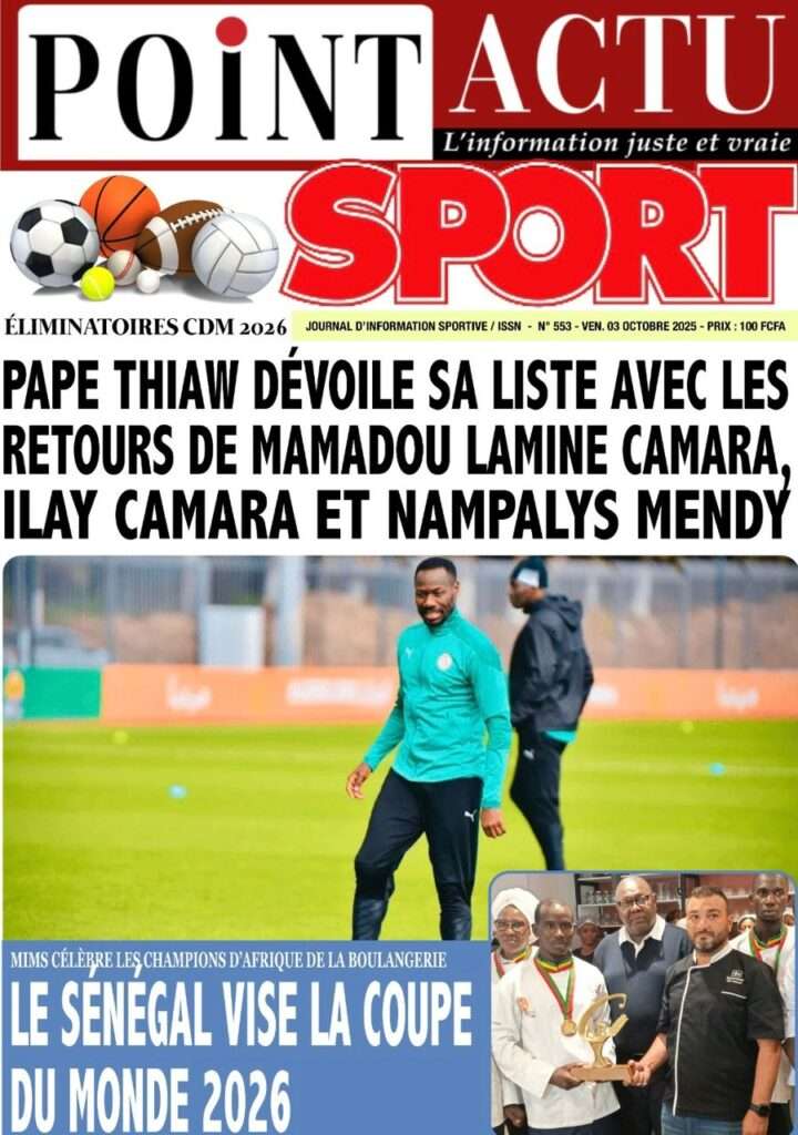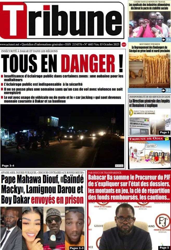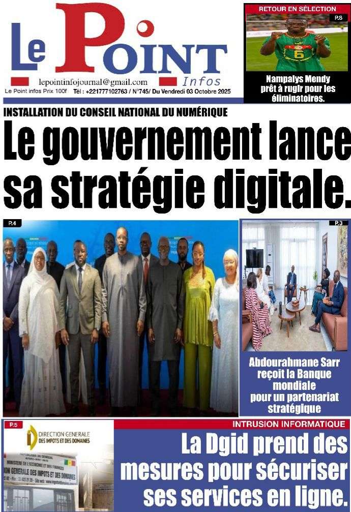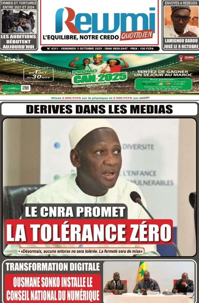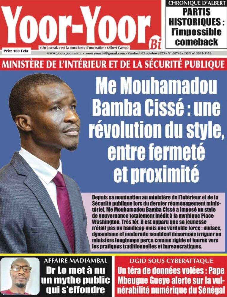 A la Une Actualité La Une Des Quotidiens – Vendredi 03 Octobre 2025 (Avec Ma Revue De Presse) Bour Sine octobre 3, 2025 0 Post navigation Previous: Macky Sall, l’Afrique au cœur ? Un peuple à dosNext: XEW-XEWU DIAMONO – Sortie de Macky Sall : défi lancé au régime ? Le PDS fait-il toujours le poids ? More Stories A la Une Actualité Politique Ce que change la nouvelle loi électorale adoptée par les députés Bour Sine avril 28, 2026 0 A la Une Actualité Politique « Ensemble, nous sommes une force »Par Hamidou Thiaw, Président du MPR Bour Sine avril 28, 2026 0 A la Une Actualité Pape Malick Ndour envoyé en prison Bour Sine avril 28, 2026 0 Laisser un commentaire Annuler la réponseVotre adresse e-mail ne sera pas publiée. Les champs obligatoires sont indiqués avec *Commentaire * Nom * E-mail * Site web Enregistrer mon nom, mon e-mail et mon site dans le navigateur pour mon prochain commentaire.