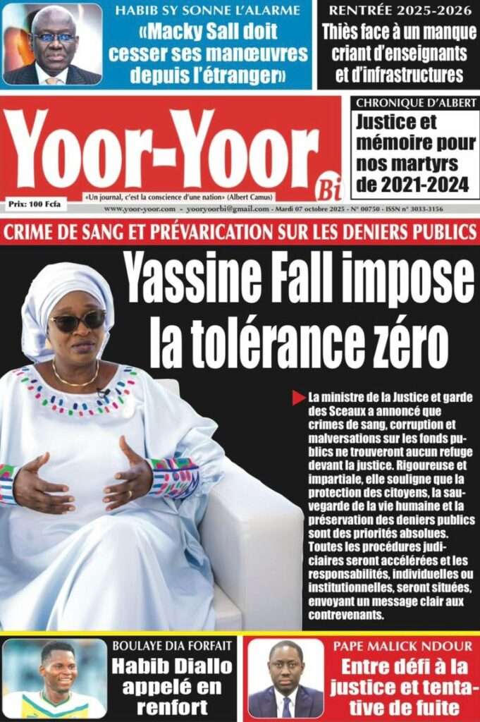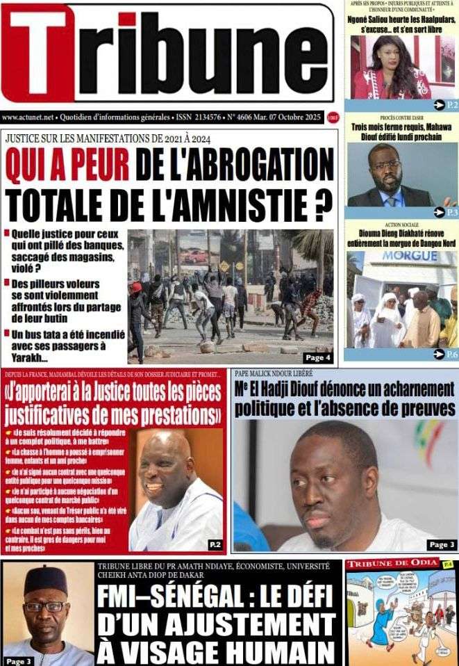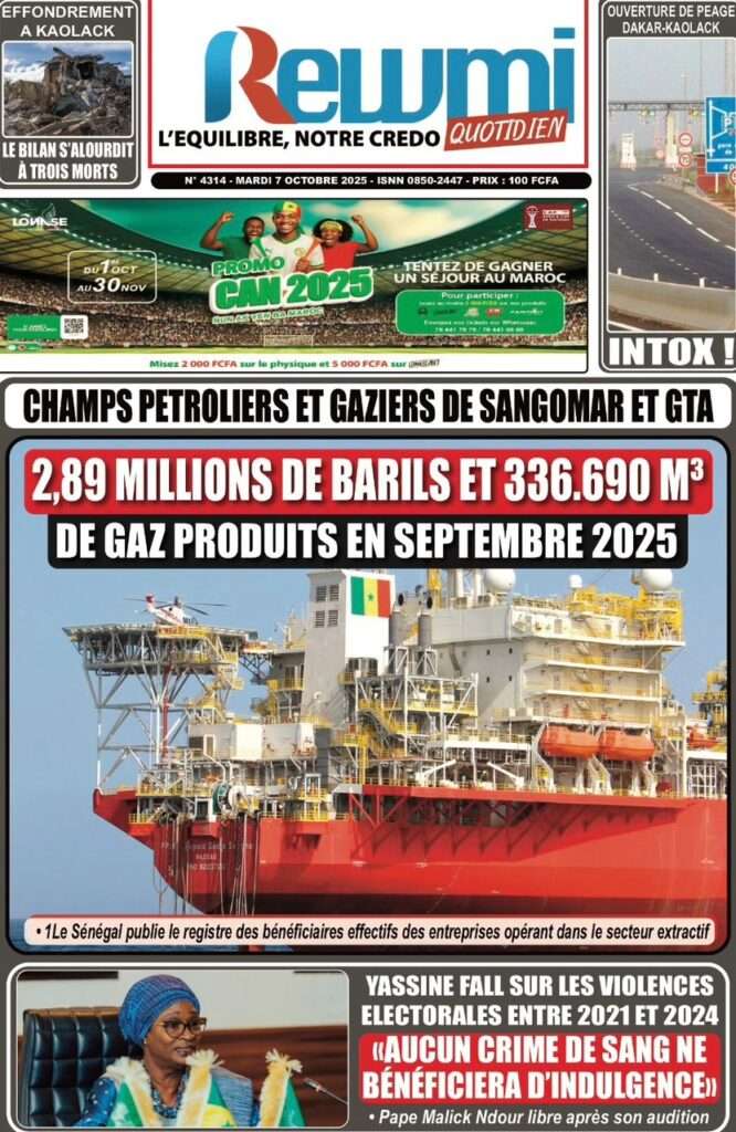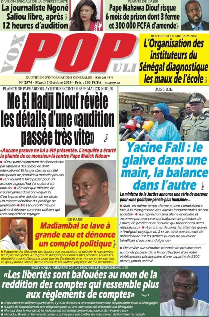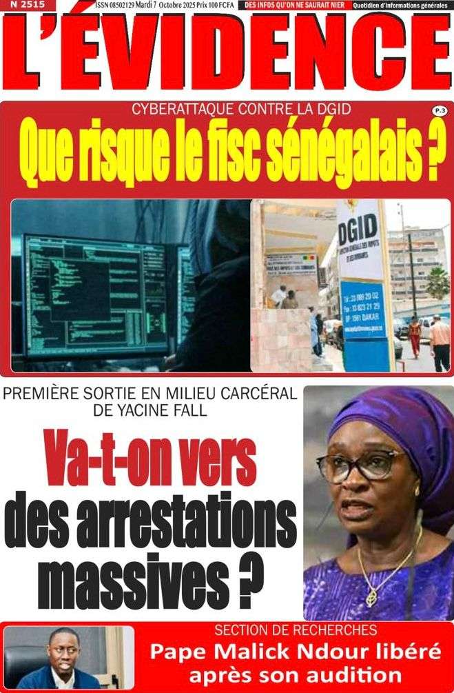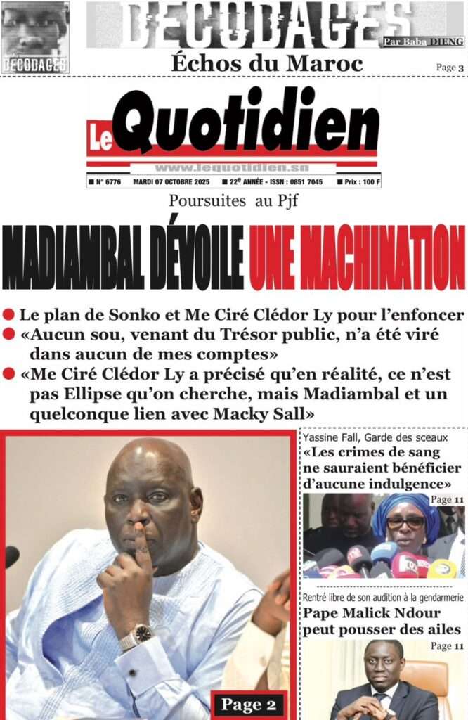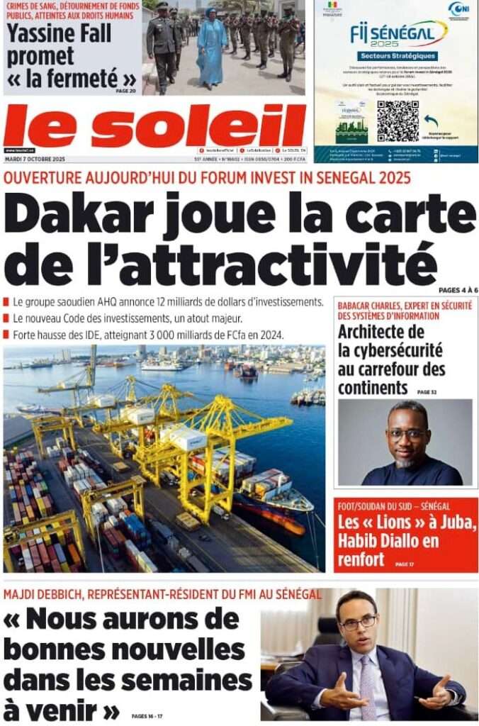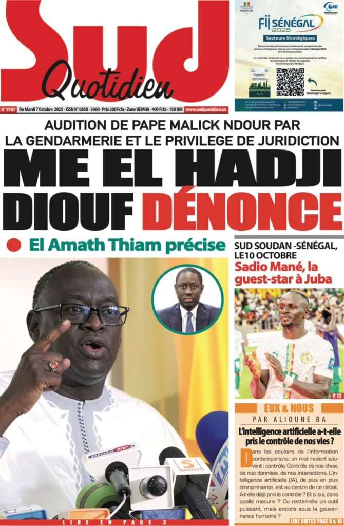 A la Une Actualité La Une Des Quotidiens – Mardi 07 Octobre 2025 (Avec Ma Revue De Presse) Bour Sine octobre 7, 2025 0 Post navigation Previous: Le Premier ministre Sébastien Lecornu démissionne, quelques heures après la formation de son nouveau gouvernementNext: Piratage de la Direction des impôts du Sénégal : une alerte nationale sur la protection de nos actifs critiques More Stories A la Une Actualité Politique Ce que change la nouvelle loi électorale adoptée par les députés Bour Sine avril 28, 2026 0 A la Une Actualité Politique « Ensemble, nous sommes une force »Par Hamidou Thiaw, Président du MPR Bour Sine avril 28, 2026 0 A la Une Actualité Pape Malick Ndour envoyé en prison Bour Sine avril 28, 2026 0 Laisser un commentaire Annuler la réponseVotre adresse e-mail ne sera pas publiée. Les champs obligatoires sont indiqués avec *Commentaire * Nom * E-mail * Site web Enregistrer mon nom, mon e-mail et mon site dans le navigateur pour mon prochain commentaire.