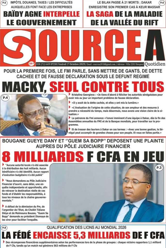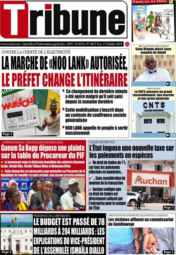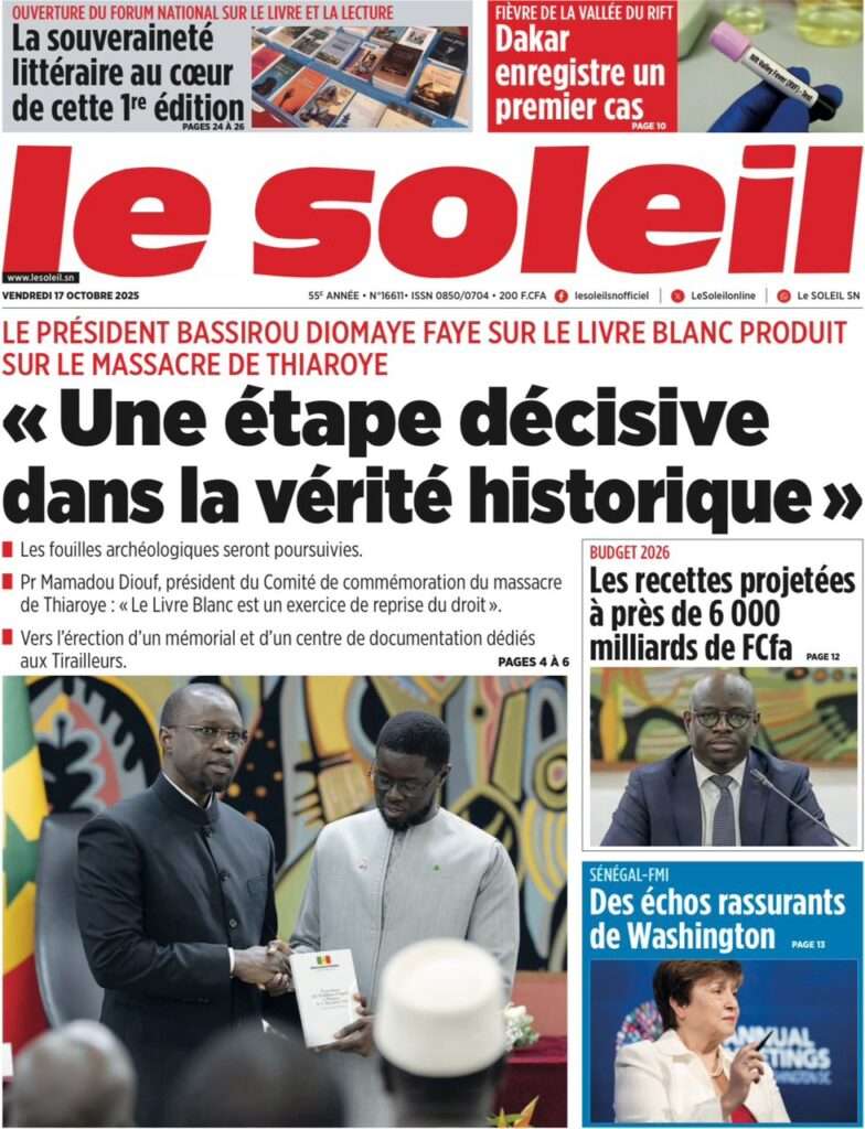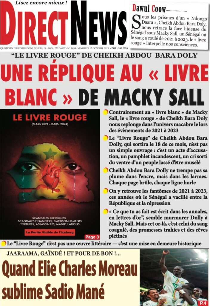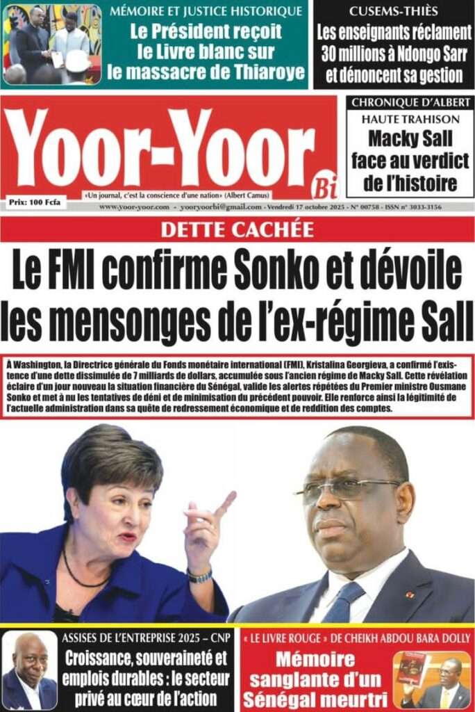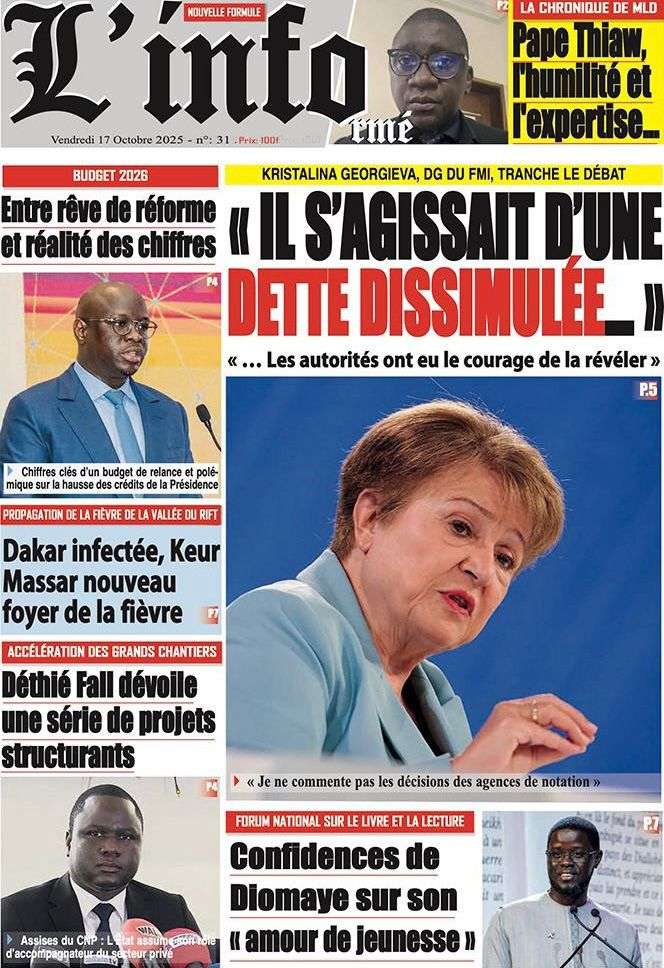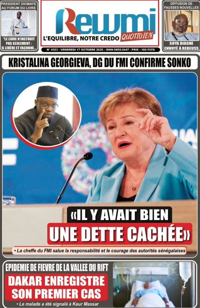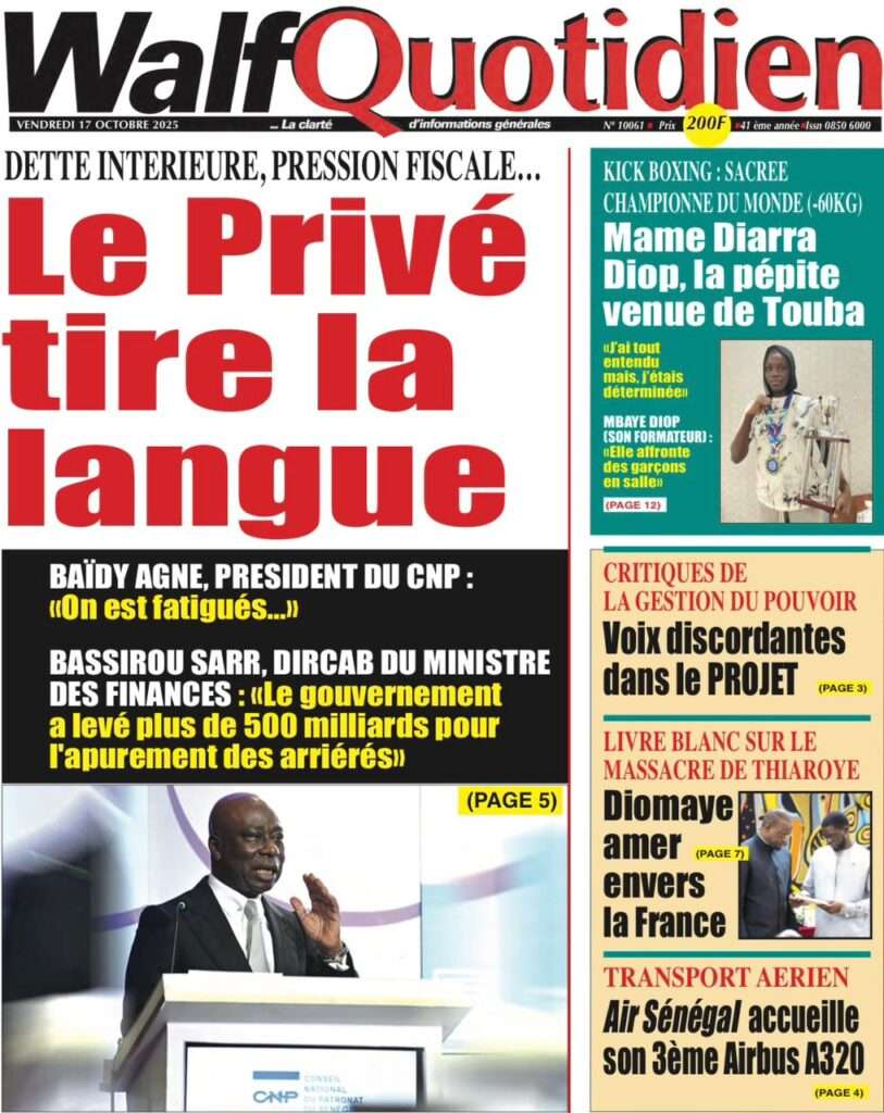 Uncategorized La Une Des Quotidiens – Vendredi 31 Octobre 2025 (Avec Ma Revue De Presse) Bour Sine octobre 17, 2025 0 Post navigation Previous: LFI 2026 : les recettes projetées à 6 188,8 milliards ; budget de la Présidence presque triplé, celui de la Primature grimpeNext: « Il y avait une dette cachée et ils l’ont mise en lumière », dixit la directrice du FMI qui salue la démarche du régime More Stories Uncategorized FADP : Le CDPS dénonce vigoureusement la répartition et saisit l’ONAC Bour Sine avril 10, 2026 0 Uncategorized Sa Thiès bat Modou LÔ et devient le 8e Roi des Arènes de l’histoire Bour Sine avril 5, 2026 0 Uncategorized Durcissement des sanctions contre l’homosexualité : la loi promulguée par le président Diomaye Bour Sine mars 31, 2026 0 Laisser un commentaire Annuler la réponseVotre adresse e-mail ne sera pas publiée. Les champs obligatoires sont indiqués avec *Commentaire * Nom * E-mail * Site web Enregistrer mon nom, mon e-mail et mon site dans le navigateur pour mon prochain commentaire.