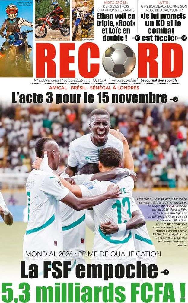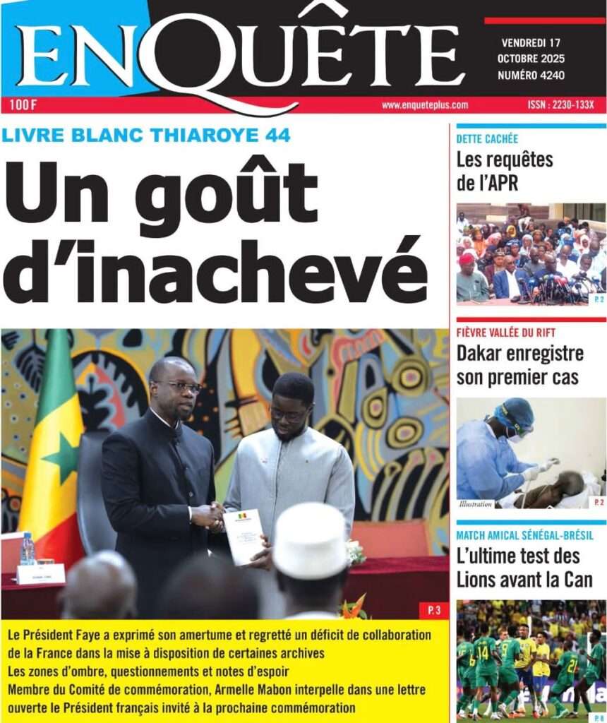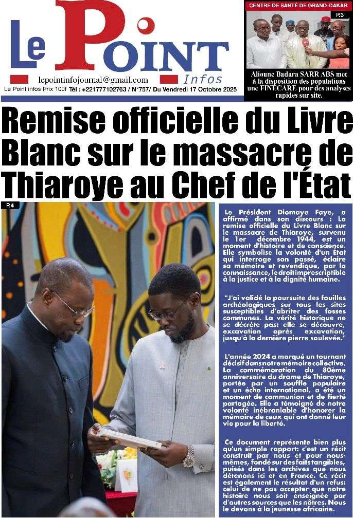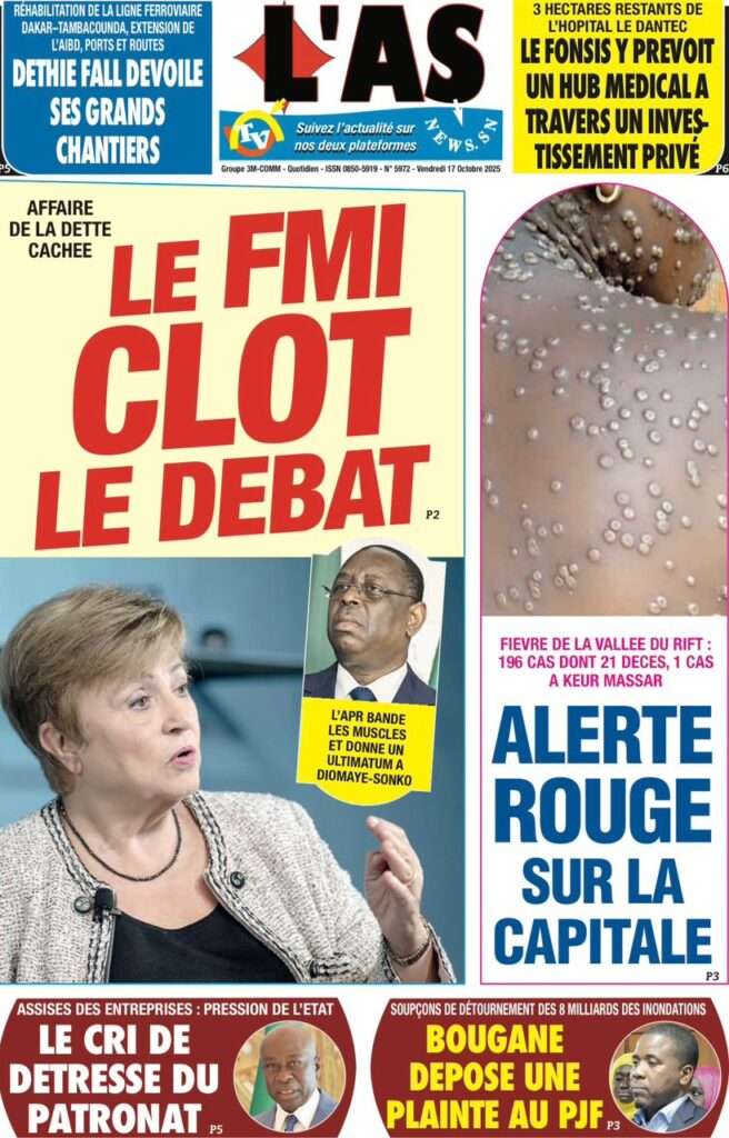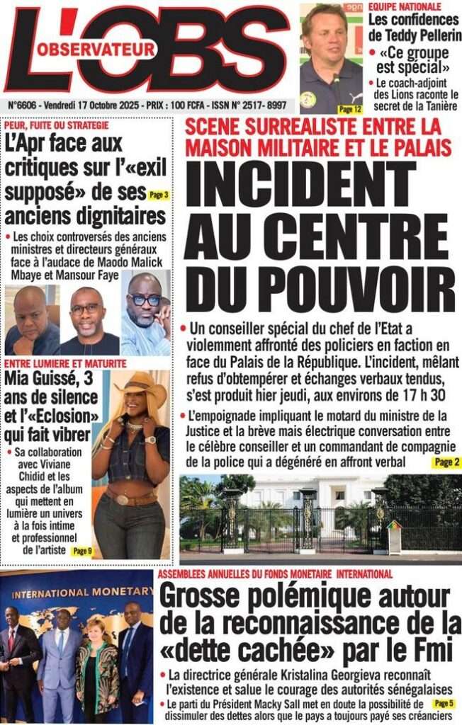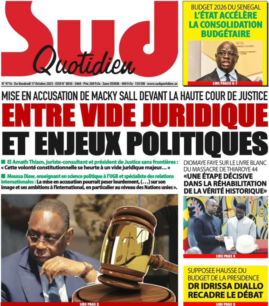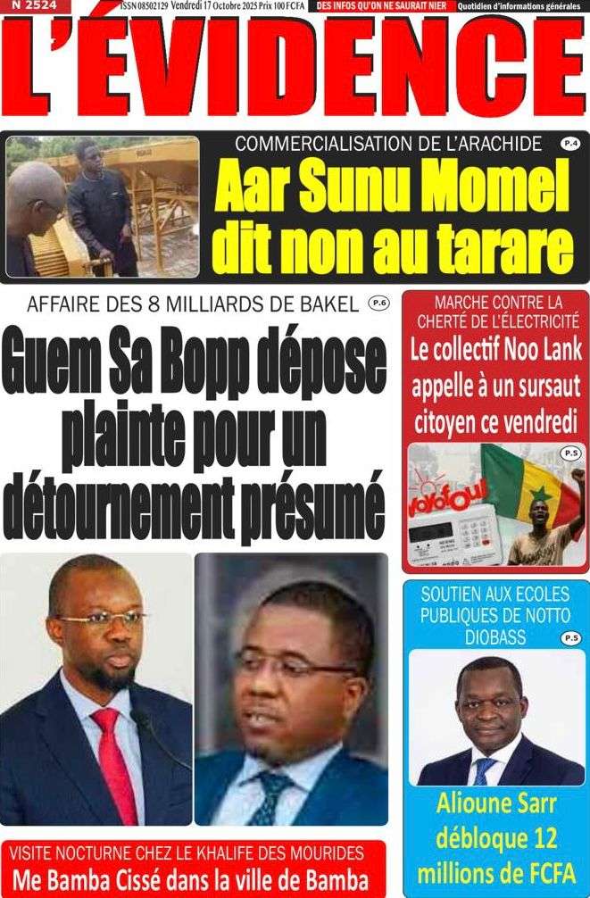Uncategorized La Une Des Quotidiens – Vendredi 31 Octobre 2025 (Avec Ma Revue De Presse) Bour Sine octobre 17, 2025 0 Post navigation Previous: LFI 2026 : les recettes projetées à 6 188,8 milliards ; budget de la Présidence presque triplé, celui de la Primature grimpeNext: « Il y avait une dette cachée et ils l’ont mise en lumière », dixit la directrice du FMI qui salue la démarche du régime More Stories Uncategorized FADP : Le CDPS dénonce vigoureusement la répartition et saisit l’ONAC Bour Sine avril 10, 2026 0 Uncategorized Sa Thiès bat Modou LÔ et devient le 8e Roi des Arènes de l’histoire Bour Sine avril 5, 2026 0 Uncategorized Durcissement des sanctions contre l’homosexualité : la loi promulguée par le président Diomaye Bour Sine mars 31, 2026 0 Laisser un commentaire Annuler la réponseVotre adresse e-mail ne sera pas publiée. Les champs obligatoires sont indiqués avec *Commentaire * Nom * E-mail * Site web Enregistrer mon nom, mon e-mail et mon site dans le navigateur pour mon prochain commentaire.