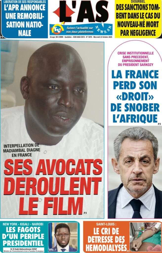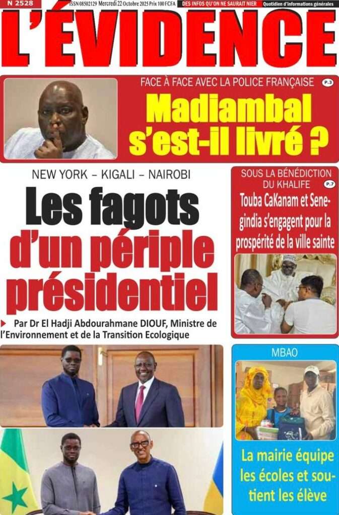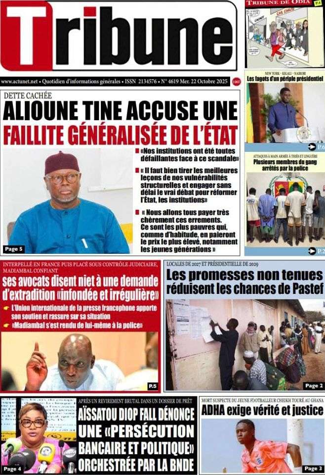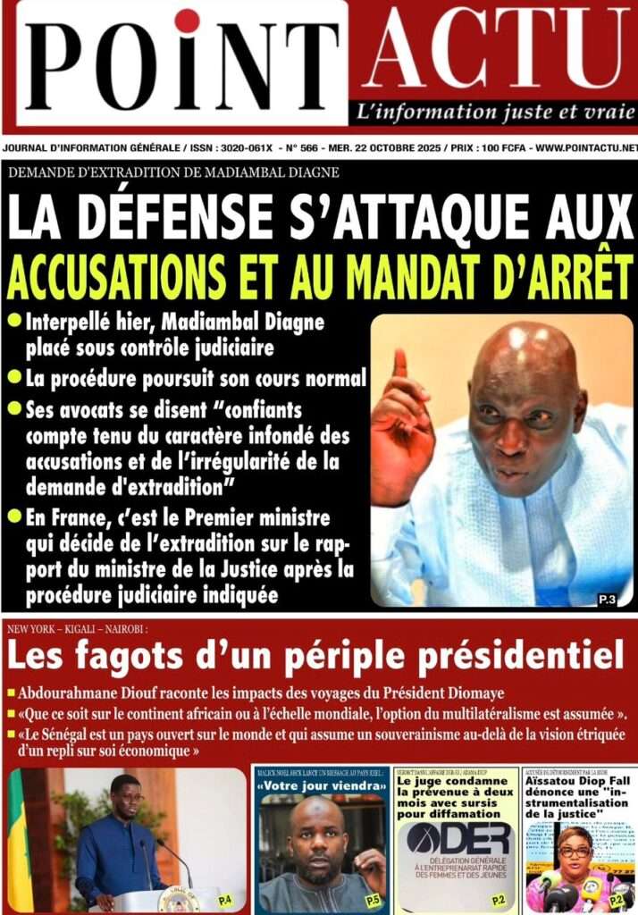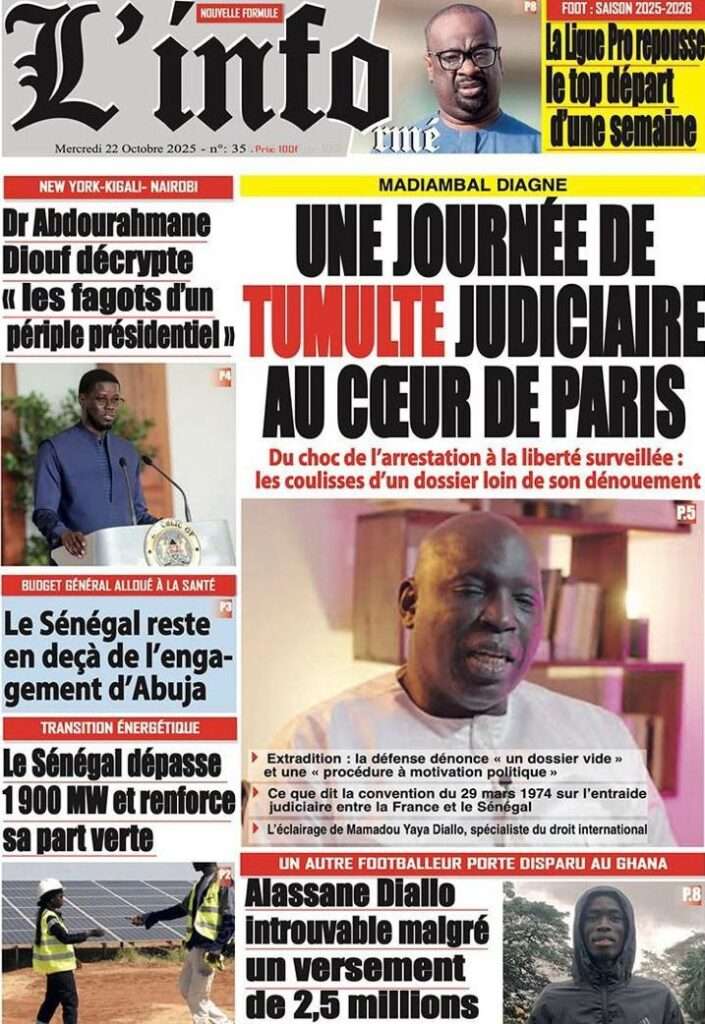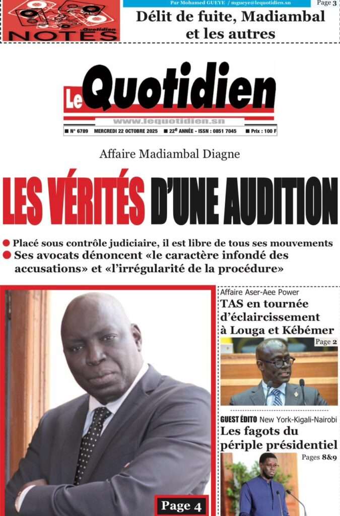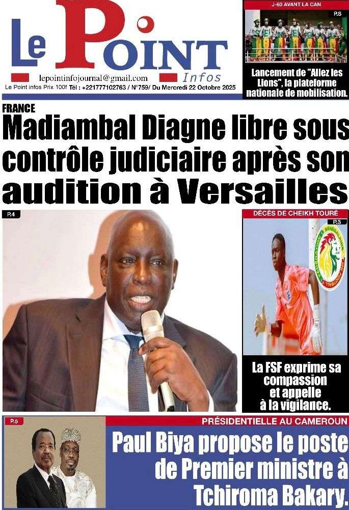 A la Une Actualité La Une Des Quotidiens – Mercredi 22 Octobre 2025 (Avec Ma Revue De Presse) Bour Sine octobre 22, 2025 0 Post navigation Previous: Paris : Madiambal libéré sous contrôle judiciaire suite à son interpellationNext: La Une Des Quotidiens – Jeudi 23 Octobre 2025 (Avec Ma Revue De Presse) More Stories A la Une Actualité Politique Ce que change la nouvelle loi électorale adoptée par les députés Bour Sine avril 28, 2026 0 A la Une Actualité Politique « Ensemble, nous sommes une force »Par Hamidou Thiaw, Président du MPR Bour Sine avril 28, 2026 0 A la Une Actualité Pape Malick Ndour envoyé en prison Bour Sine avril 28, 2026 0 Laisser un commentaire Annuler la réponseVotre adresse e-mail ne sera pas publiée. Les champs obligatoires sont indiqués avec *Commentaire * Nom * E-mail * Site web Enregistrer mon nom, mon e-mail et mon site dans le navigateur pour mon prochain commentaire.