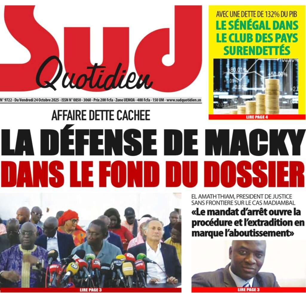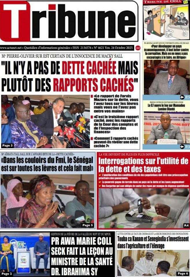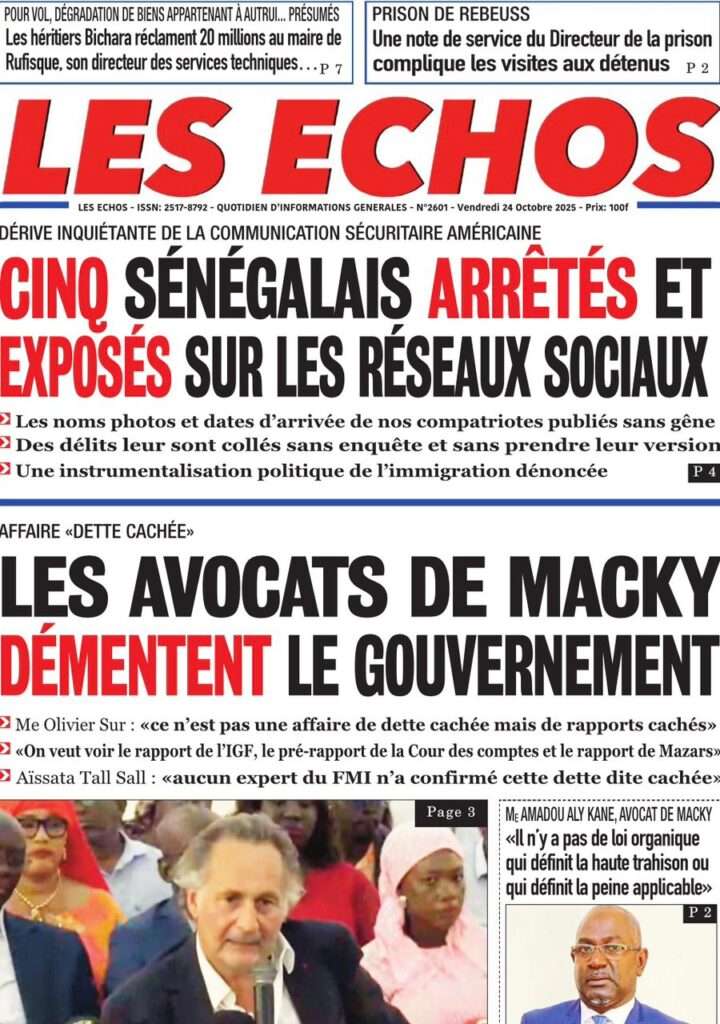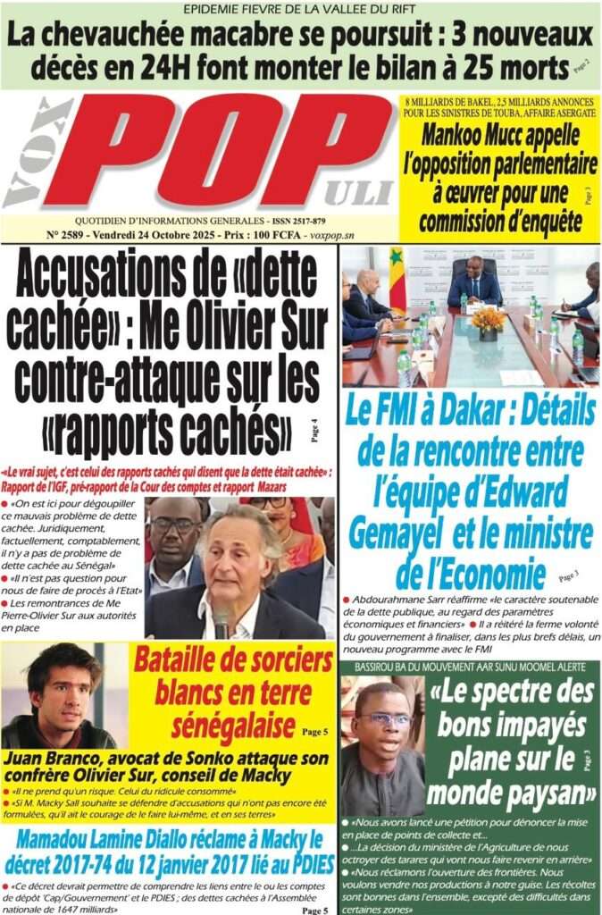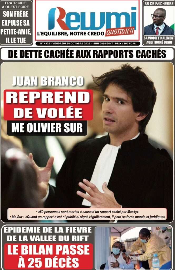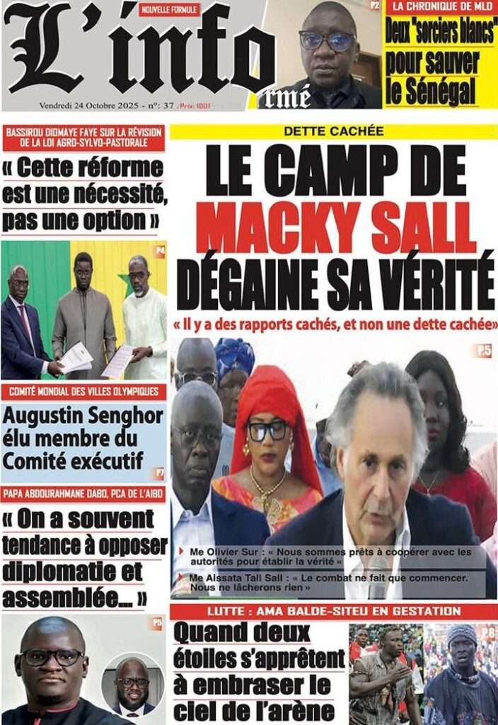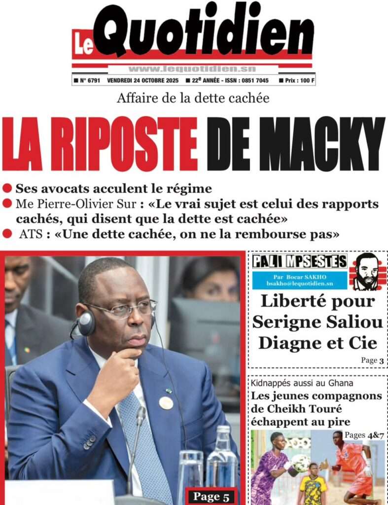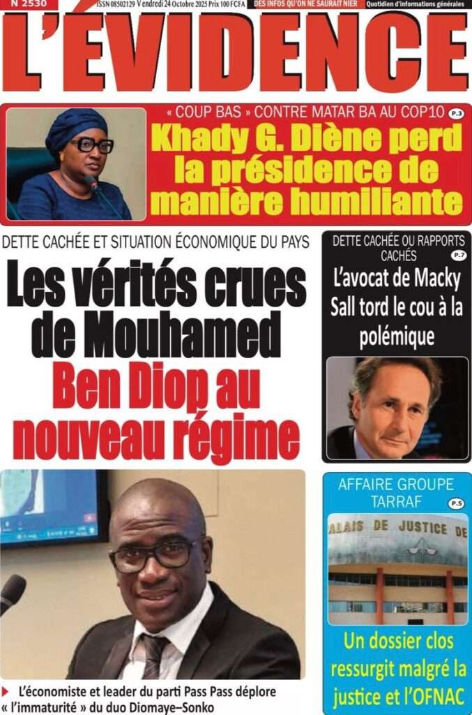 A la Une Actualité La Une Des Quotidiens – Jeudi 23 Octobre 2025 (Avec Ma Revue De Presse) Bour Sine octobre 24, 2025 0 Post navigation Previous: La Une Des Quotidiens – Mercredi 22 Octobre 2025 (Avec Ma Revue De Presse)Next: Dette réévaluée à 130%, Diomaye exige la maîtrise des prix, Plainte de Bougane et Cie… More Stories A la Une Actualité Politique Ce que change la nouvelle loi électorale adoptée par les députés Bour Sine avril 28, 2026 0 A la Une Actualité Politique « Ensemble, nous sommes une force »Par Hamidou Thiaw, Président du MPR Bour Sine avril 28, 2026 0 A la Une Actualité Pape Malick Ndour envoyé en prison Bour Sine avril 28, 2026 0 Laisser un commentaire Annuler la réponseVotre adresse e-mail ne sera pas publiée. Les champs obligatoires sont indiqués avec *Commentaire * Nom * E-mail * Site web Enregistrer mon nom, mon e-mail et mon site dans le navigateur pour mon prochain commentaire.