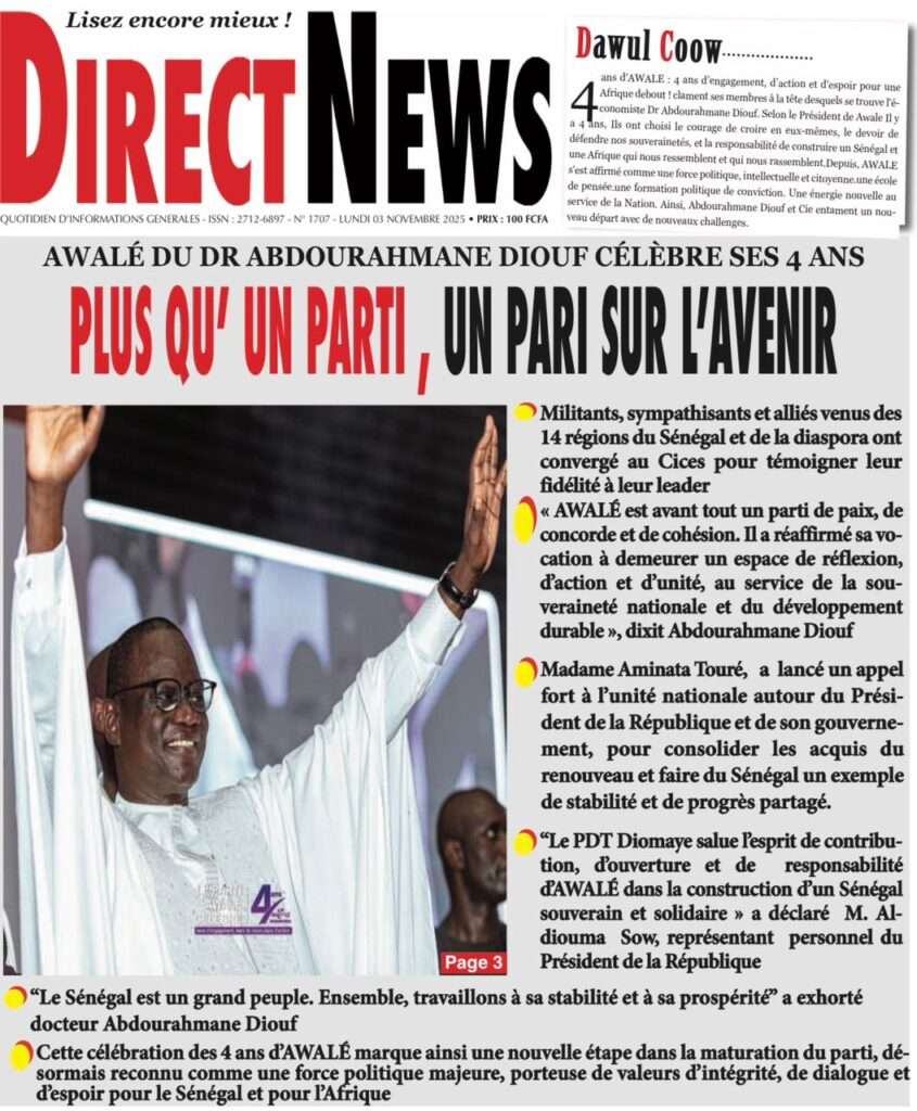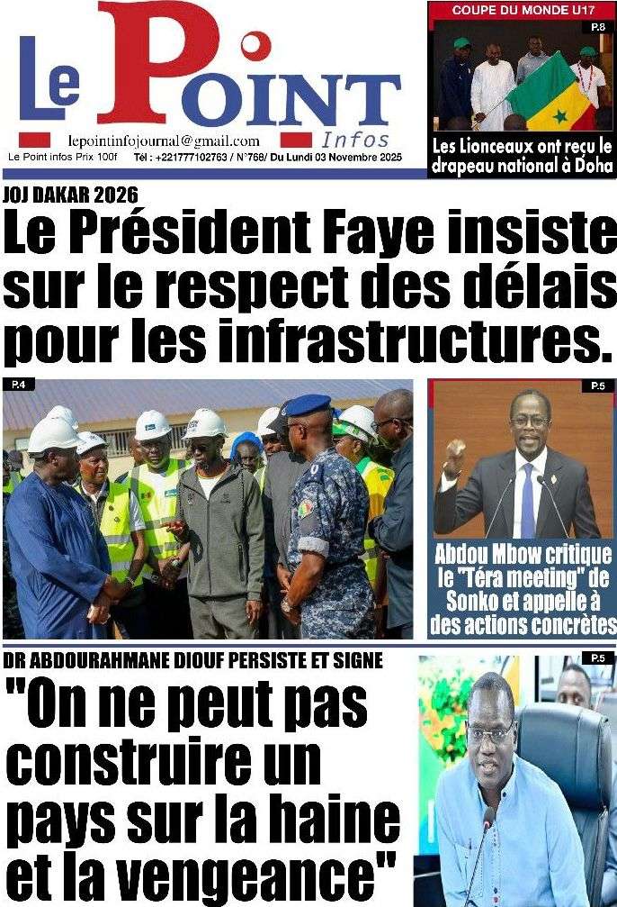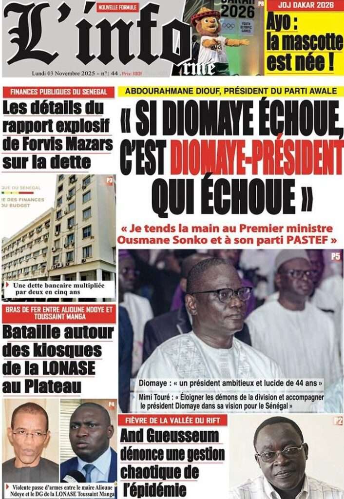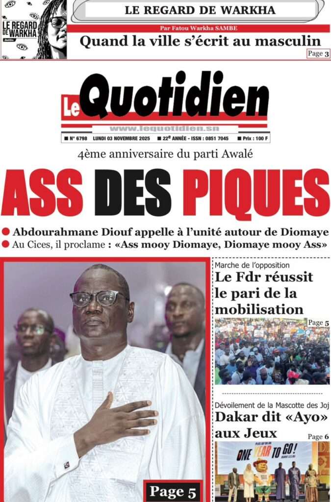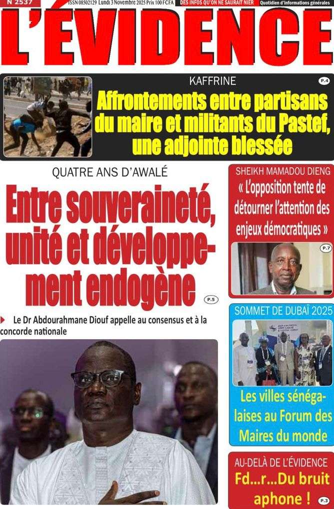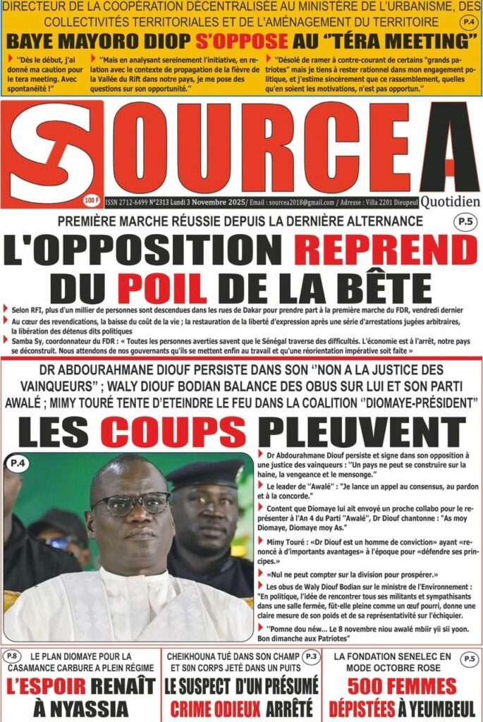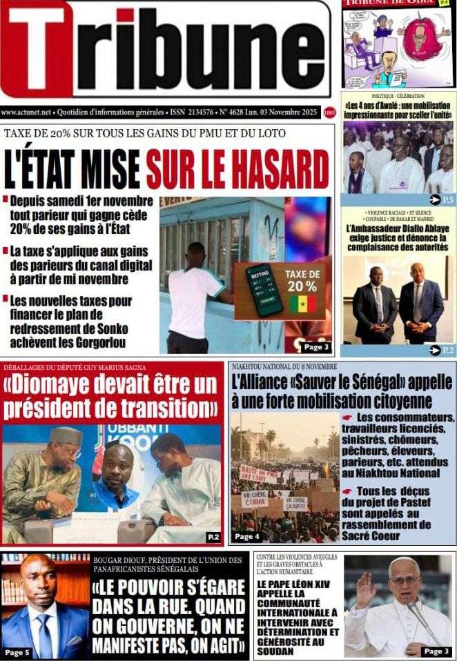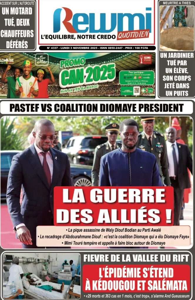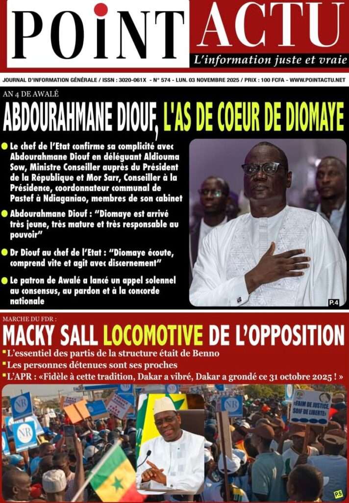 A la Une Actualité La Une Des Quotidiens – Lundi 03 Novembre 2025 (Avec Ma Revue De Presse) Bour Sine novembre 3, 2025 0 Post navigation Previous: XEW-XEWU DIAMONO : Exploitation du pétrole et contenu local, l’affaire Madiambal et ses rebondissements, FDR dans la rue…Next: Fonds d’appui à la presse : l’État annonce une bonne nouvelle aux médias More Stories A la Une Actualité La Une Des Quotidiens – Mercredi 29 Avril 2026 (Avec Ma Revue De Presse) Bour Sine avril 29, 2026 0 A la Une Actualité Politique Ce que change la nouvelle loi électorale adoptée par les députés Bour Sine avril 28, 2026 0 A la Une Actualité Politique « Ensemble, nous sommes une force »Par Hamidou Thiaw, Président du MPR Bour Sine avril 28, 2026 0 Laisser un commentaire Annuler la réponseVotre adresse e-mail ne sera pas publiée. Les champs obligatoires sont indiqués avec *Commentaire * Nom * E-mail * Site web Enregistrer mon nom, mon e-mail et mon site dans le navigateur pour mon prochain commentaire.