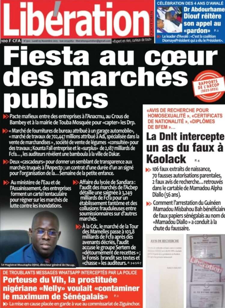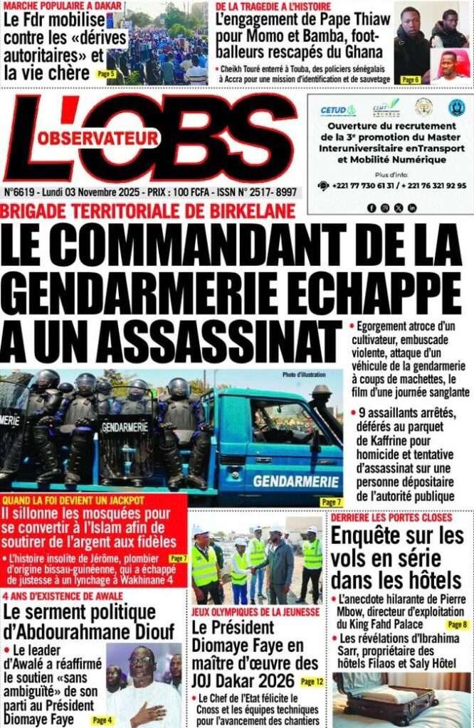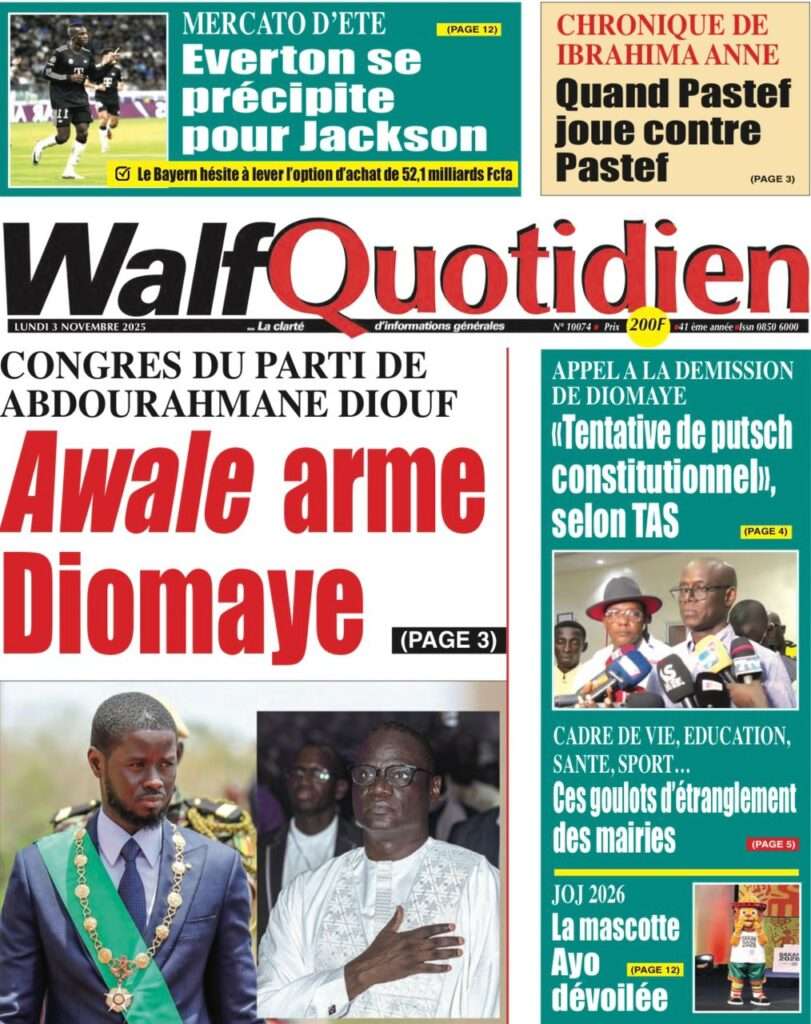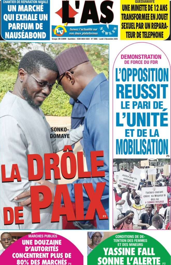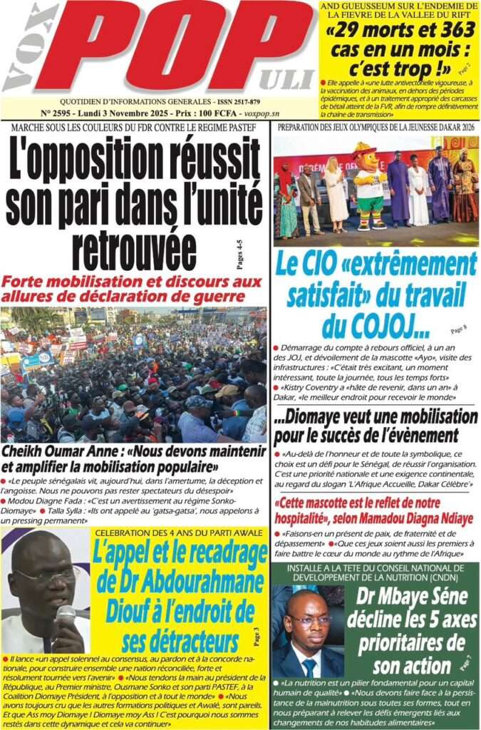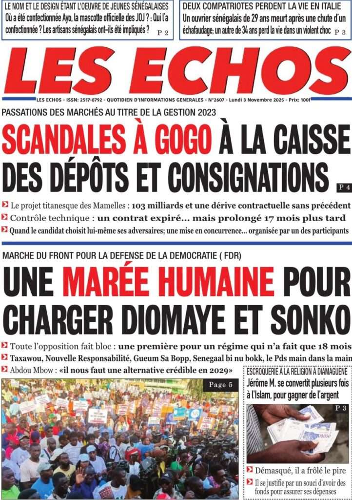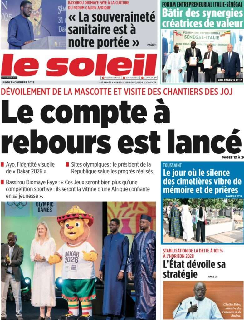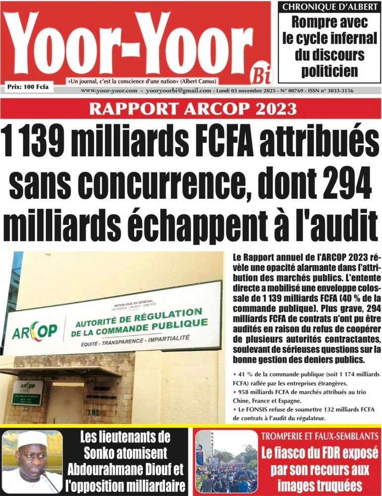 A la Une Actualité La Une Des Quotidiens – Lundi 03 Novembre 2025 (Avec Ma Revue De Presse) Bour Sine novembre 3, 2025 0 Post navigation Previous: XEW-XEWU DIAMONO : Exploitation du pétrole et contenu local, l’affaire Madiambal et ses rebondissements, FDR dans la rue…Next: Fonds d’appui à la presse : l’État annonce une bonne nouvelle aux médias More Stories A la Une Actualité La Une Des Quotidiens – Mercredi 29 Avril 2026 (Avec Ma Revue De Presse) Bour Sine avril 29, 2026 0 A la Une Actualité Politique Ce que change la nouvelle loi électorale adoptée par les députés Bour Sine avril 28, 2026 0 A la Une Actualité Politique « Ensemble, nous sommes une force »Par Hamidou Thiaw, Président du MPR Bour Sine avril 28, 2026 0 Laisser un commentaire Annuler la réponseVotre adresse e-mail ne sera pas publiée. Les champs obligatoires sont indiqués avec *Commentaire * Nom * E-mail * Site web Enregistrer mon nom, mon e-mail et mon site dans le navigateur pour mon prochain commentaire.