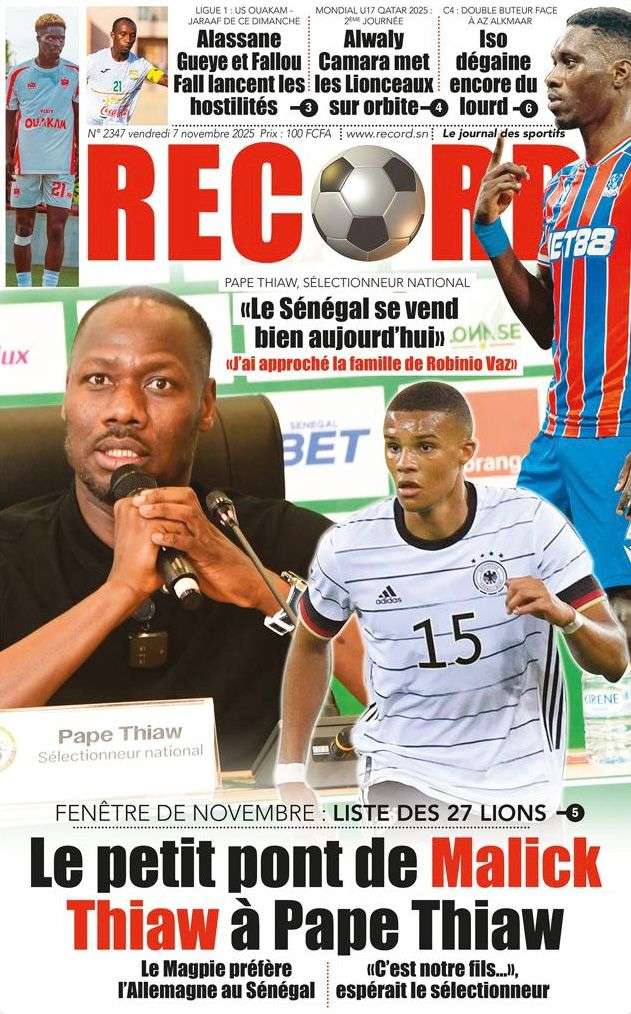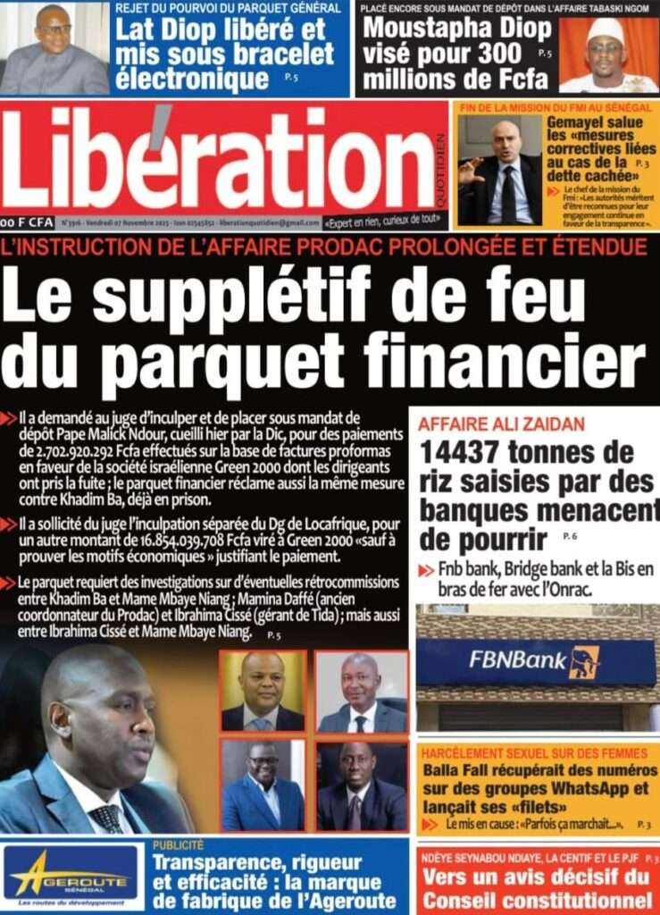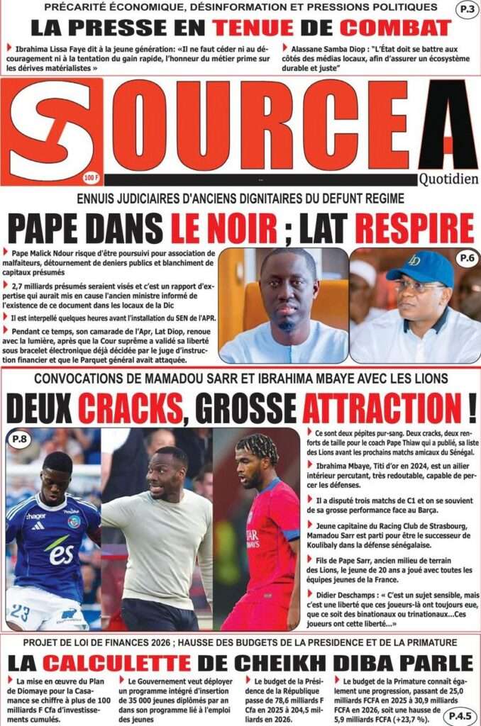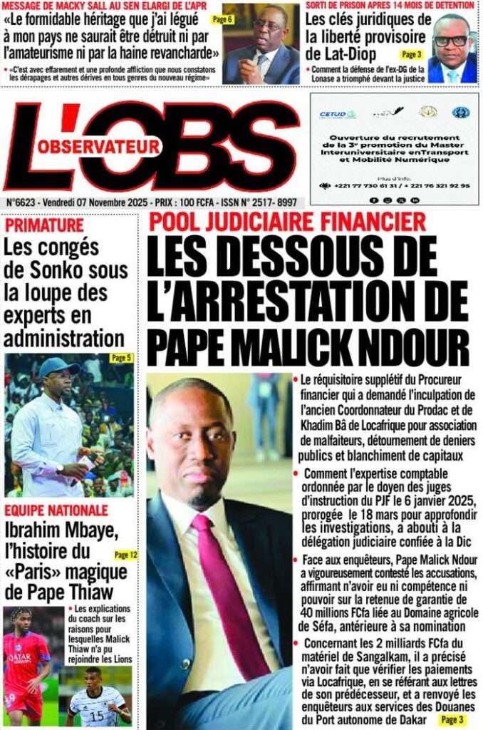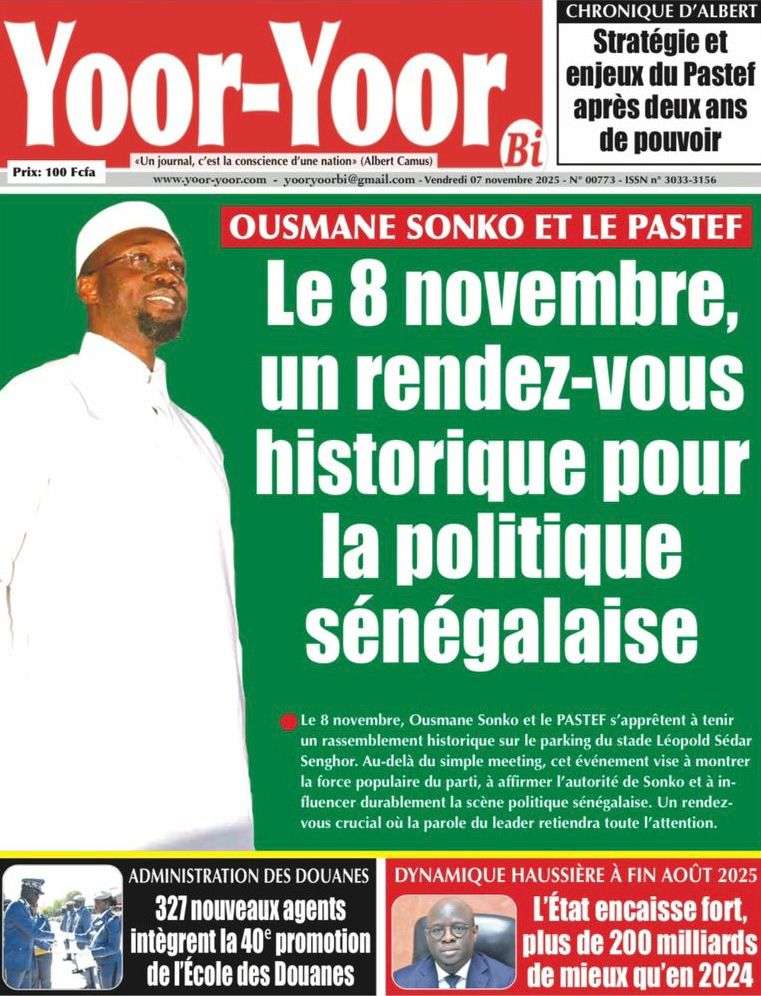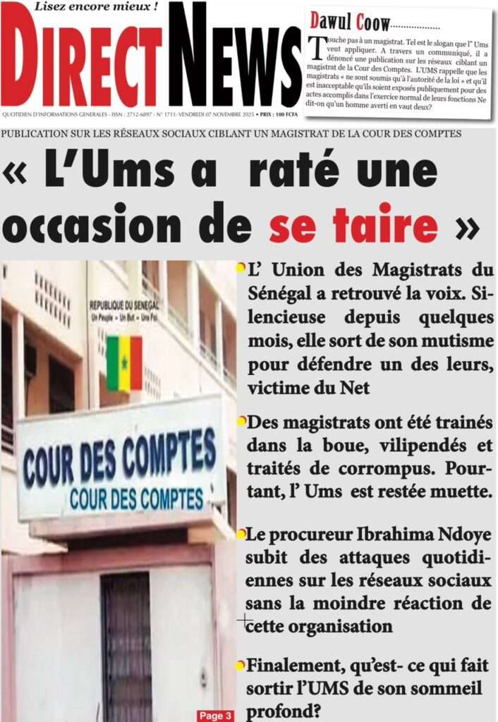 A la Une Actualité La Une Des Quotidiens – Vendredi 07 Novembre 2025 (Avec Ma Revue De Presse) Bour Sine novembre 7, 2025 0 Post navigation Previous: Pape Malick Ndour arrêté par des éléments de la DICNext: Sous-évaluation de la dette : quand le jeu politique prend le pas sur la vérité technique More Stories A la Une Actualité Politique Ce que change la nouvelle loi électorale adoptée par les députés Bour Sine avril 28, 2026 0 A la Une Actualité Politique « Ensemble, nous sommes une force »Par Hamidou Thiaw, Président du MPR Bour Sine avril 28, 2026 0 A la Une Actualité Pape Malick Ndour envoyé en prison Bour Sine avril 28, 2026 0 Laisser un commentaire Annuler la réponseVotre adresse e-mail ne sera pas publiée. Les champs obligatoires sont indiqués avec *Commentaire * Nom * E-mail * Site web Enregistrer mon nom, mon e-mail et mon site dans le navigateur pour mon prochain commentaire.