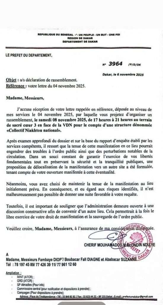 Le préfet de Dakar s’oppose à tenue du rassemblement prévu par le « Collectif Niakhtou national » ce samedi 8 novembre 2025, de 17 heures à 21 heures, au terrain de Sacré-Cœur 3, en face de la VDN.