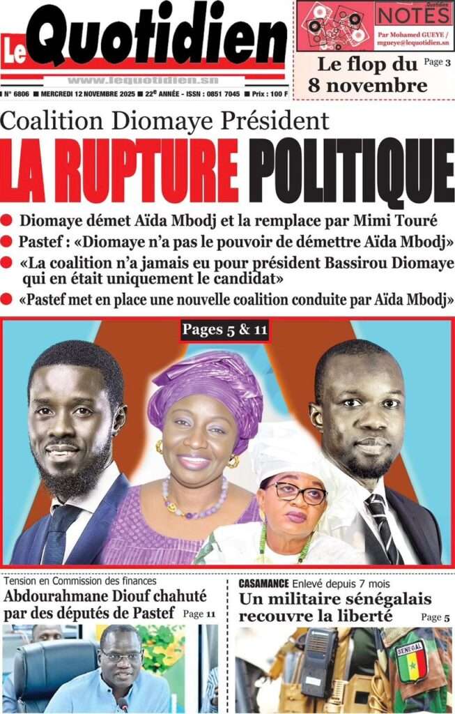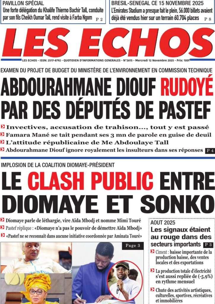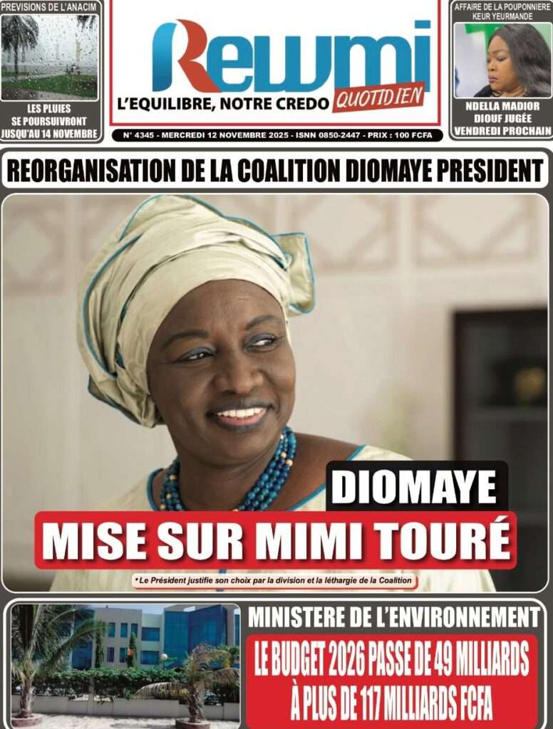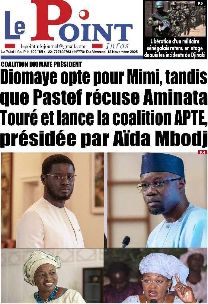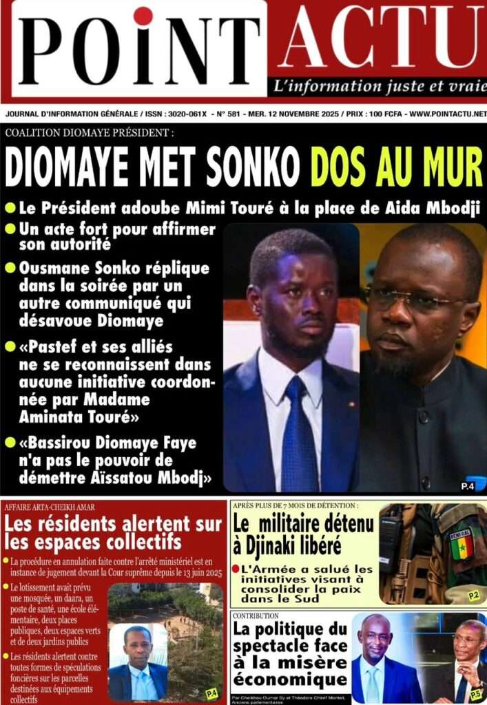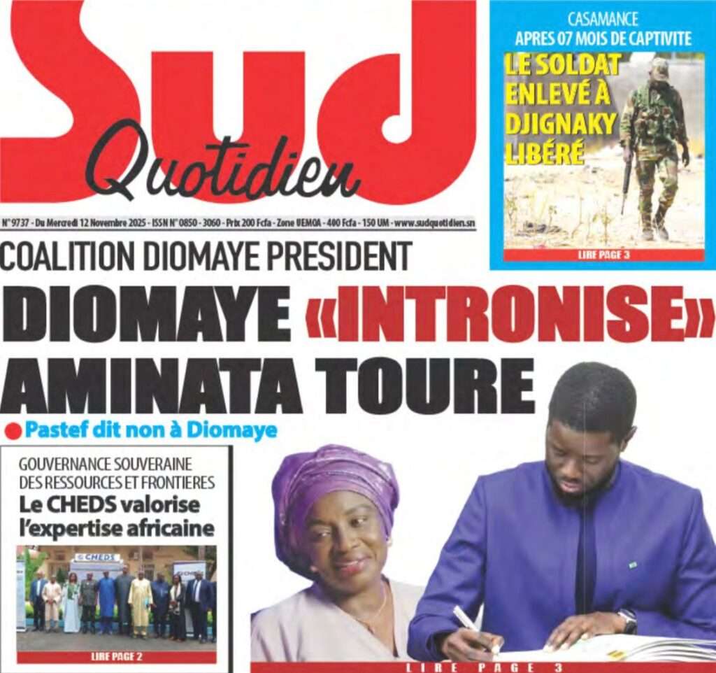 A la Une Actualité Politique La Une Des Quotidiens – Mardi 12 Novembre 2025 (Avec Ma Revue De Presse) Bour Sine novembre 12, 2025 0 Post navigation Previous: Coalition Diomaye Président : Aïda Mbodji remerciée, Mimi Touré pour la remplacerNext: Pastef récuse Mimi Touré et annonce une coalition en cours dont la présidence est confiée à Aïda Mbodji More Stories A la Une Actualité Politique Ce que change la nouvelle loi électorale adoptée par les députés Bour Sine avril 28, 2026 0 A la Une Actualité Politique « Ensemble, nous sommes une force »Par Hamidou Thiaw, Président du MPR Bour Sine avril 28, 2026 0 A la Une Actualité Pape Malick Ndour envoyé en prison Bour Sine avril 28, 2026 0 Laisser un commentaire Annuler la réponseVotre adresse e-mail ne sera pas publiée. Les champs obligatoires sont indiqués avec *Commentaire * Nom * E-mail * Site web Enregistrer mon nom, mon e-mail et mon site dans le navigateur pour mon prochain commentaire.