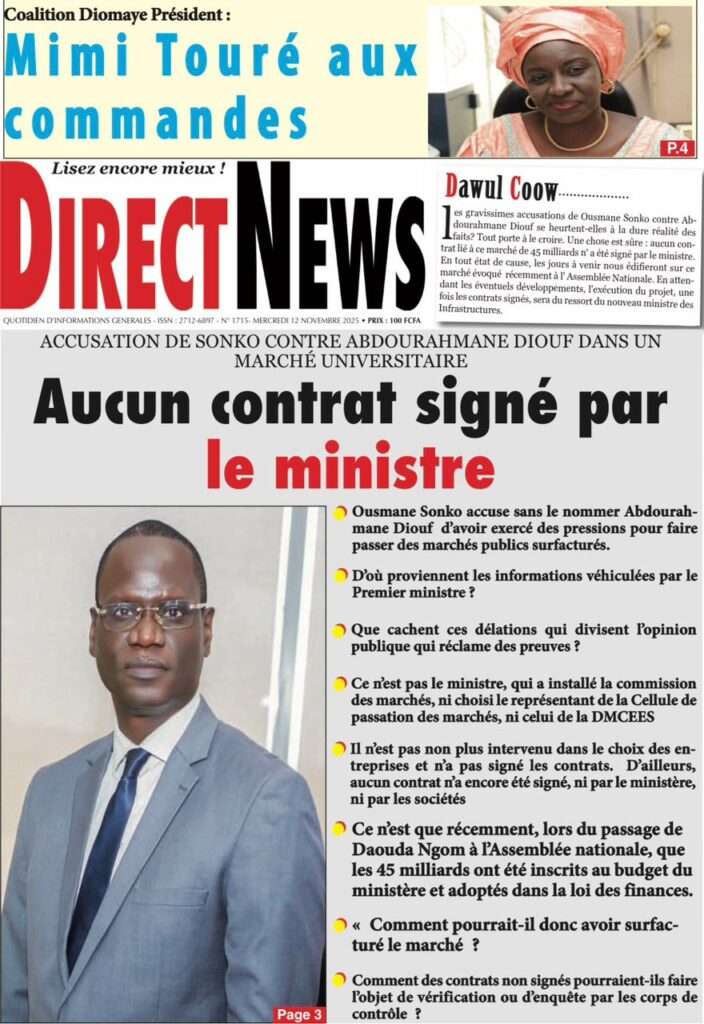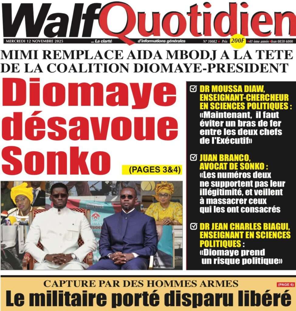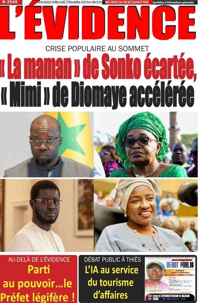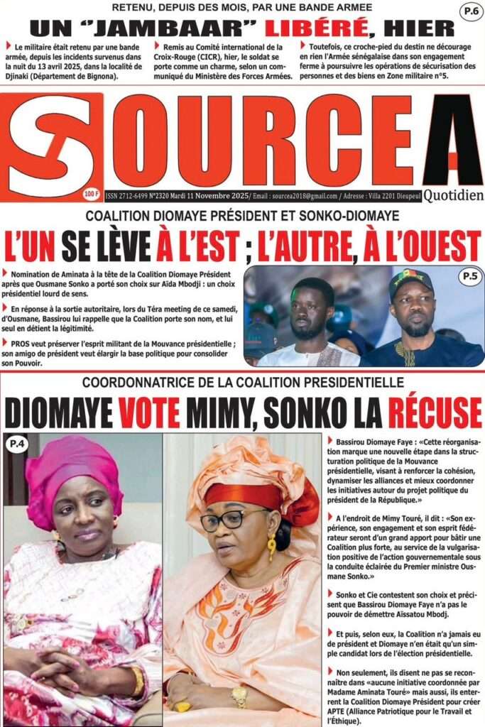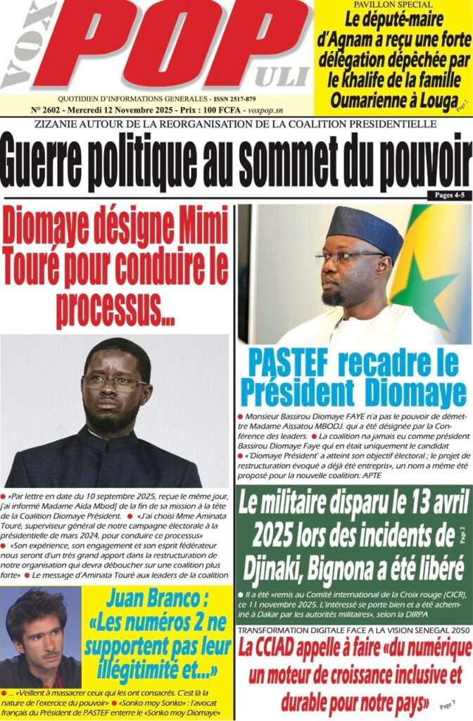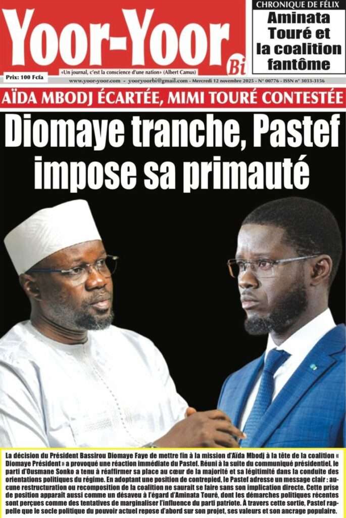 A la Une Actualité Politique La Une Des Quotidiens – Mardi 12 Novembre 2025 (Avec Ma Revue De Presse) Bour Sine novembre 12, 2025 0 Post navigation Previous: Coalition Diomaye Président : Aïda Mbodji remerciée, Mimi Touré pour la remplacerNext: Pastef récuse Mimi Touré et annonce une coalition en cours dont la présidence est confiée à Aïda Mbodji More Stories A la Une Actualité Politique Ce que change la nouvelle loi électorale adoptée par les députés Bour Sine avril 28, 2026 0 A la Une Actualité Politique « Ensemble, nous sommes une force »Par Hamidou Thiaw, Président du MPR Bour Sine avril 28, 2026 0 A la Une Actualité Pape Malick Ndour envoyé en prison Bour Sine avril 28, 2026 0 Laisser un commentaire Annuler la réponseVotre adresse e-mail ne sera pas publiée. Les champs obligatoires sont indiqués avec *Commentaire * Nom * E-mail * Site web Enregistrer mon nom, mon e-mail et mon site dans le navigateur pour mon prochain commentaire.
