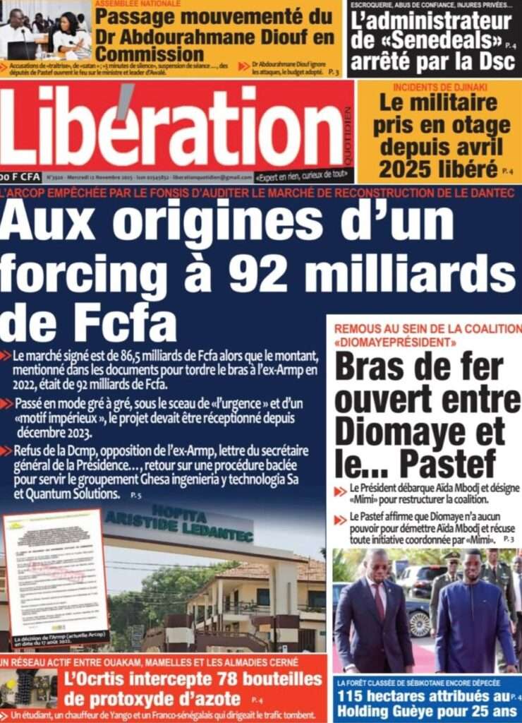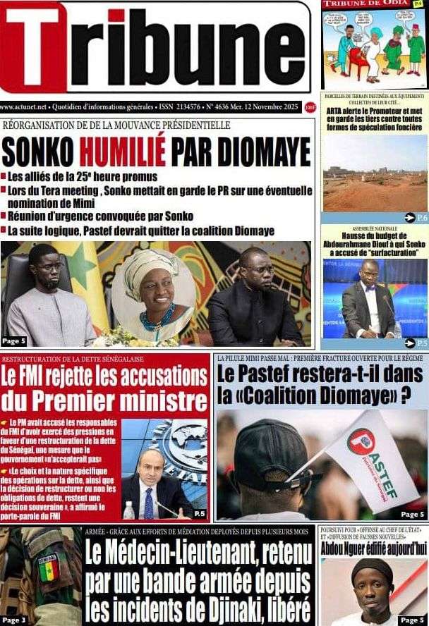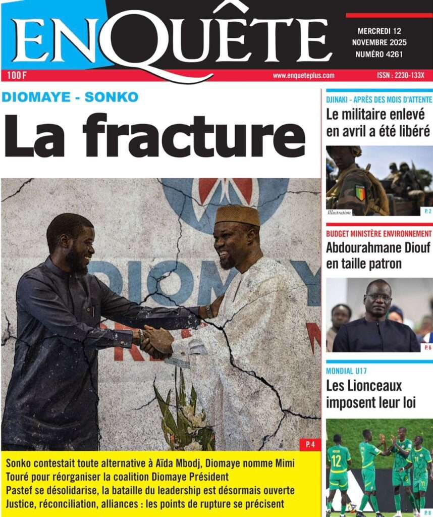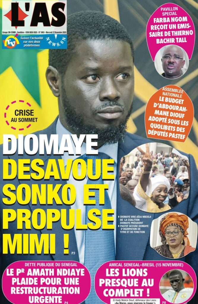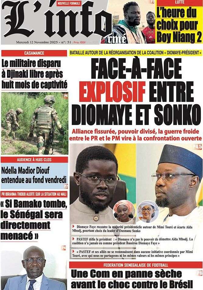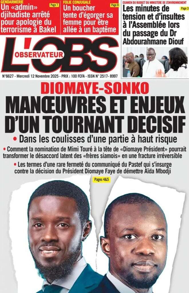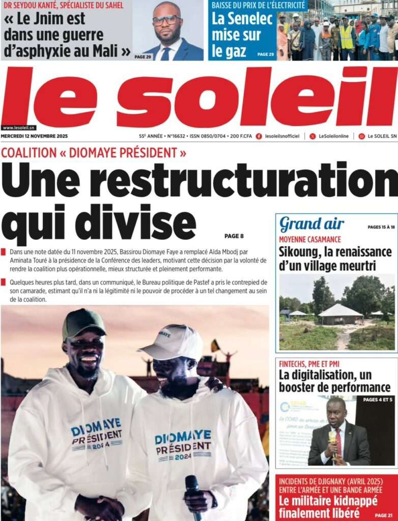 A la Une Actualité Politique La Une Des Quotidiens – Mardi 12 Novembre 2025 (Avec Ma Revue De Presse) Bour Sine novembre 12, 2025 0 Post navigation Previous: Coalition Diomaye Président : Aïda Mbodji remerciée, Mimi Touré pour la remplacerNext: Pastef récuse Mimi Touré et annonce une coalition en cours dont la présidence est confiée à Aïda Mbodji More Stories A la Une Actualité Politique Ce que change la nouvelle loi électorale adoptée par les députés Bour Sine avril 28, 2026 0 A la Une Actualité Politique « Ensemble, nous sommes une force »Par Hamidou Thiaw, Président du MPR Bour Sine avril 28, 2026 0 A la Une Actualité Pape Malick Ndour envoyé en prison Bour Sine avril 28, 2026 0 Laisser un commentaire Annuler la réponseVotre adresse e-mail ne sera pas publiée. Les champs obligatoires sont indiqués avec *Commentaire * Nom * E-mail * Site web Enregistrer mon nom, mon e-mail et mon site dans le navigateur pour mon prochain commentaire.