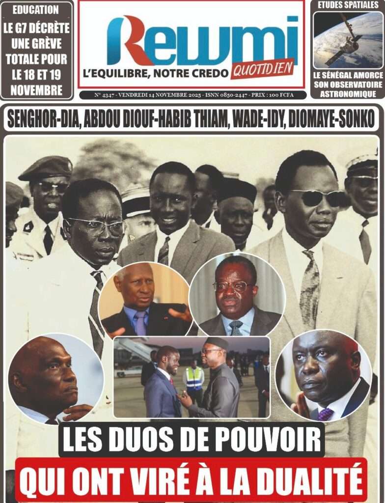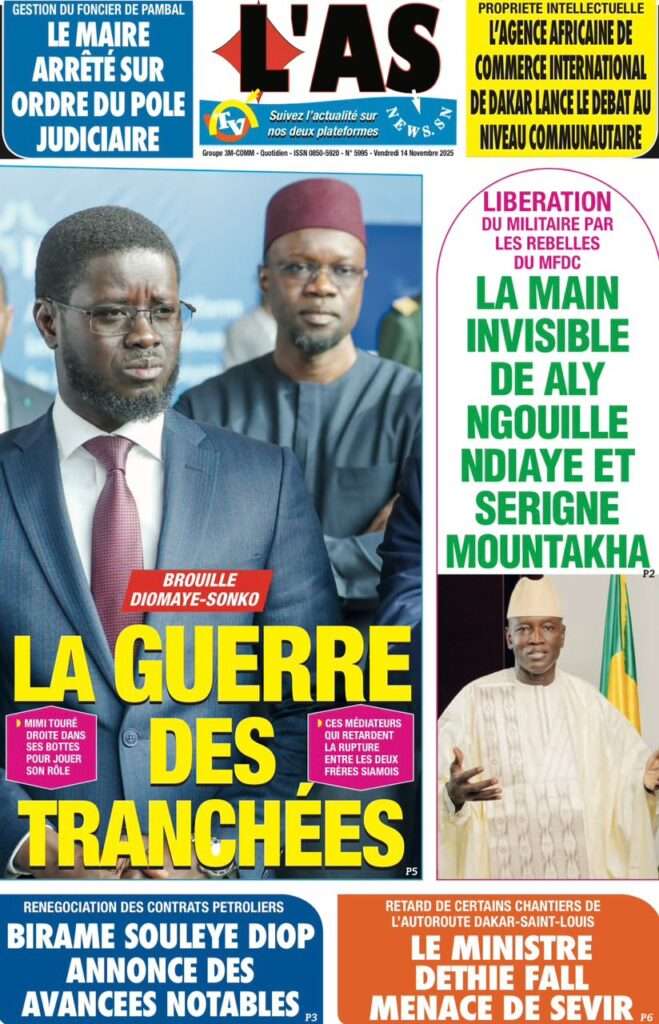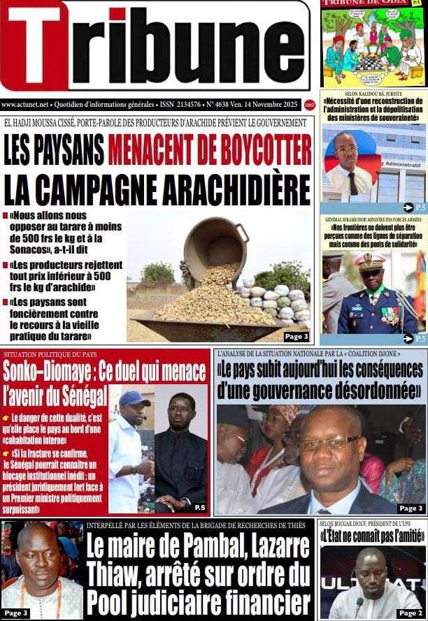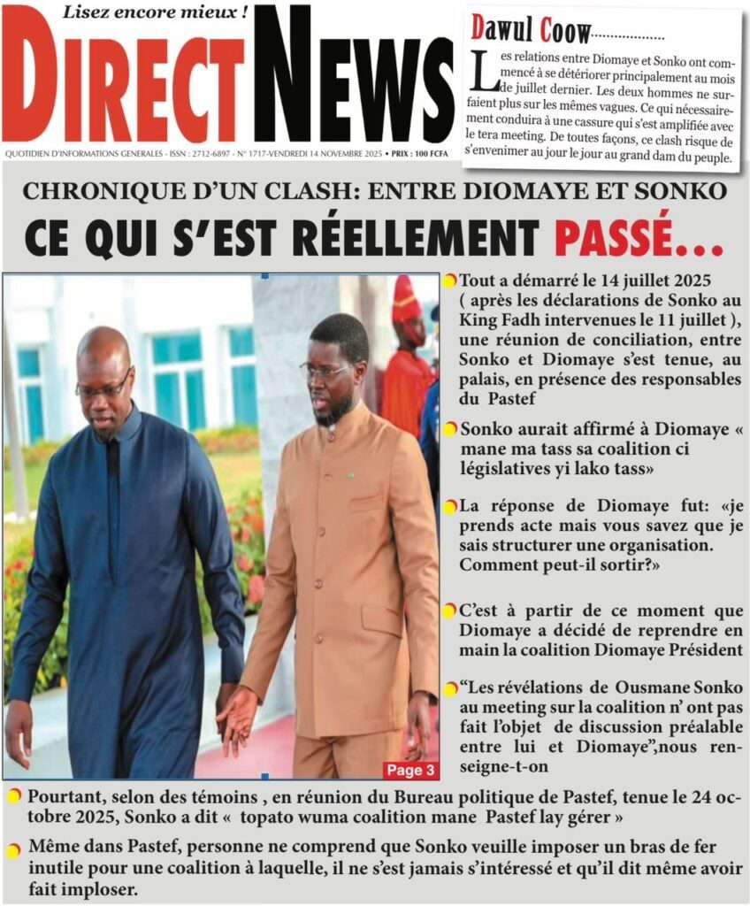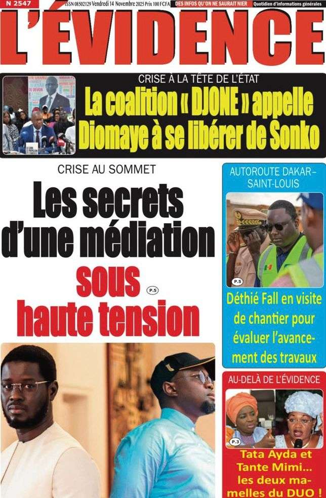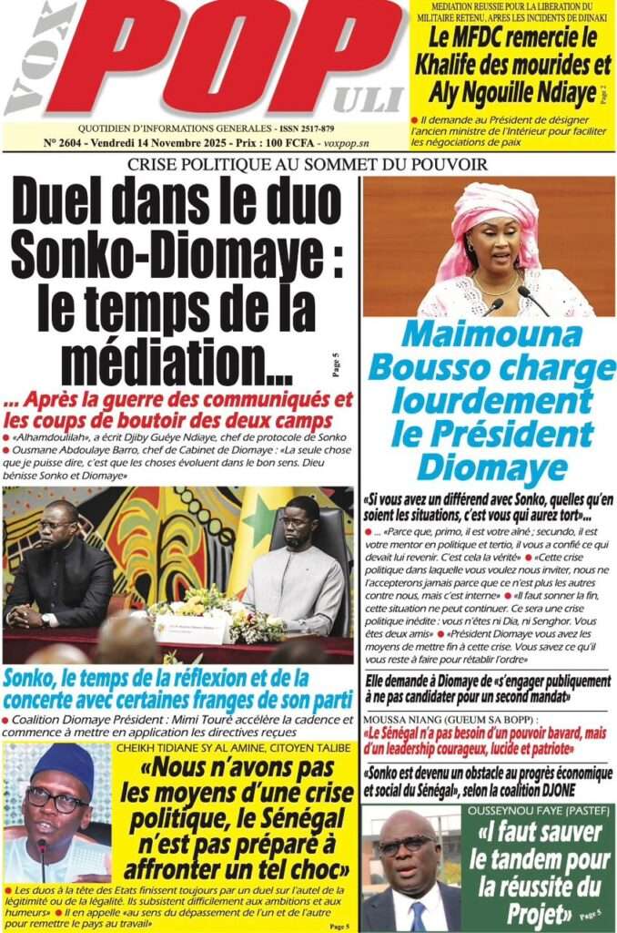 A la Une Actualité La Une Des Quotidiens – Vendredi 14 Novembre 2025 (Avec Ma Revue De Presse) Bour Sine novembre 14, 2025 0 Post navigation Previous: Coalition Diomaye Président : les mises au point du président Bassirou Diomaye Faye face à la polémiqueNext: Ousmane, je te l’avais dit, mais tu t’es entêté par orgueil, par jalousie et par méchanceté More Stories A la Une Actualité Politique Ce que change la nouvelle loi électorale adoptée par les députés Bour Sine avril 28, 2026 0 A la Une Actualité Politique « Ensemble, nous sommes une force »Par Hamidou Thiaw, Président du MPR Bour Sine avril 28, 2026 0 A la Une Actualité Pape Malick Ndour envoyé en prison Bour Sine avril 28, 2026 0 Laisser un commentaire Annuler la réponseVotre adresse e-mail ne sera pas publiée. Les champs obligatoires sont indiqués avec *Commentaire * Nom * E-mail * Site web Enregistrer mon nom, mon e-mail et mon site dans le navigateur pour mon prochain commentaire.