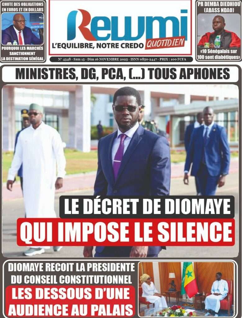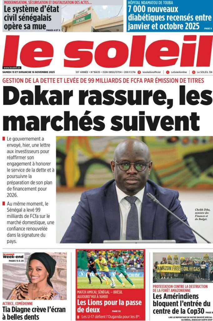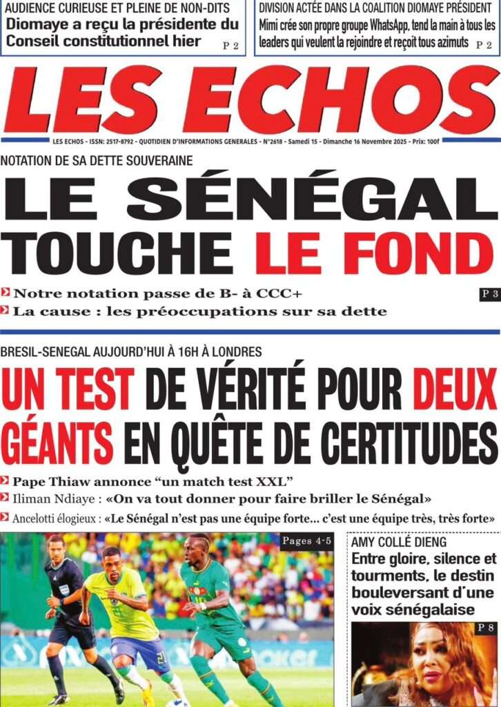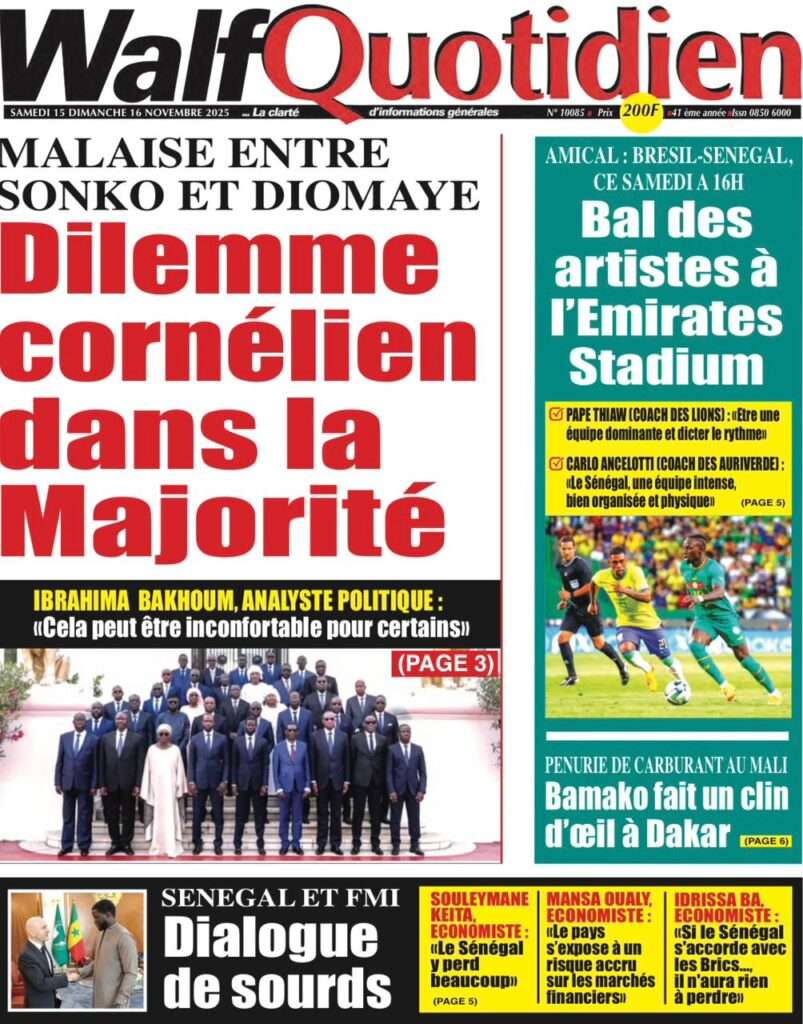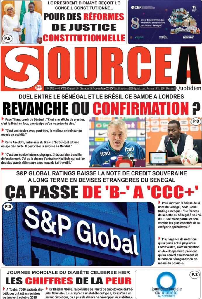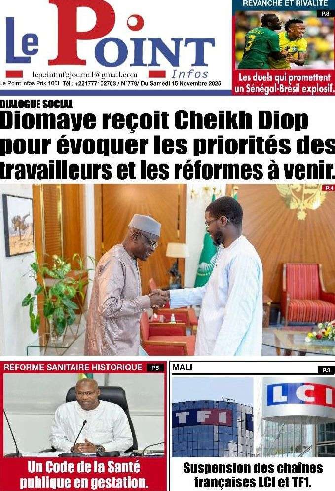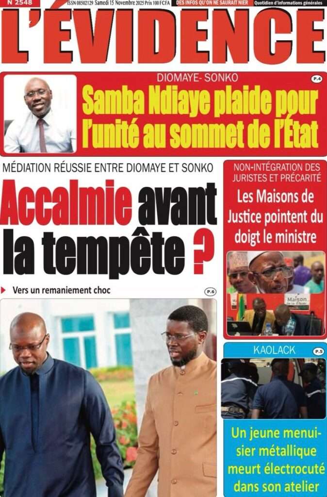 A la Une Actualité La Une Des Quotidiens – Samedi 15 Novembre 2025 (Avec Ma Revue De Presse) Bour Sine novembre 15, 2025 0 Post navigation Previous: Professeur Iba Der Thiam : un self-made-man d’exceptionNext: Brésil Vs Sénégal : où et quand suivre le match amical ? More Stories A la Une Actualité Politique Ce que change la nouvelle loi électorale adoptée par les députés Bour Sine avril 28, 2026 0 A la Une Actualité Politique « Ensemble, nous sommes une force »Par Hamidou Thiaw, Président du MPR Bour Sine avril 28, 2026 0 A la Une Actualité Pape Malick Ndour envoyé en prison Bour Sine avril 28, 2026 0 Laisser un commentaire Annuler la réponseVotre adresse e-mail ne sera pas publiée. Les champs obligatoires sont indiqués avec *Commentaire * Nom * E-mail * Site web Enregistrer mon nom, mon e-mail et mon site dans le navigateur pour mon prochain commentaire.