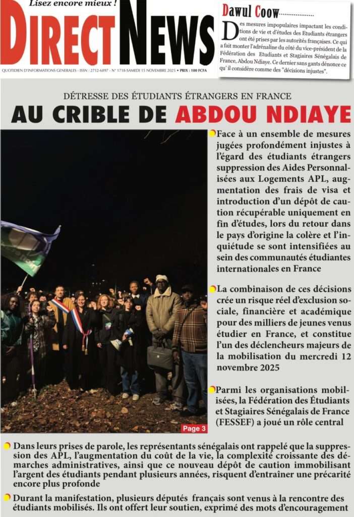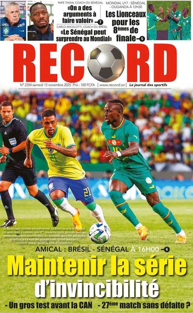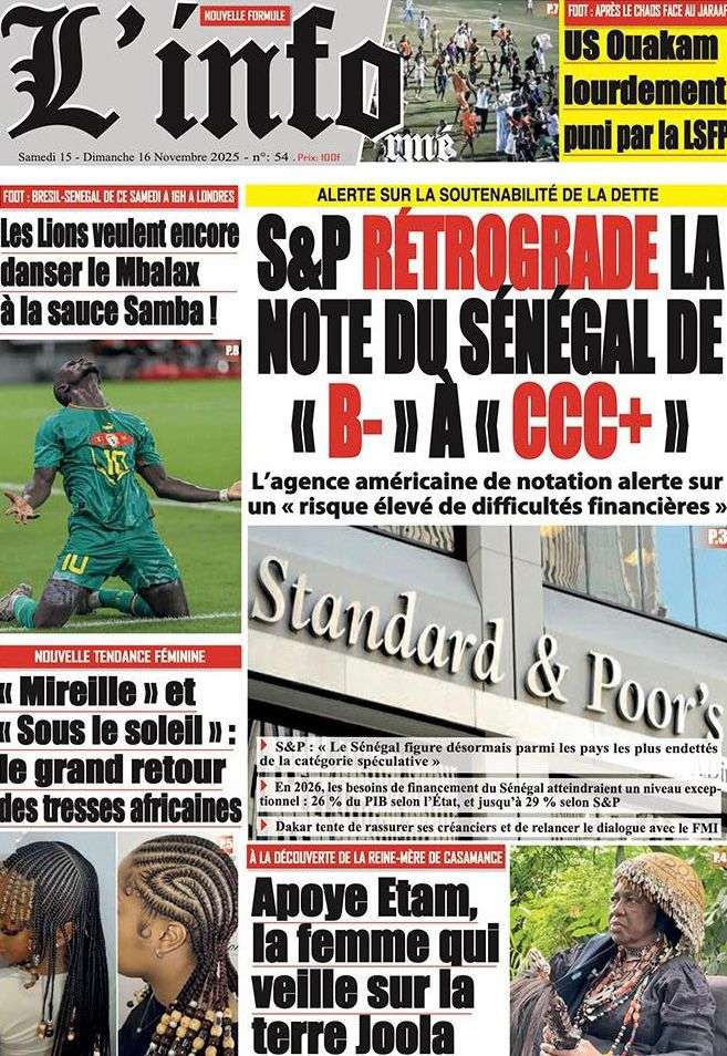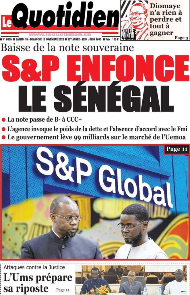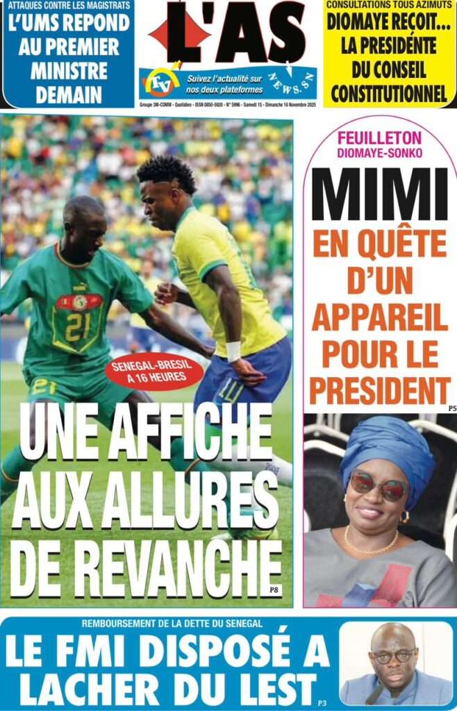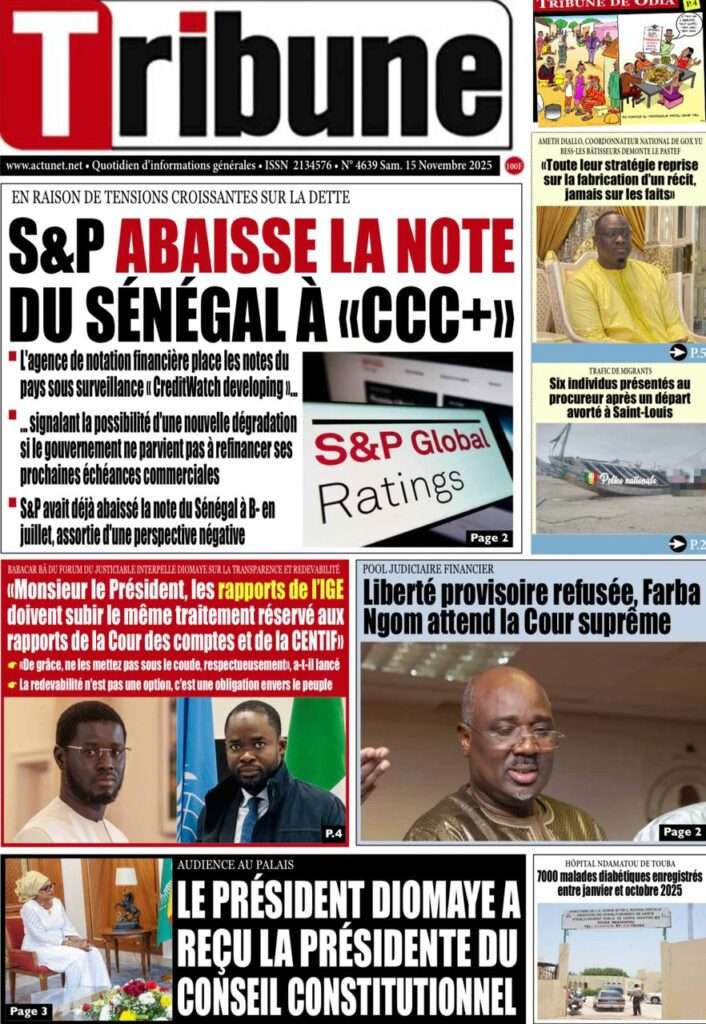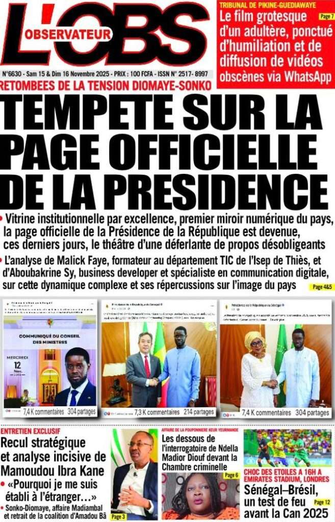 A la Une Actualité La Une Des Quotidiens – Samedi 15 Novembre 2025 (Avec Ma Revue De Presse) Bour Sine novembre 15, 2025 0 Post navigation Previous: Professeur Iba Der Thiam : un self-made-man d’exceptionNext: Brésil Vs Sénégal : où et quand suivre le match amical ? More Stories A la Une Actualité Politique Ce que change la nouvelle loi électorale adoptée par les députés Bour Sine avril 28, 2026 0 A la Une Actualité Politique « Ensemble, nous sommes une force »Par Hamidou Thiaw, Président du MPR Bour Sine avril 28, 2026 0 A la Une Actualité Pape Malick Ndour envoyé en prison Bour Sine avril 28, 2026 0 Laisser un commentaire Annuler la réponseVotre adresse e-mail ne sera pas publiée. Les champs obligatoires sont indiqués avec *Commentaire * Nom * E-mail * Site web Enregistrer mon nom, mon e-mail et mon site dans le navigateur pour mon prochain commentaire.