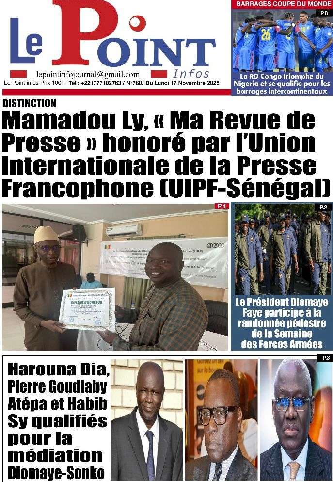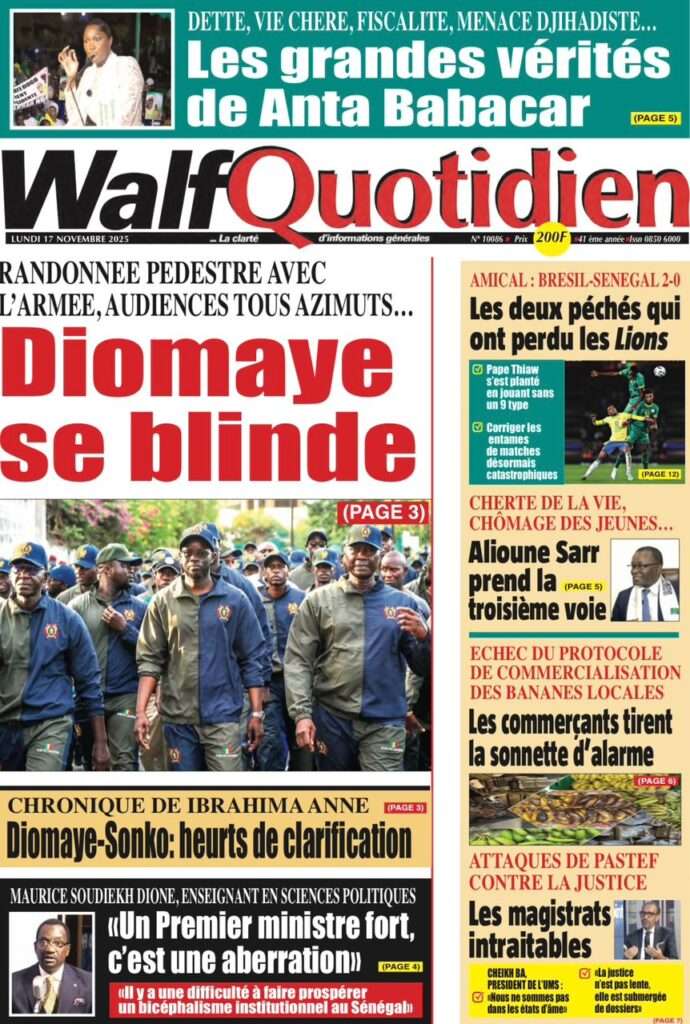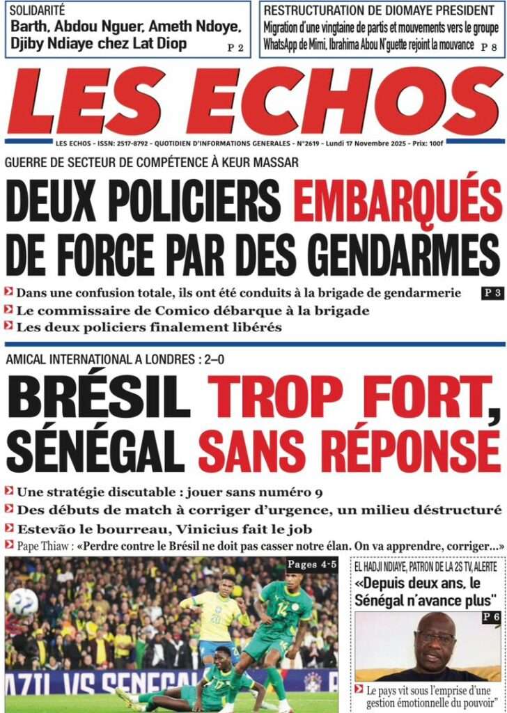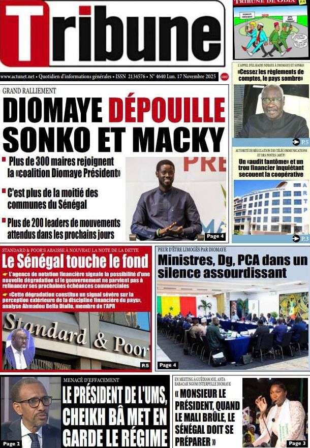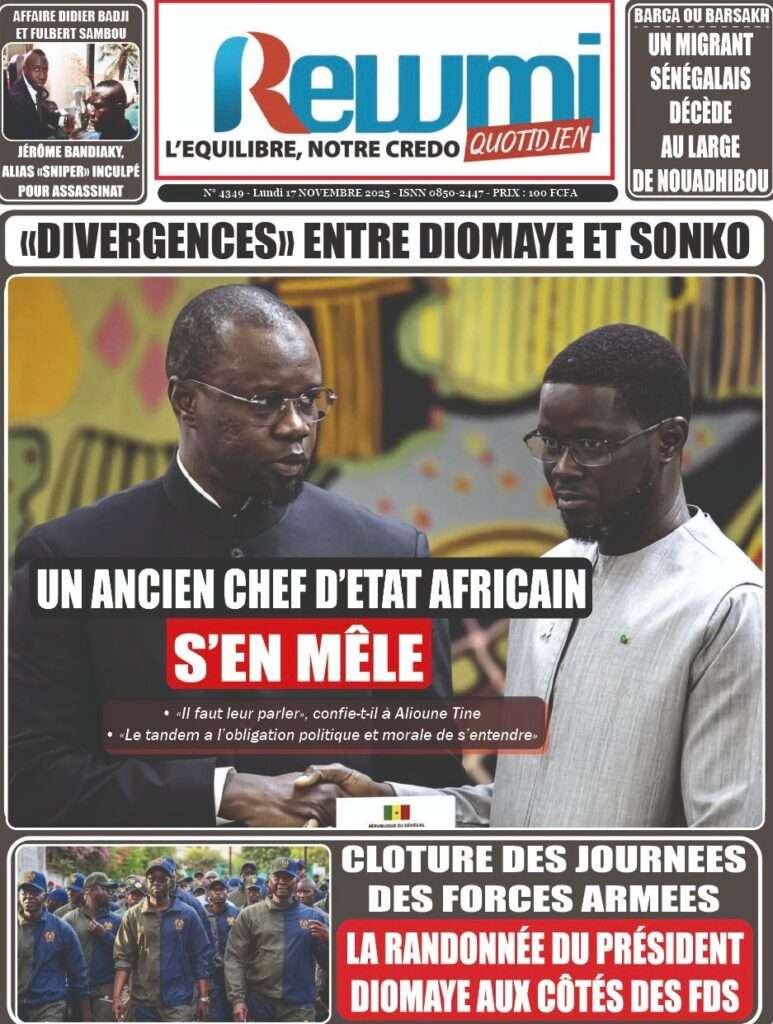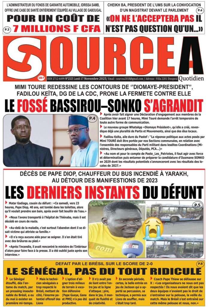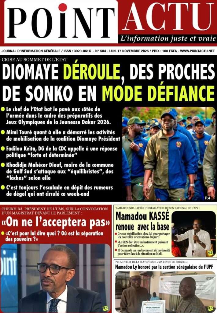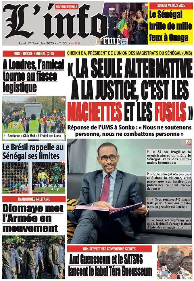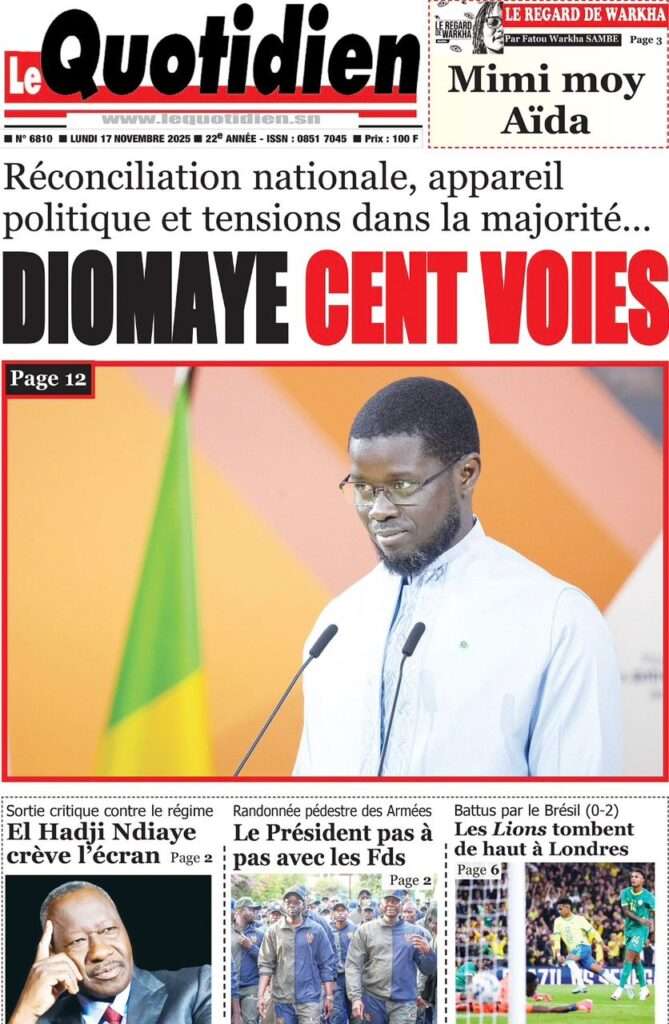 A la Une Actualité La Une Des Quotidiens – Lundi 17 Novembre 2025 (Avec Ma Revue De Presse) Bour Sine novembre 17, 2025 0 Post navigation Previous: 81e anniversaire du massacre de Thiaroye : Le Gouvernement installe le Comité de commémorationNext: Disparition de Fulbert Sambou et Didier Badji : l’inculpation qui n’éteint pas la demande de vérité More Stories A la Une Actualité Politique Ce que change la nouvelle loi électorale adoptée par les députés Bour Sine avril 28, 2026 0 A la Une Actualité Politique « Ensemble, nous sommes une force »Par Hamidou Thiaw, Président du MPR Bour Sine avril 28, 2026 0 A la Une Actualité Pape Malick Ndour envoyé en prison Bour Sine avril 28, 2026 0 Laisser un commentaire Annuler la réponseVotre adresse e-mail ne sera pas publiée. Les champs obligatoires sont indiqués avec *Commentaire * Nom * E-mail * Site web Enregistrer mon nom, mon e-mail et mon site dans le navigateur pour mon prochain commentaire.