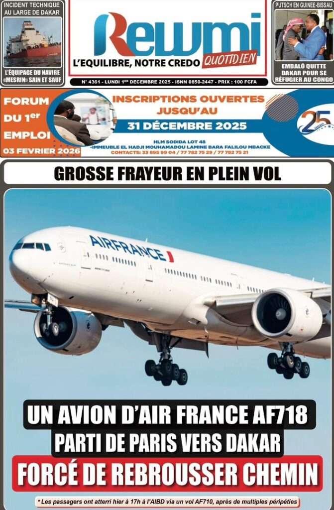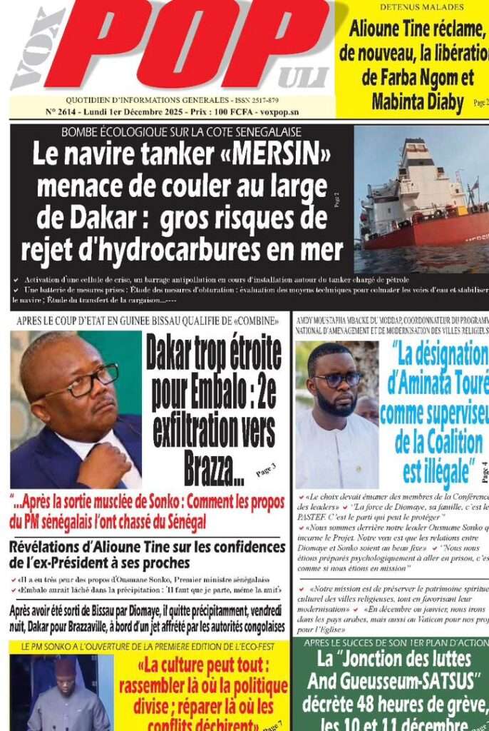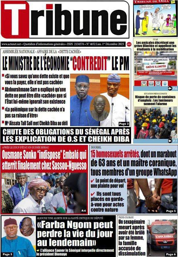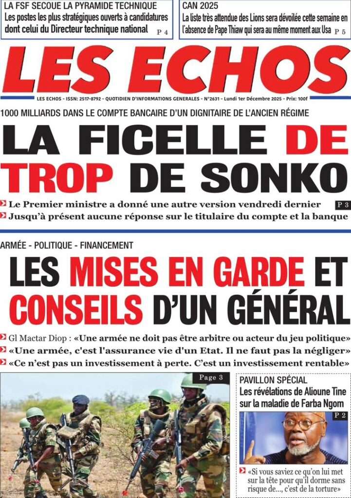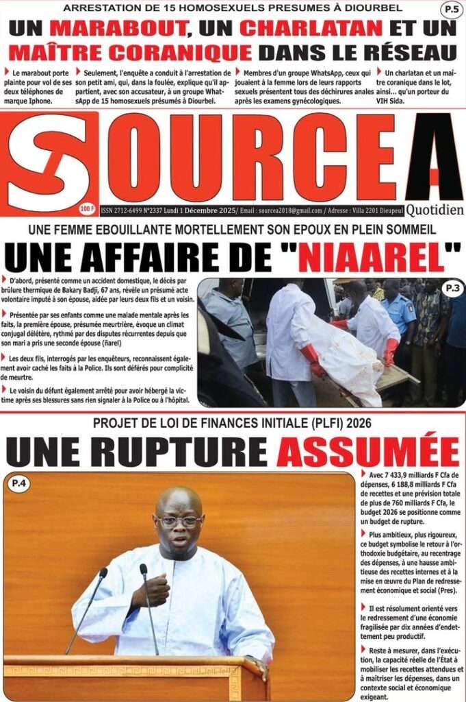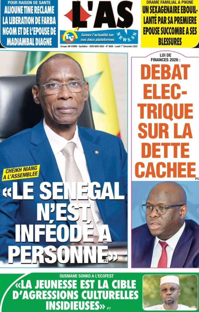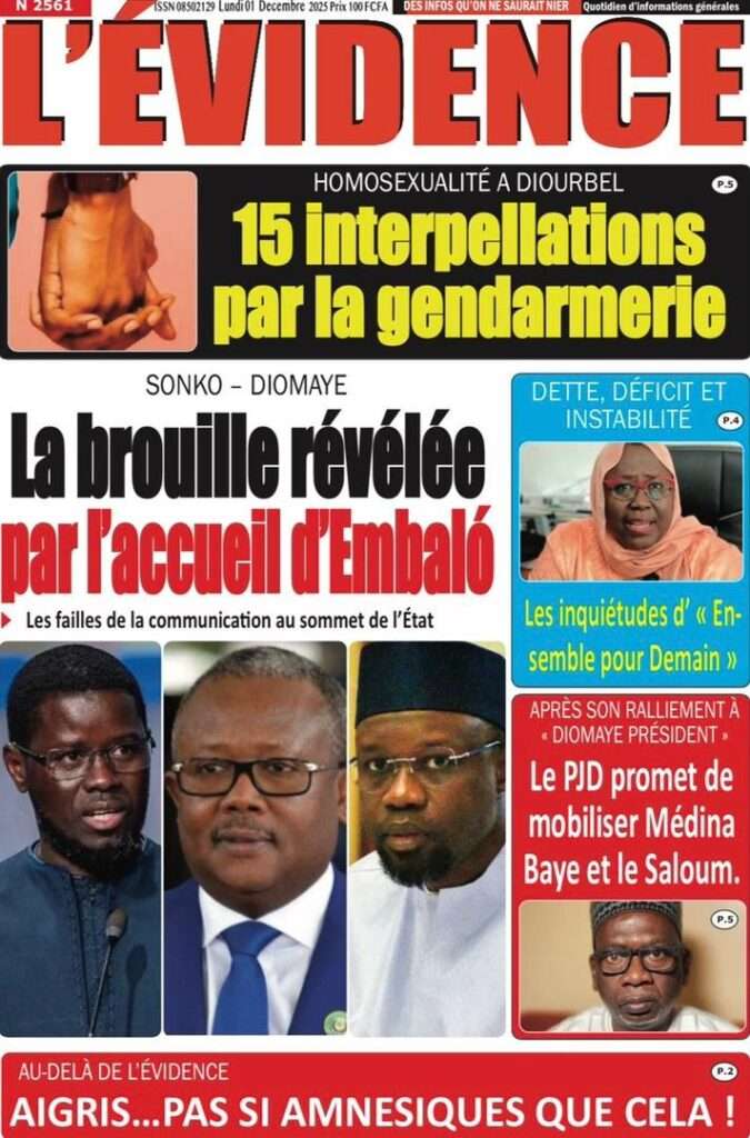 A la Une Actualité La Une Des Quotidiens – Lundi 01 Décembre 2025 (Avec Ma Revue De Presse) Bour Sine décembre 1, 2025 0 Post navigation Previous: L’ingénieur Arona Oumar Kane au PM Ousmane Sonko : Vous avez dit 280 milliards d’économies sur le train de vie de l’Etat ?Next: Exclusif – Fernando Dias da Costa n’est pas au Sénégal, il s’est réfugié à l’ambassade du Nigeria au Bissau More Stories A la Une Actualité Politique Ce que change la nouvelle loi électorale adoptée par les députés Bour Sine avril 28, 2026 0 A la Une Actualité Politique « Ensemble, nous sommes une force »Par Hamidou Thiaw, Président du MPR Bour Sine avril 28, 2026 0 A la Une Actualité Pape Malick Ndour envoyé en prison Bour Sine avril 28, 2026 0 Laisser un commentaire Annuler la réponseVotre adresse e-mail ne sera pas publiée. Les champs obligatoires sont indiqués avec *Commentaire * Nom * E-mail * Site web Enregistrer mon nom, mon e-mail et mon site dans le navigateur pour mon prochain commentaire.