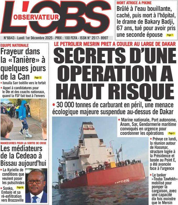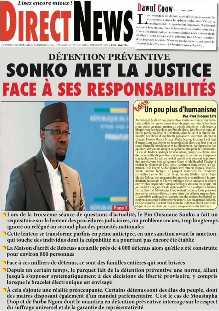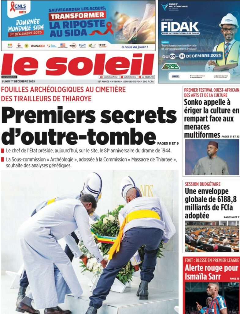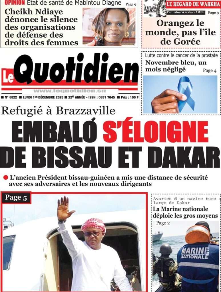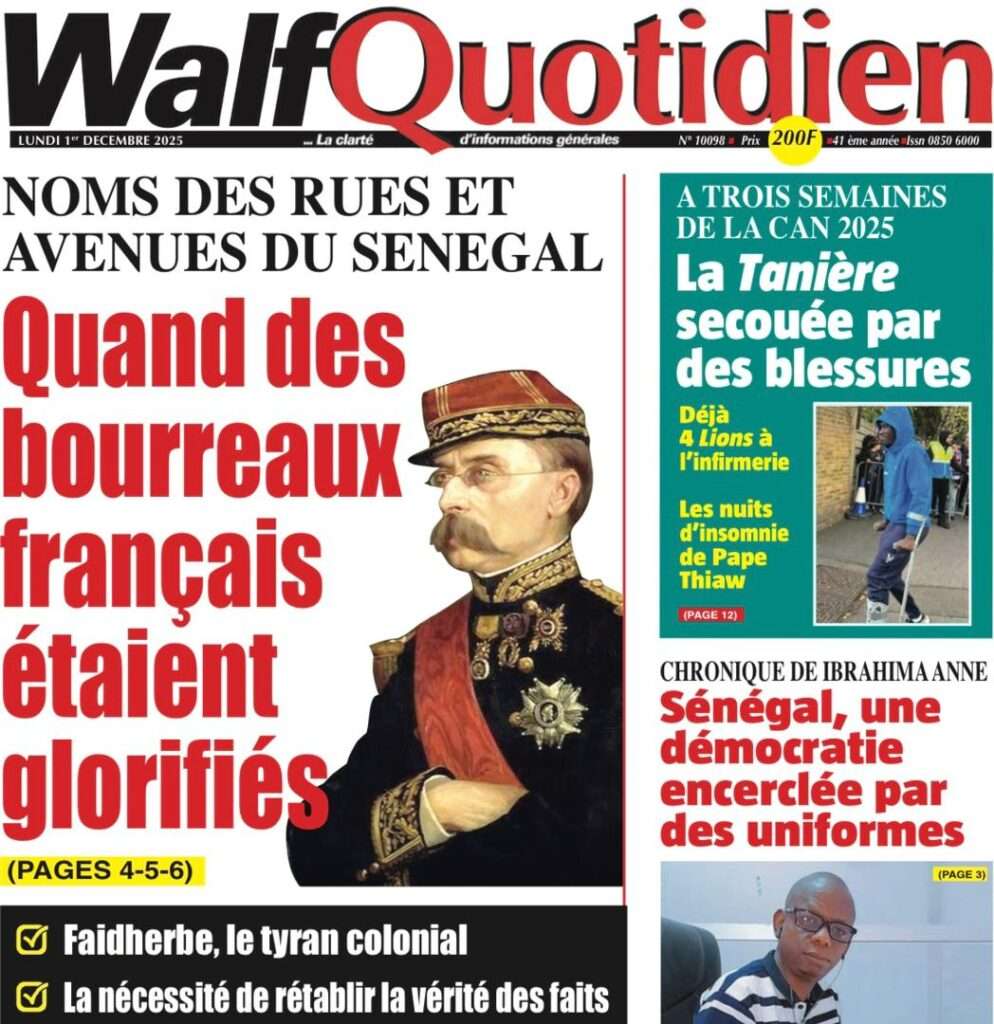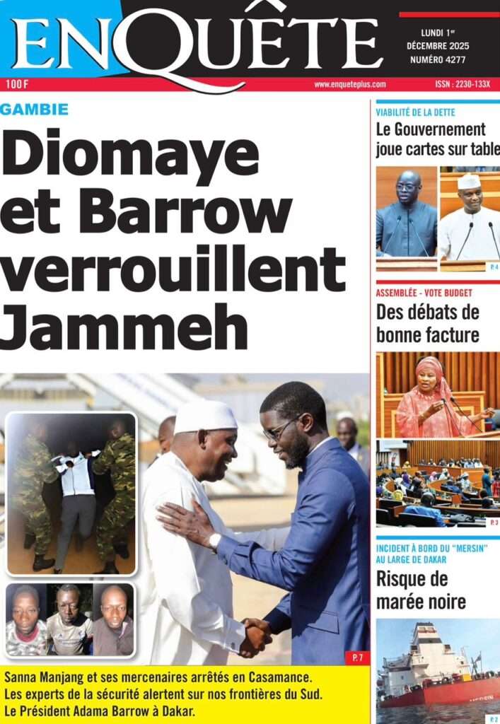 A la Une Actualité La Une Des Quotidiens – Lundi 01 Décembre 2025 (Avec Ma Revue De Presse) Bour Sine décembre 1, 2025 0 Post navigation Previous: L’ingénieur Arona Oumar Kane au PM Ousmane Sonko : Vous avez dit 280 milliards d’économies sur le train de vie de l’Etat ?Next: Exclusif – Fernando Dias da Costa n’est pas au Sénégal, il s’est réfugié à l’ambassade du Nigeria au Bissau More Stories A la Une Actualité Politique Ce que change la nouvelle loi électorale adoptée par les députés Bour Sine avril 28, 2026 0 A la Une Actualité Politique « Ensemble, nous sommes une force »Par Hamidou Thiaw, Président du MPR Bour Sine avril 28, 2026 0 A la Une Actualité Pape Malick Ndour envoyé en prison Bour Sine avril 28, 2026 0 Laisser un commentaire Annuler la réponseVotre adresse e-mail ne sera pas publiée. Les champs obligatoires sont indiqués avec *Commentaire * Nom * E-mail * Site web Enregistrer mon nom, mon e-mail et mon site dans le navigateur pour mon prochain commentaire.