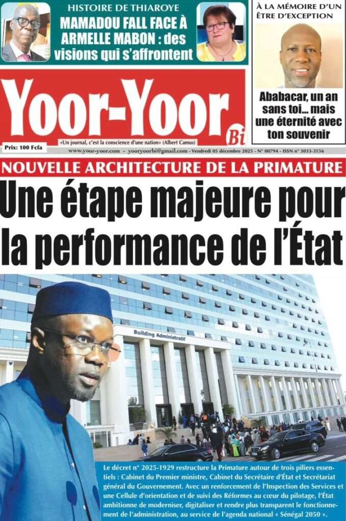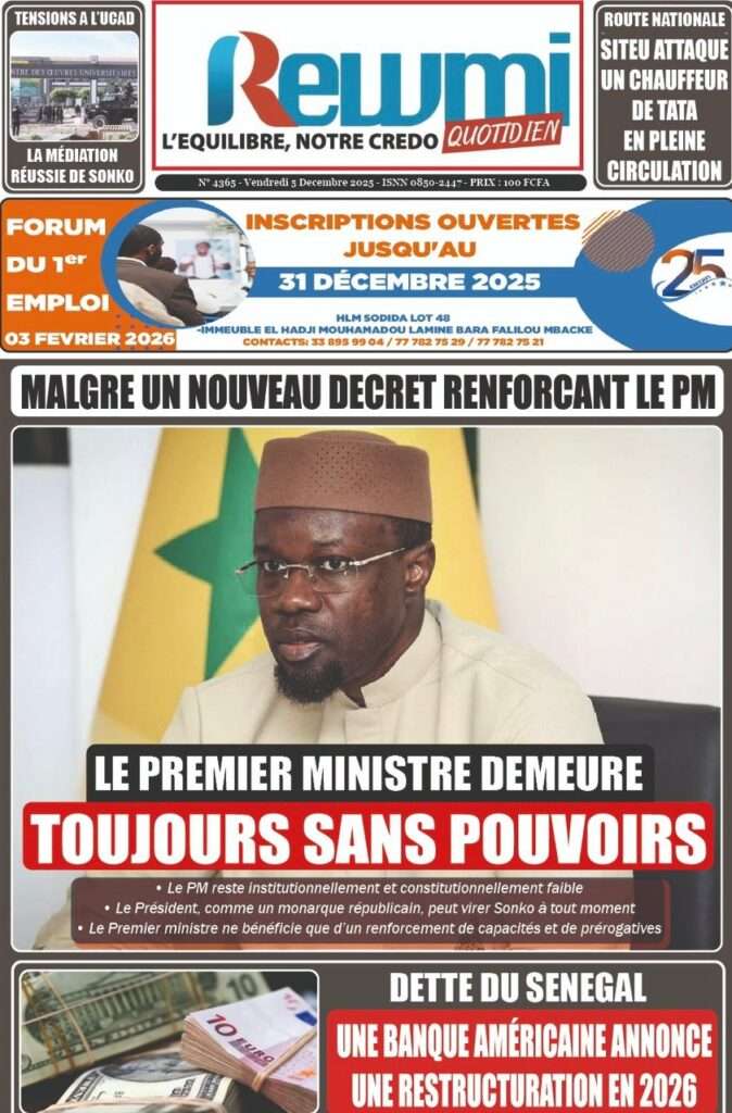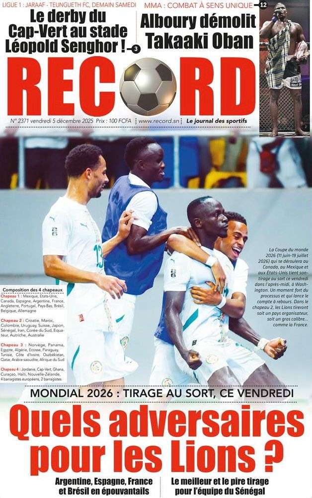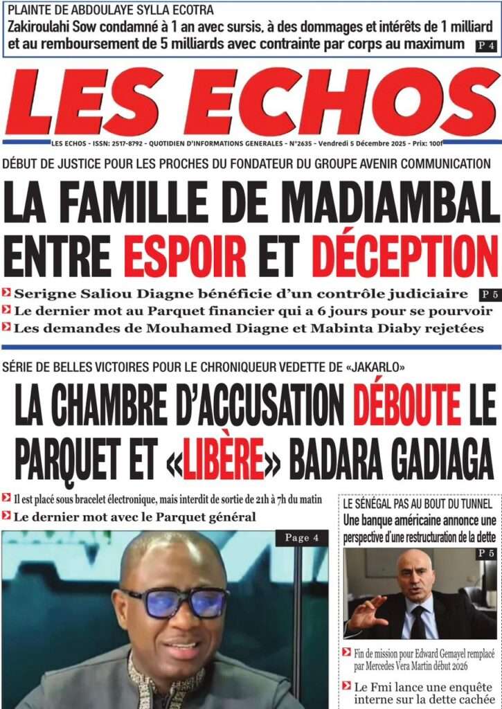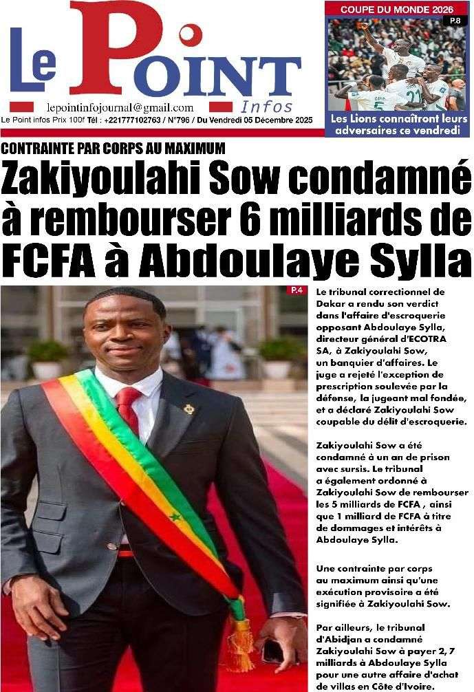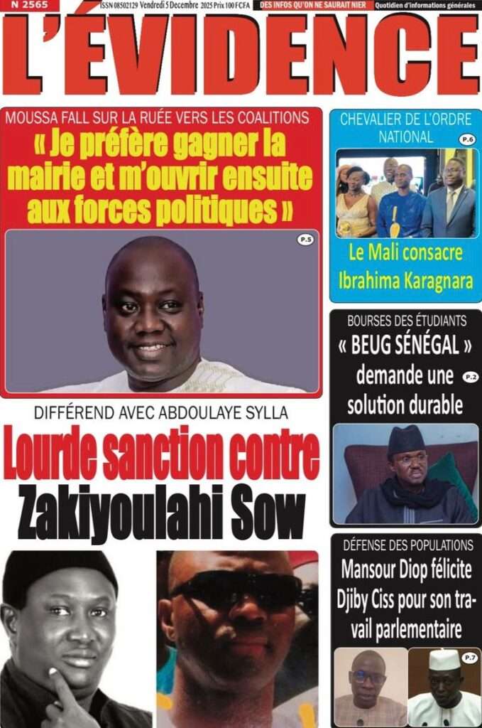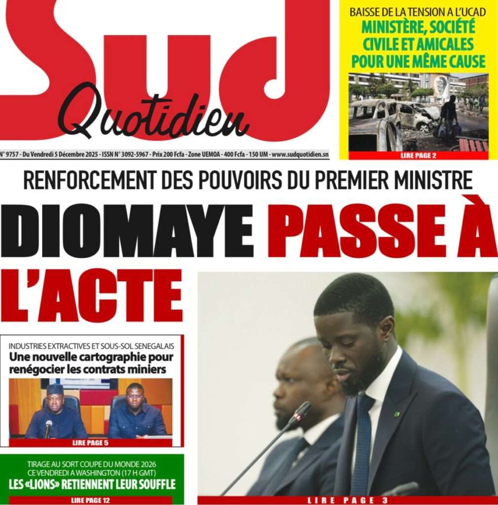 A la Une Actualité La Une Des Quotidiens – Vendredi 05 Décembre 2025 (Avec Ma Revue De Presse) Bour Sine décembre 5, 2025 0 Post navigation Previous: Liberté provisoire confirmée, Badara Gadiaga libre si le parquet n’émet pas un pourvoiNext: Mondial 2026 : voici le résultat du tirage des groupes, le Sénégal avec la France, la Norvège… More Stories A la Une Actualité Politique Ce que change la nouvelle loi électorale adoptée par les députés Bour Sine avril 28, 2026 0 A la Une Actualité Politique « Ensemble, nous sommes une force »Par Hamidou Thiaw, Président du MPR Bour Sine avril 28, 2026 0 A la Une Actualité Pape Malick Ndour envoyé en prison Bour Sine avril 28, 2026 0 Laisser un commentaire Annuler la réponseVotre adresse e-mail ne sera pas publiée. Les champs obligatoires sont indiqués avec *Commentaire * Nom * E-mail * Site web Enregistrer mon nom, mon e-mail et mon site dans le navigateur pour mon prochain commentaire.