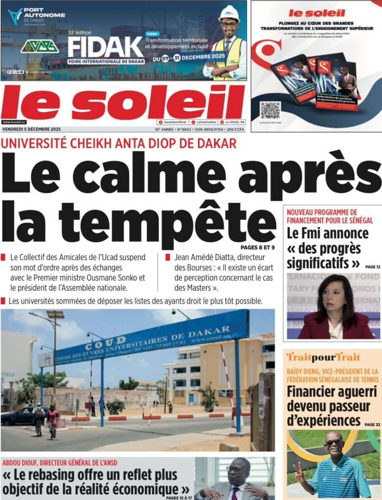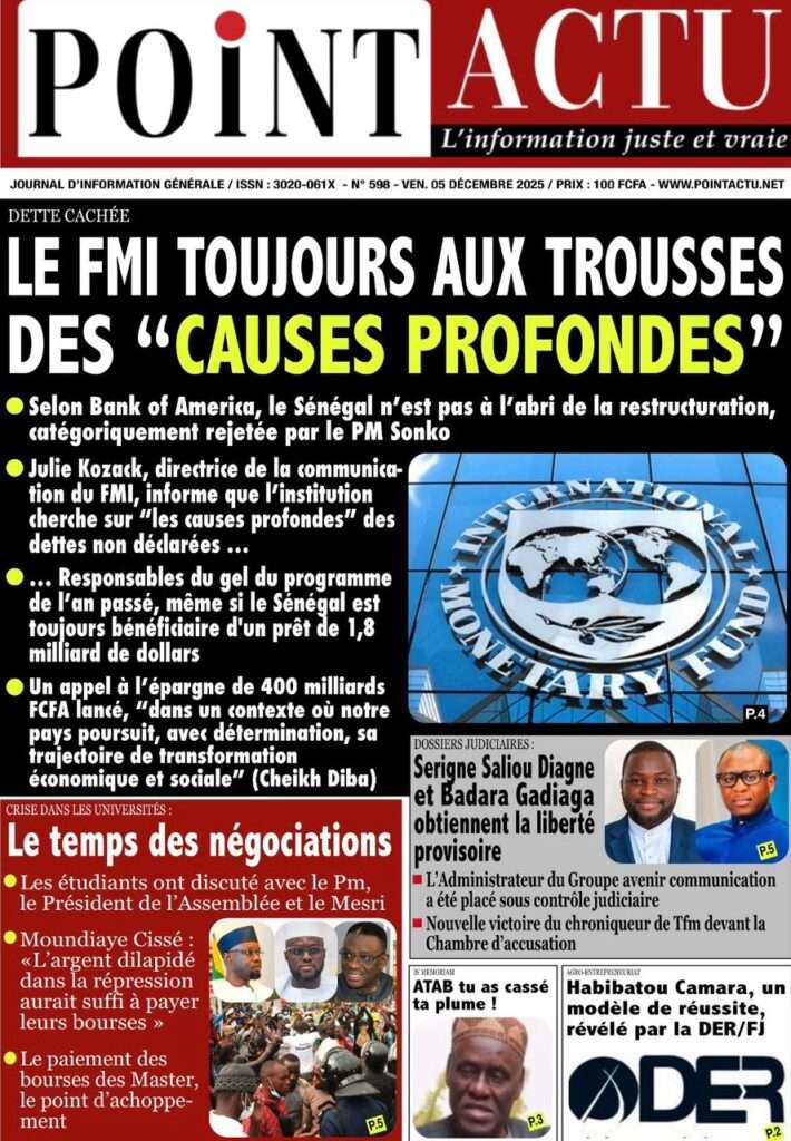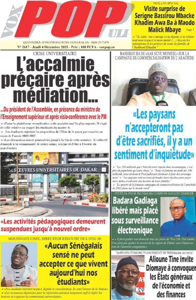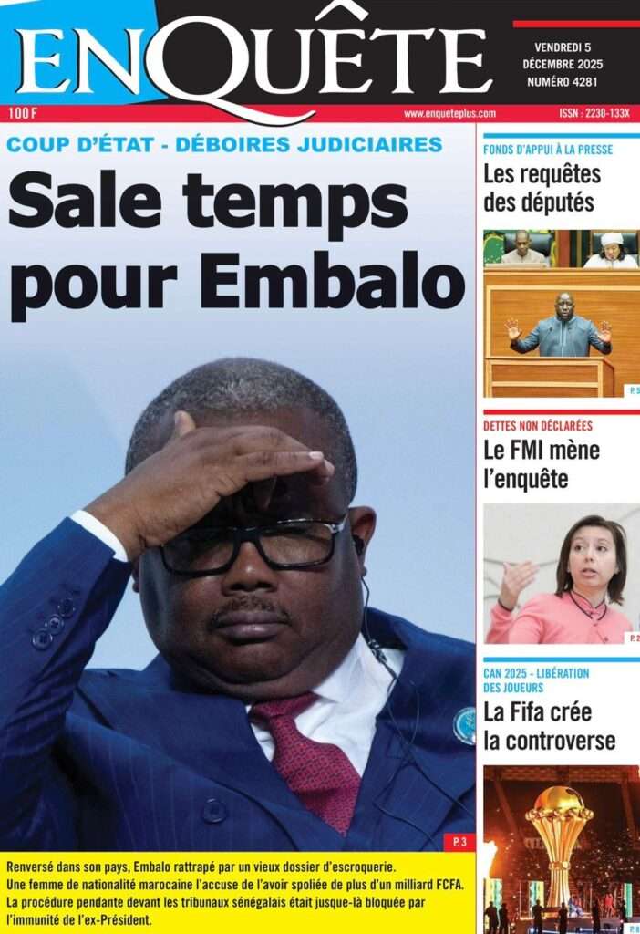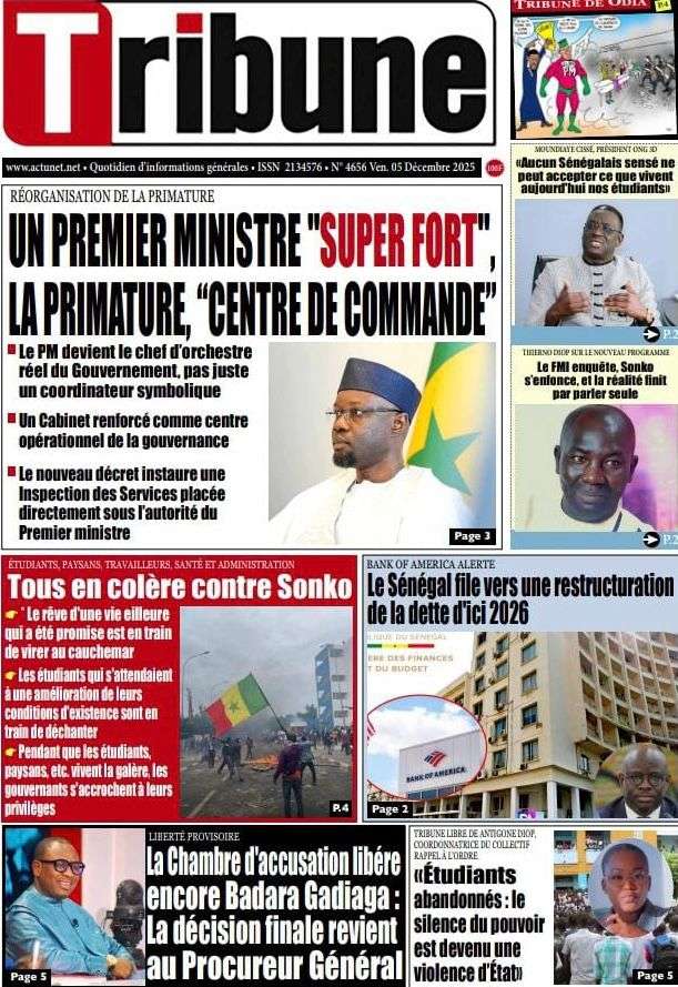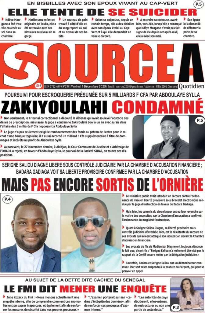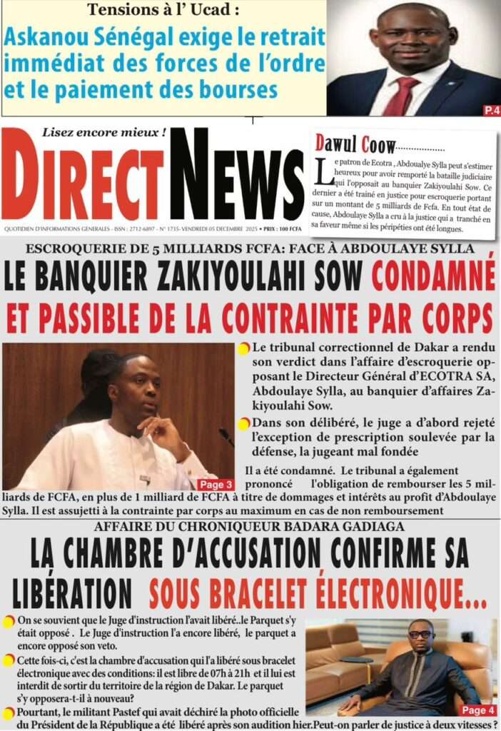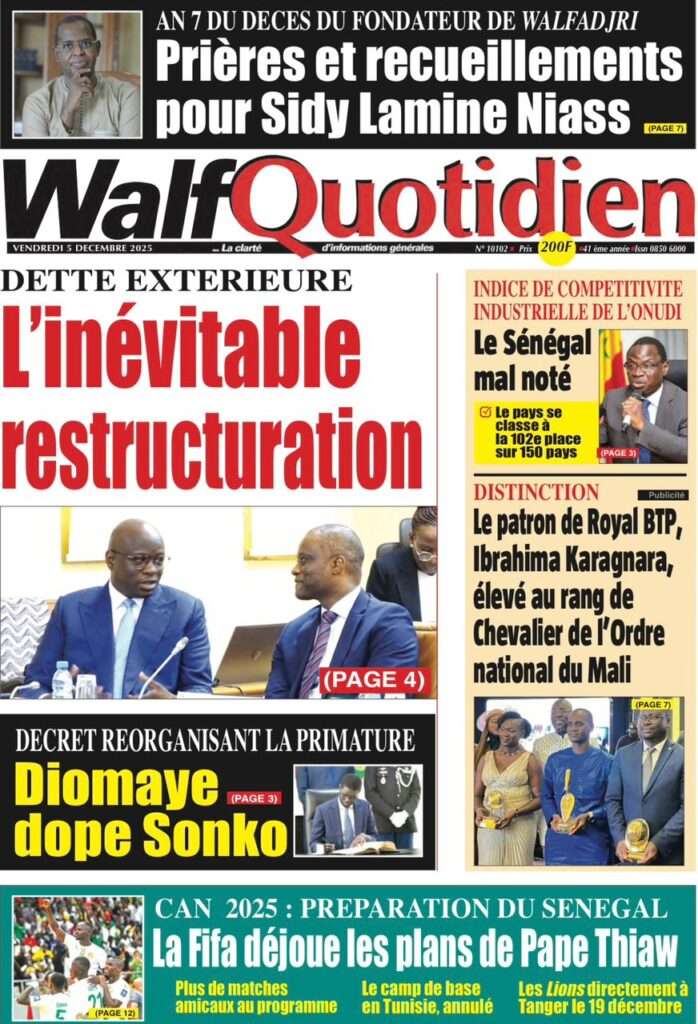 A la Une Actualité La Une Des Quotidiens – Vendredi 05 Décembre 2025 (Avec Ma Revue De Presse) Bour Sine décembre 5, 2025 0 Post navigation Previous: Liberté provisoire confirmée, Badara Gadiaga libre si le parquet n’émet pas un pourvoiNext: Mondial 2026 : voici le résultat du tirage des groupes, le Sénégal avec la France, la Norvège… More Stories A la Une Actualité Politique Ce que change la nouvelle loi électorale adoptée par les députés Bour Sine avril 28, 2026 0 A la Une Actualité Politique « Ensemble, nous sommes une force »Par Hamidou Thiaw, Président du MPR Bour Sine avril 28, 2026 0 A la Une Actualité Pape Malick Ndour envoyé en prison Bour Sine avril 28, 2026 0 Laisser un commentaire Annuler la réponseVotre adresse e-mail ne sera pas publiée. Les champs obligatoires sont indiqués avec *Commentaire * Nom * E-mail * Site web Enregistrer mon nom, mon e-mail et mon site dans le navigateur pour mon prochain commentaire.