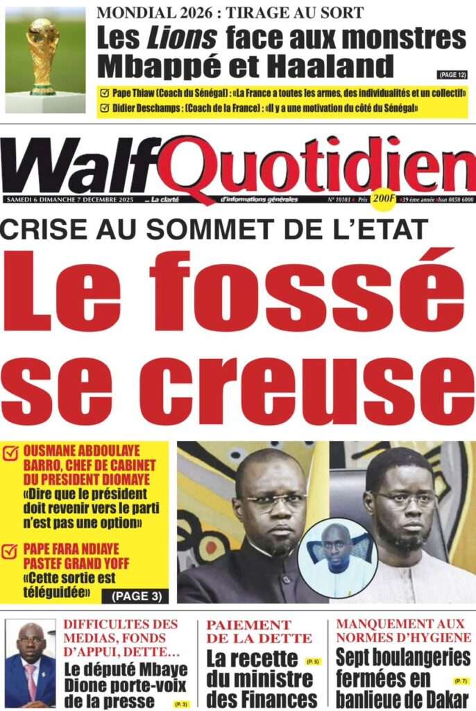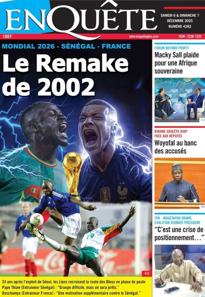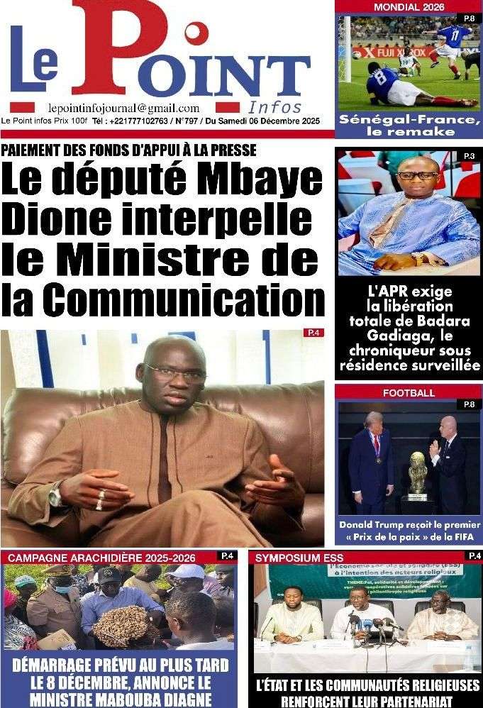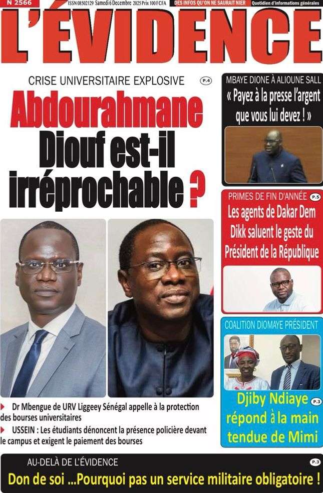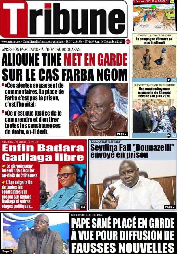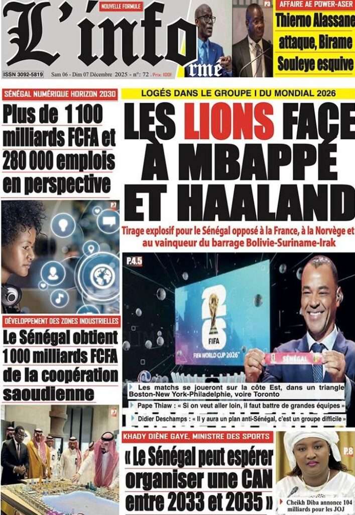 A la Une Actualité La Une Des Quotidiens – Samedi 06 Décembre 2025 (Avec Ma Revue De Presse) Bour Sine décembre 6, 2025 0 Post navigation Previous: Section de recherches : Pape Sané placé en garde à vue pour « diffusion de fausses nouvelles »Next: L’inscription d’Ousmane Sonko parmi les «maîtres du monde» : enjeux de puissance, rivalités d’influence et recompositions mondiales More Stories A la Une Actualité Politique Ce que change la nouvelle loi électorale adoptée par les députés Bour Sine avril 28, 2026 0 A la Une Actualité Politique « Ensemble, nous sommes une force »Par Hamidou Thiaw, Président du MPR Bour Sine avril 28, 2026 0 A la Une Actualité Pape Malick Ndour envoyé en prison Bour Sine avril 28, 2026 0 Laisser un commentaire Annuler la réponseVotre adresse e-mail ne sera pas publiée. Les champs obligatoires sont indiqués avec *Commentaire * Nom * E-mail * Site web Enregistrer mon nom, mon e-mail et mon site dans le navigateur pour mon prochain commentaire.