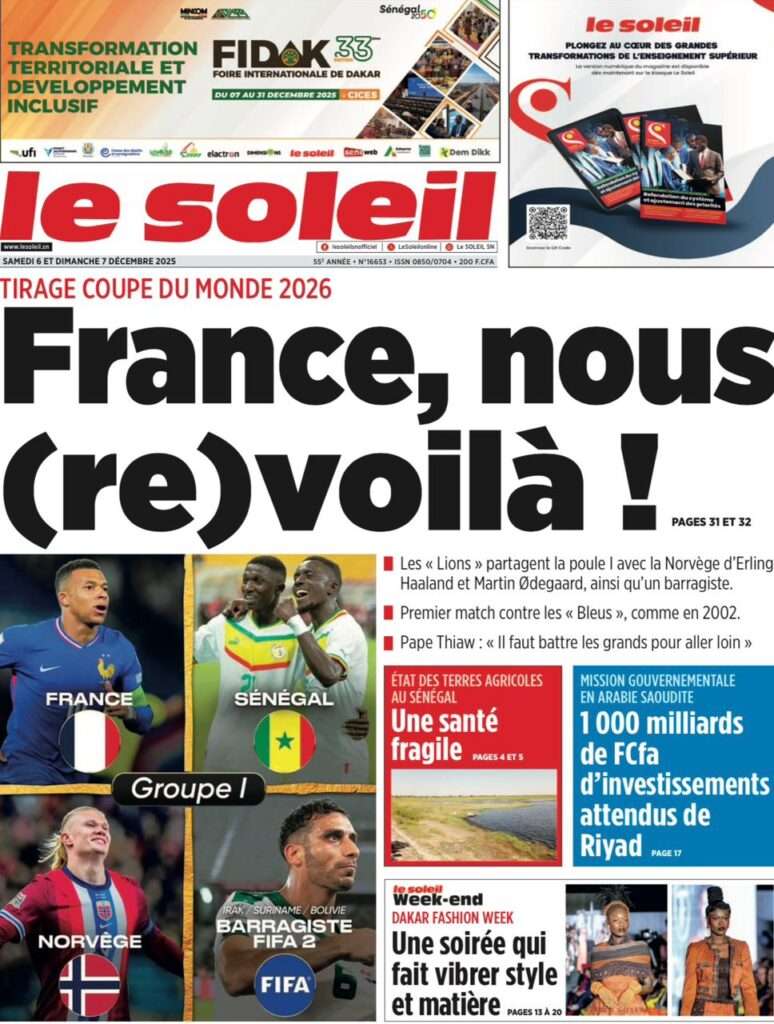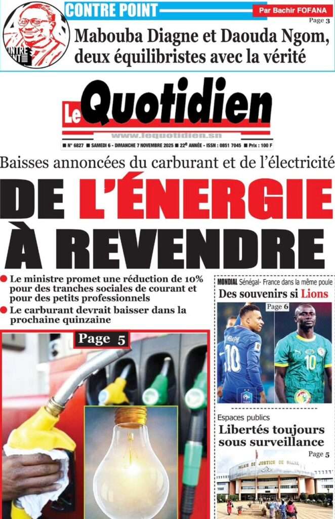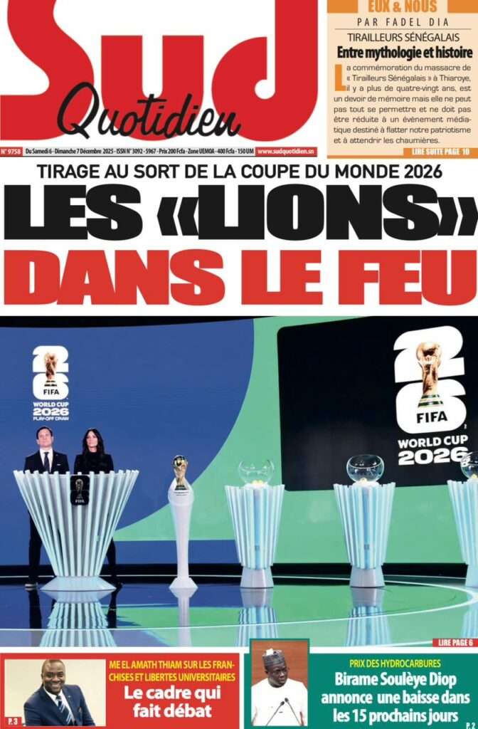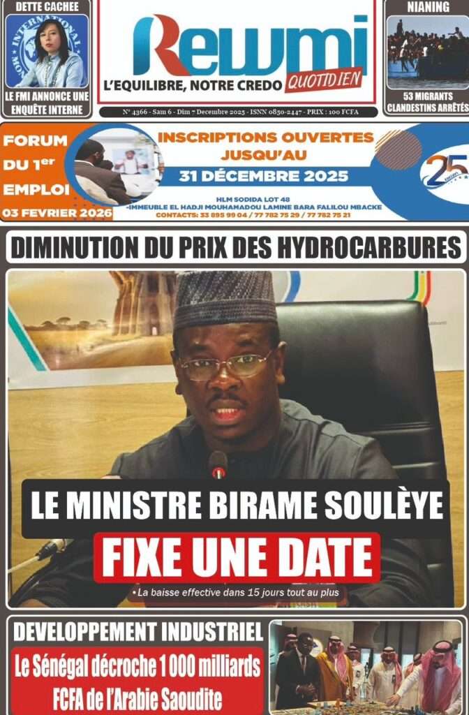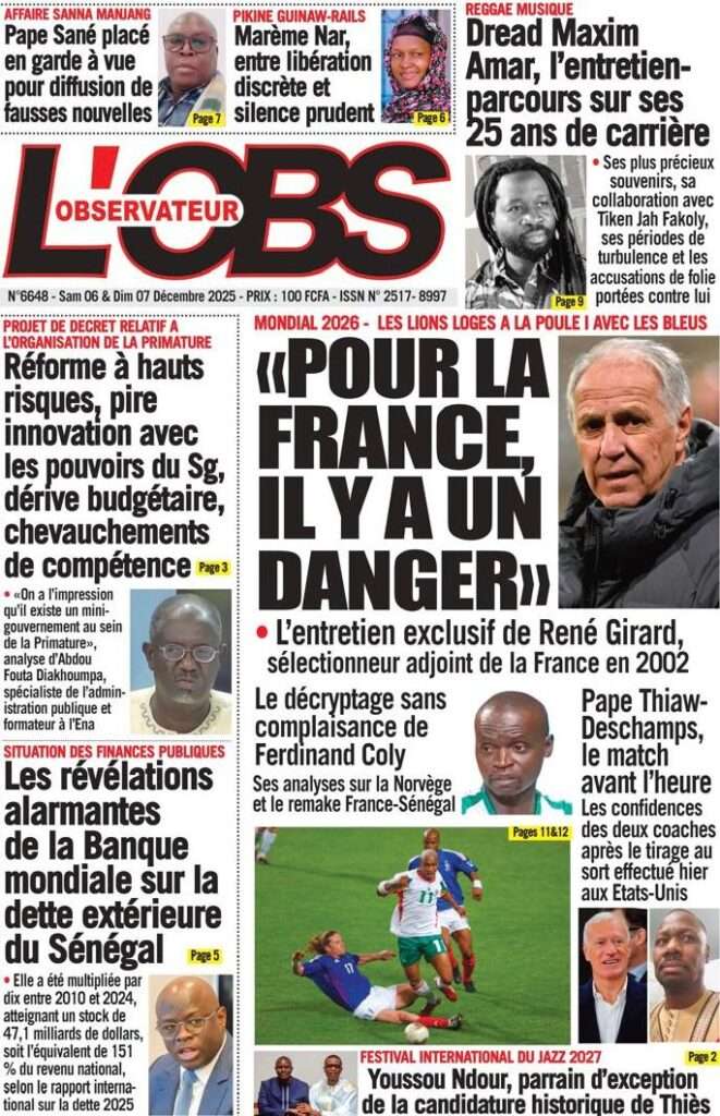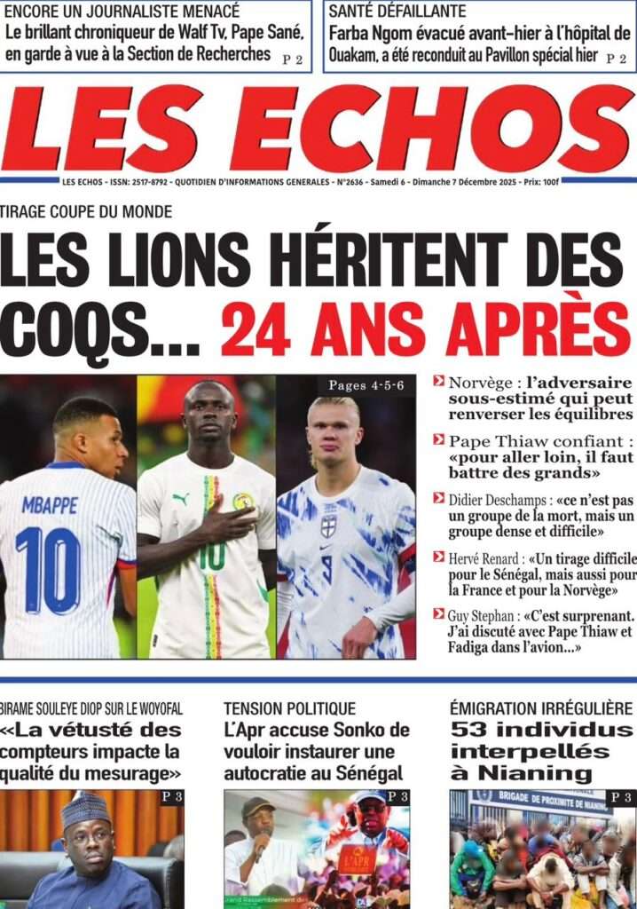 A la Une Actualité La Une Des Quotidiens – Samedi 06 Décembre 2025 (Avec Ma Revue De Presse) Bour Sine décembre 6, 2025 0 Post navigation Previous: Section de recherches : Pape Sané placé en garde à vue pour « diffusion de fausses nouvelles »Next: L’inscription d’Ousmane Sonko parmi les «maîtres du monde» : enjeux de puissance, rivalités d’influence et recompositions mondiales More Stories A la Une Actualité Politique Ce que change la nouvelle loi électorale adoptée par les députés Bour Sine avril 28, 2026 0 A la Une Actualité Politique « Ensemble, nous sommes une force »Par Hamidou Thiaw, Président du MPR Bour Sine avril 28, 2026 0 A la Une Actualité Pape Malick Ndour envoyé en prison Bour Sine avril 28, 2026 0 Laisser un commentaire Annuler la réponseVotre adresse e-mail ne sera pas publiée. Les champs obligatoires sont indiqués avec *Commentaire * Nom * E-mail * Site web Enregistrer mon nom, mon e-mail et mon site dans le navigateur pour mon prochain commentaire.