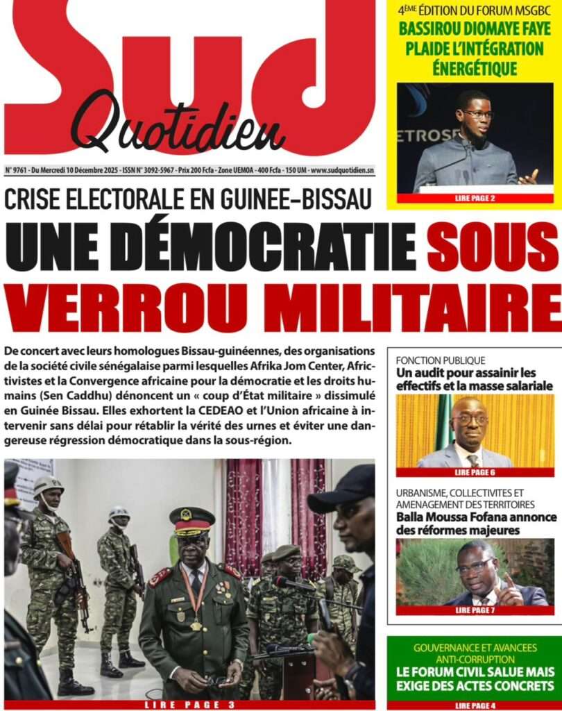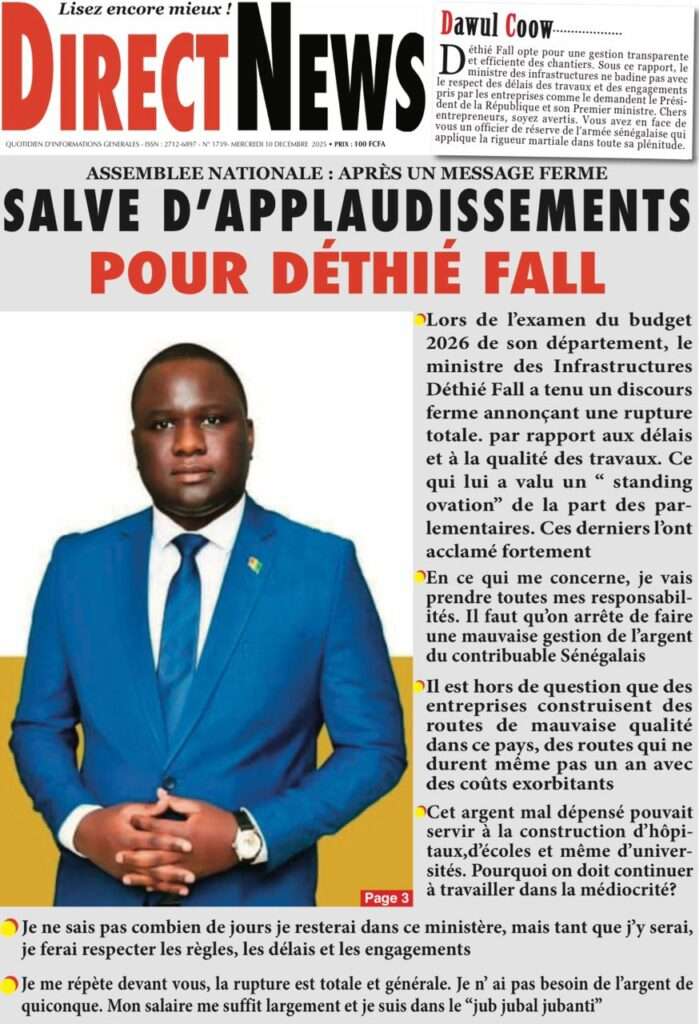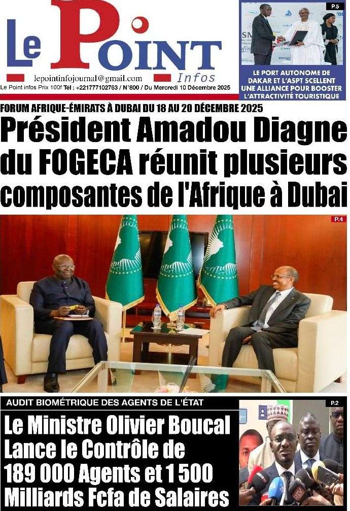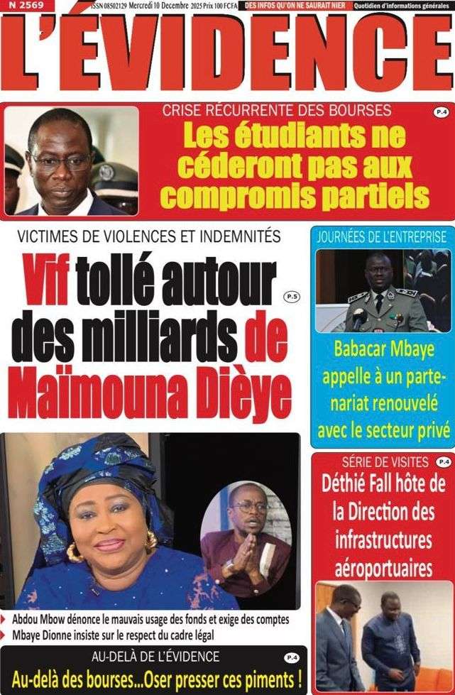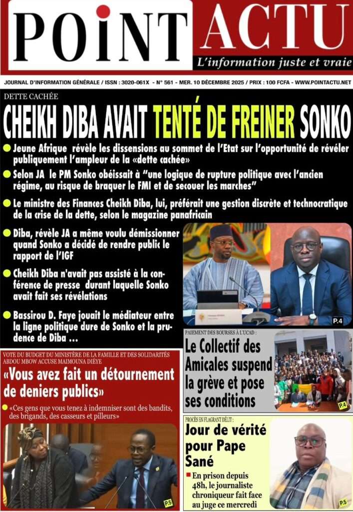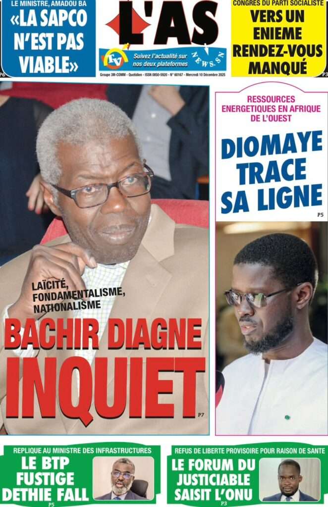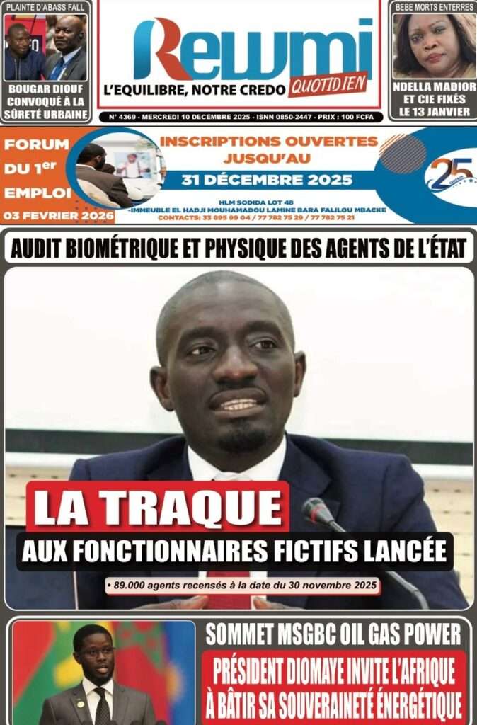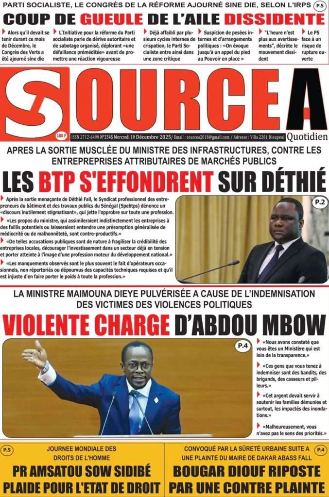 A la Une Actualité La Une Des Quotidiens – Mercredi 10 Décembre 2025 (Avec Ma Revue De Presse) Bour Sine décembre 10, 2025 0 Post navigation Previous: Nommé CEMGA en remplacement de Mbaye Cissé, Oumar Wade, 1er marin à commander les ArméesNext: Thierno LÔ félicite Mankeur Ndiaye pour sa « très belle intervention » au colloque de Sciences Po More Stories A la Une Actualité Politique Ce que change la nouvelle loi électorale adoptée par les députés Bour Sine avril 28, 2026 0 A la Une Actualité Politique « Ensemble, nous sommes une force »Par Hamidou Thiaw, Président du MPR Bour Sine avril 28, 2026 0 A la Une Actualité Pape Malick Ndour envoyé en prison Bour Sine avril 28, 2026 0 Laisser un commentaire Annuler la réponseVotre adresse e-mail ne sera pas publiée. Les champs obligatoires sont indiqués avec *Commentaire * Nom * E-mail * Site web Enregistrer mon nom, mon e-mail et mon site dans le navigateur pour mon prochain commentaire.