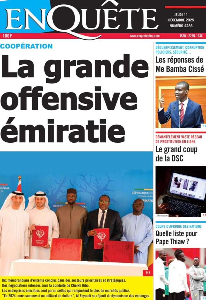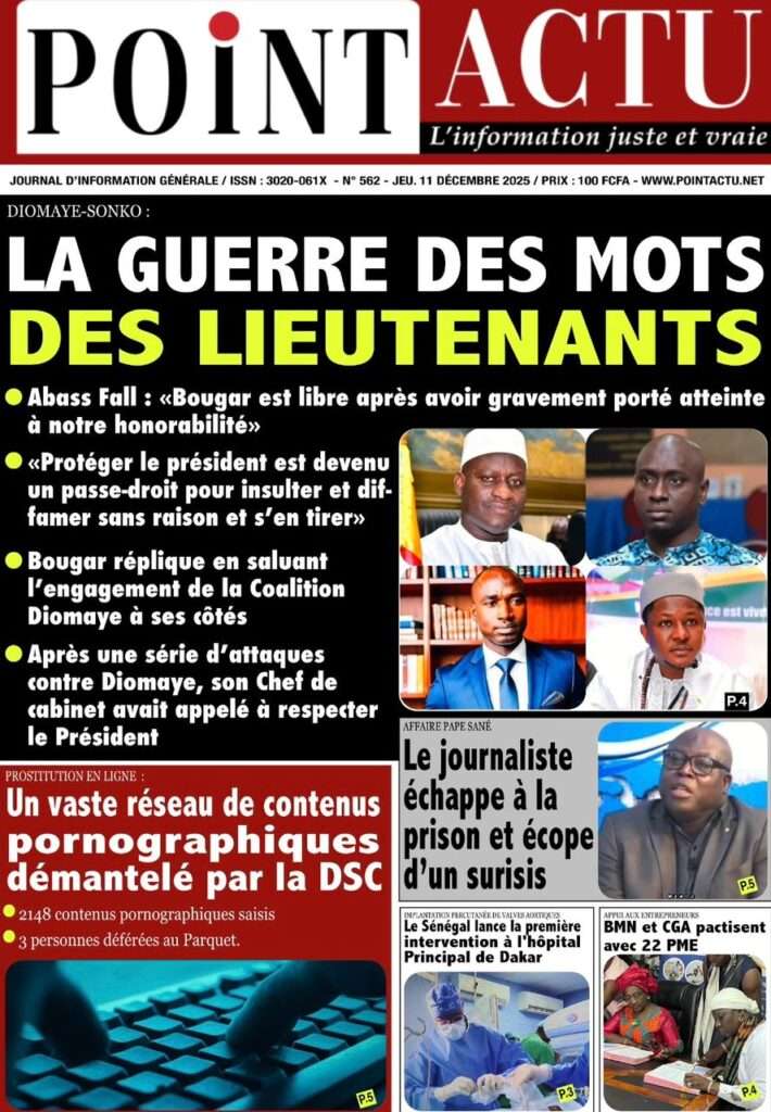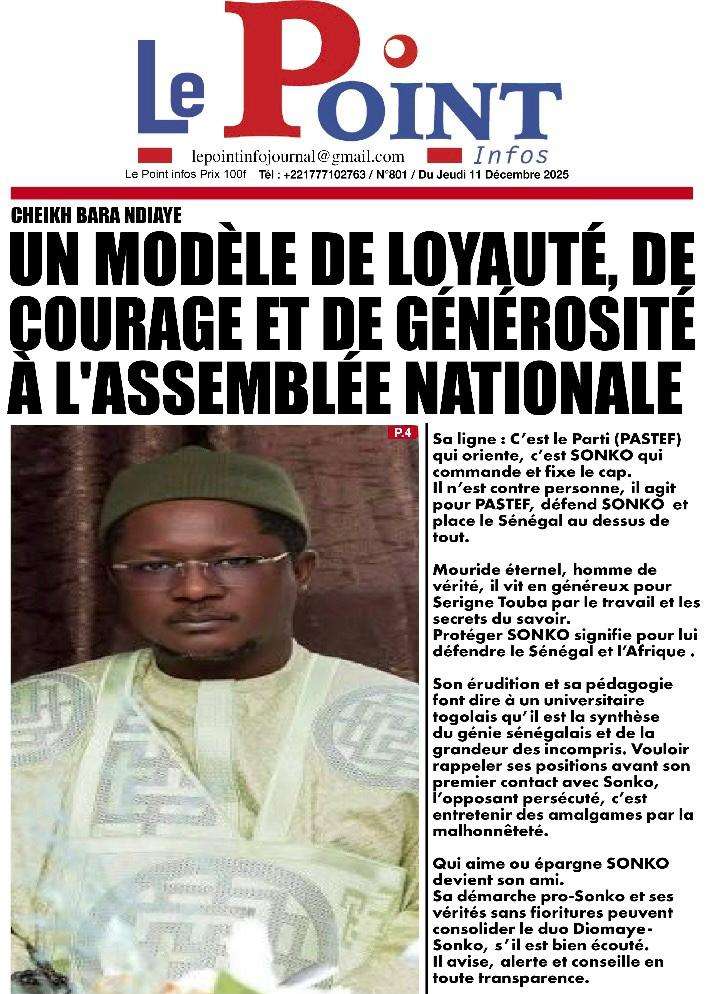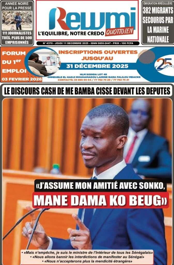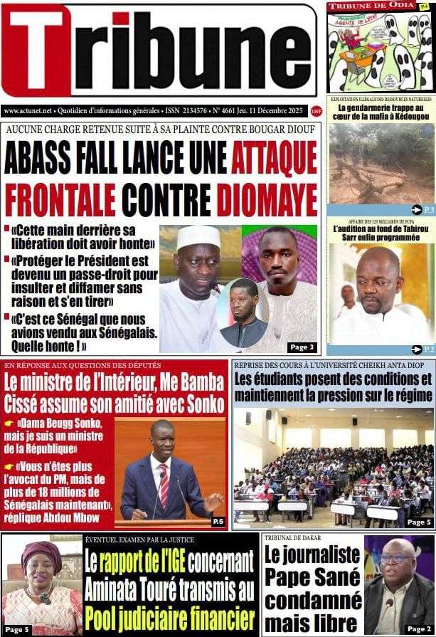 A la Une Actualité La Une Des Quotidiens – Jeudi 11 Décembre 2025 (Avec Ma Revue De Presse) Bour Sine décembre 11, 2025 0 Post navigation Previous: Les Chroniques du Doyen – Hommage au Général Mbaye Cissé : Un modèle de leadership et d’humanisme (Par Majib Sène)Next: Les Chroniques du Doyen – Macky Sall, descendant des guerriers kolyabés (Par Majib Sène) More Stories A la Une Actualité Politique Ce que change la nouvelle loi électorale adoptée par les députés Bour Sine avril 28, 2026 0 A la Une Actualité Politique « Ensemble, nous sommes une force »Par Hamidou Thiaw, Président du MPR Bour Sine avril 28, 2026 0 A la Une Actualité Pape Malick Ndour envoyé en prison Bour Sine avril 28, 2026 0 Laisser un commentaire Annuler la réponseVotre adresse e-mail ne sera pas publiée. Les champs obligatoires sont indiqués avec *Commentaire * Nom * E-mail * Site web Enregistrer mon nom, mon e-mail et mon site dans le navigateur pour mon prochain commentaire.