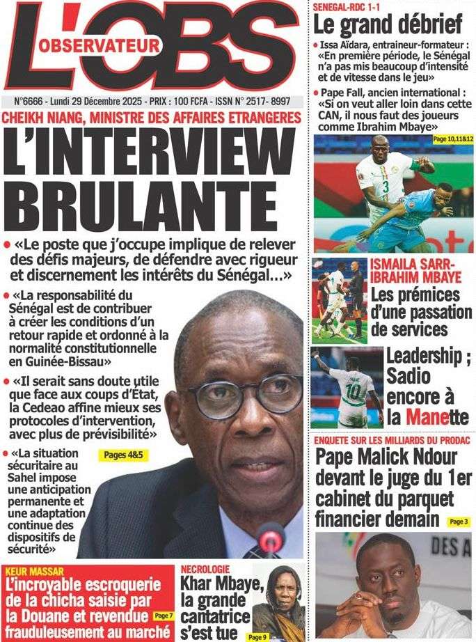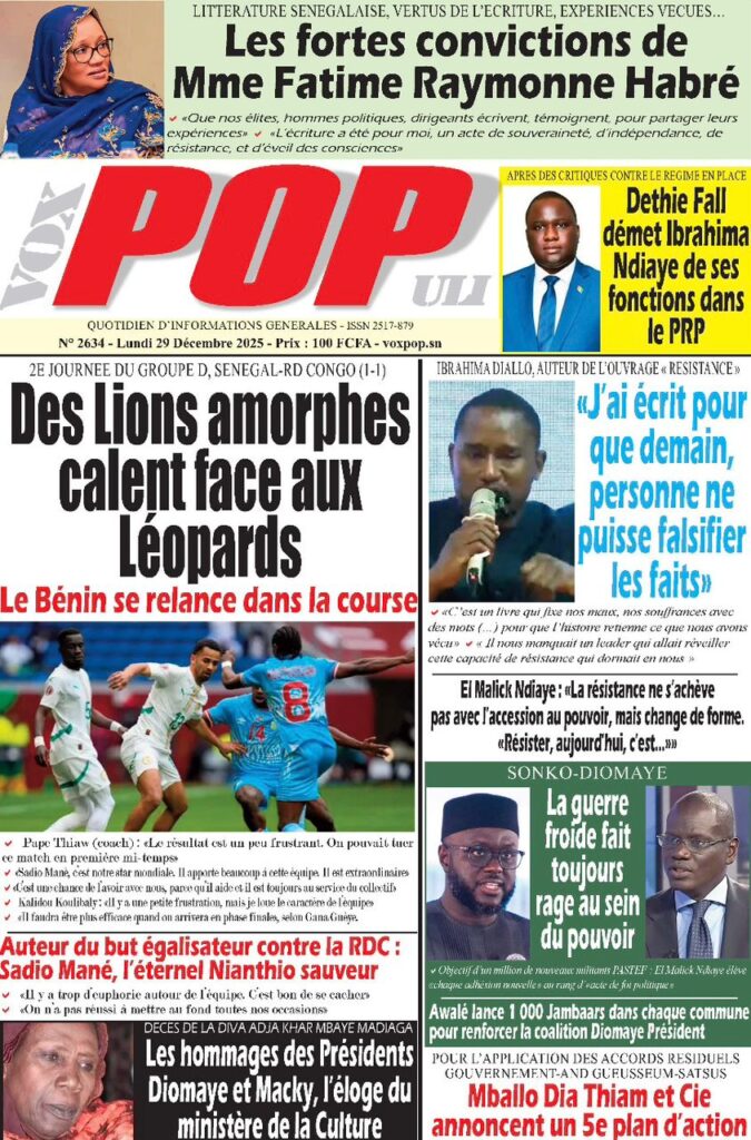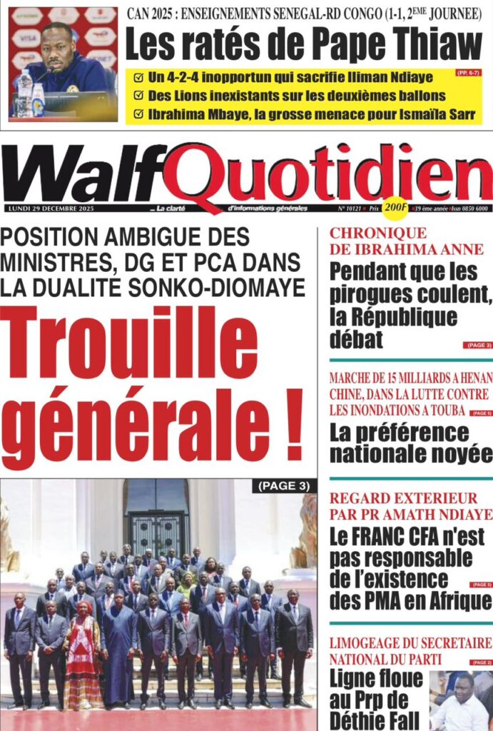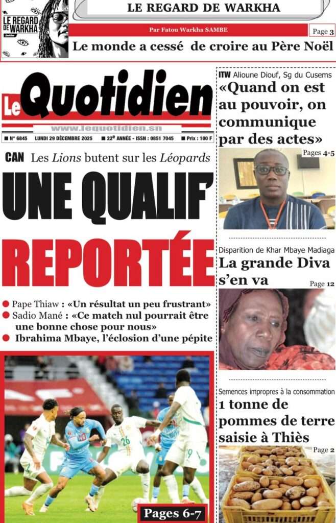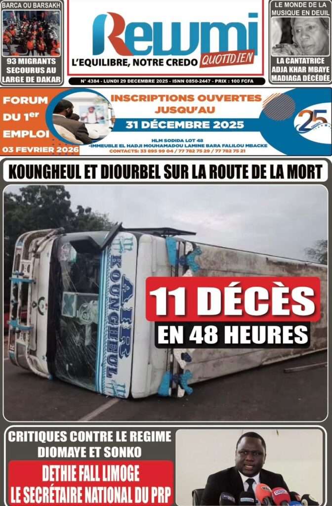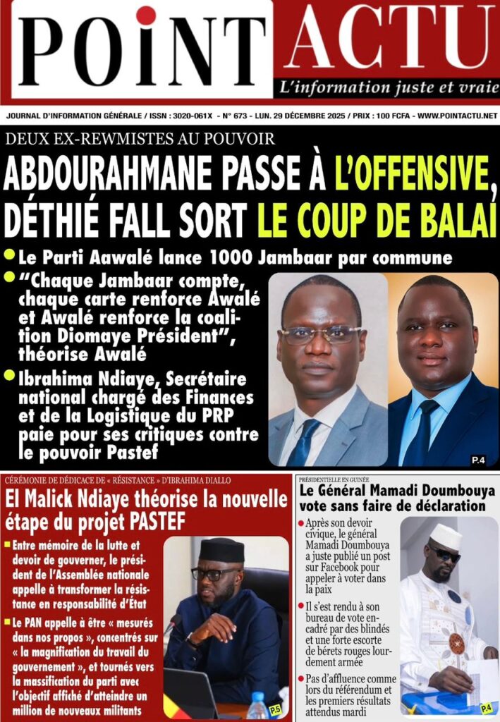 Uncategorized La Une Des Quotidiens – Lundi 29 Décembre 2025 (Avec Ma Revue De Presse) Bour Sine décembre 29, 2025 0 Post navigation Previous: « Le meilleur moment de l’émission Jakaarlo de ce vendredi a été cette communication du Ministre Thierno LO », Ronald Christian KanfoudyNext: Dualité au sommet de l’Etat : l’analyse sans complaisance de Thierno Lo More Stories Uncategorized FADP : Le CDPS dénonce vigoureusement la répartition et saisit l’ONAC Bour Sine avril 10, 2026 0 Uncategorized Sa Thiès bat Modou LÔ et devient le 8e Roi des Arènes de l’histoire Bour Sine avril 5, 2026 0 Uncategorized Durcissement des sanctions contre l’homosexualité : la loi promulguée par le président Diomaye Bour Sine mars 31, 2026 0 Laisser un commentaire Annuler la réponseVotre adresse e-mail ne sera pas publiée. Les champs obligatoires sont indiqués avec *Commentaire * Nom * E-mail * Site web Enregistrer mon nom, mon e-mail et mon site dans le navigateur pour mon prochain commentaire.