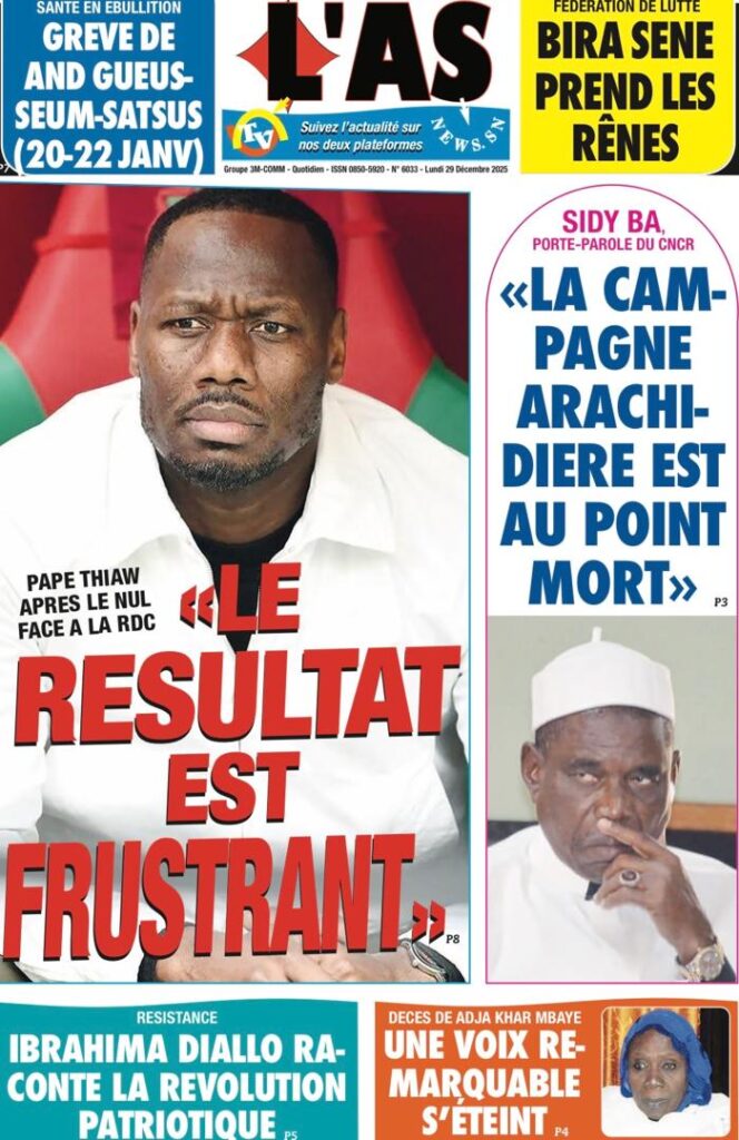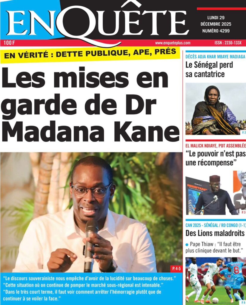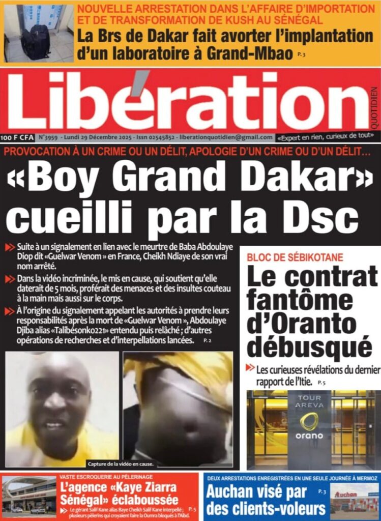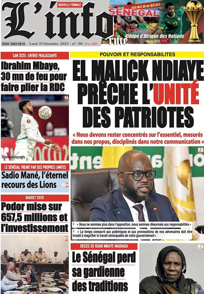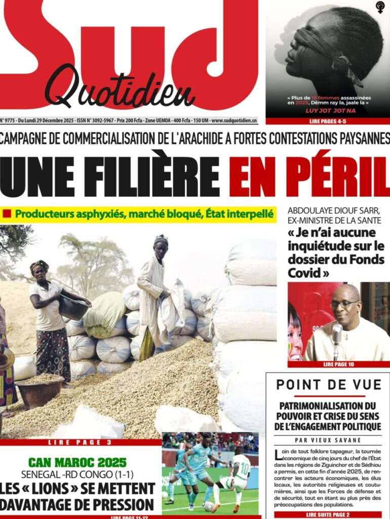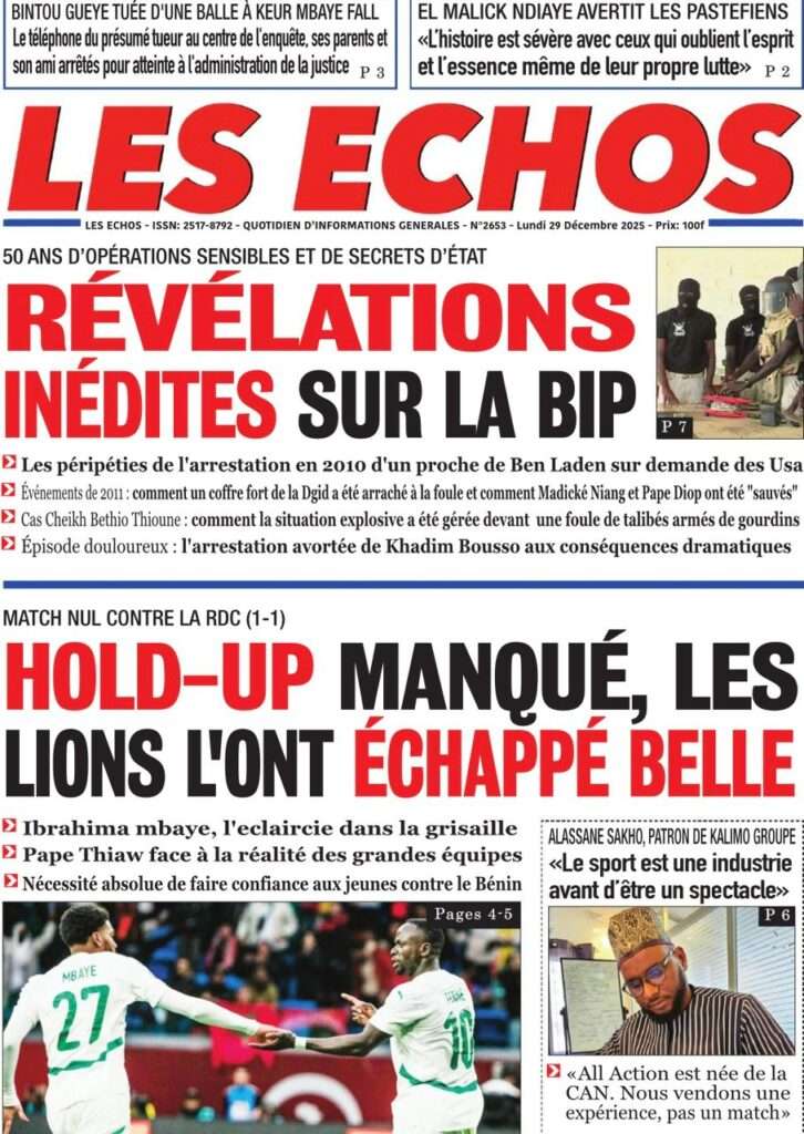 Uncategorized La Une Des Quotidiens – Lundi 29 Décembre 2025 (Avec Ma Revue De Presse) Bour Sine décembre 29, 2025 0 Post navigation Previous: « Le meilleur moment de l’émission Jakaarlo de ce vendredi a été cette communication du Ministre Thierno LO », Ronald Christian KanfoudyNext: Dualité au sommet de l’Etat : l’analyse sans complaisance de Thierno Lo More Stories Uncategorized FADP : Le CDPS dénonce vigoureusement la répartition et saisit l’ONAC Bour Sine avril 10, 2026 0 Uncategorized Sa Thiès bat Modou LÔ et devient le 8e Roi des Arènes de l’histoire Bour Sine avril 5, 2026 0 Uncategorized Durcissement des sanctions contre l’homosexualité : la loi promulguée par le président Diomaye Bour Sine mars 31, 2026 0 Laisser un commentaire Annuler la réponseVotre adresse e-mail ne sera pas publiée. Les champs obligatoires sont indiqués avec *Commentaire * Nom * E-mail * Site web Enregistrer mon nom, mon e-mail et mon site dans le navigateur pour mon prochain commentaire.