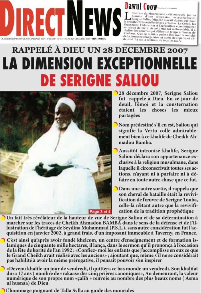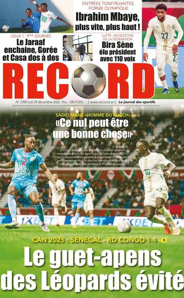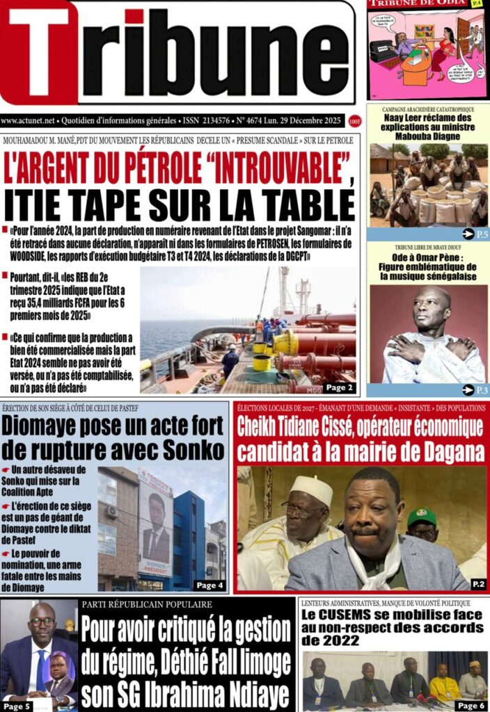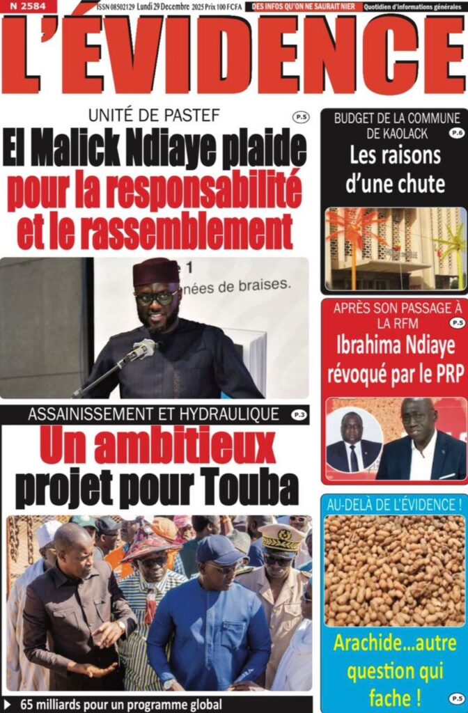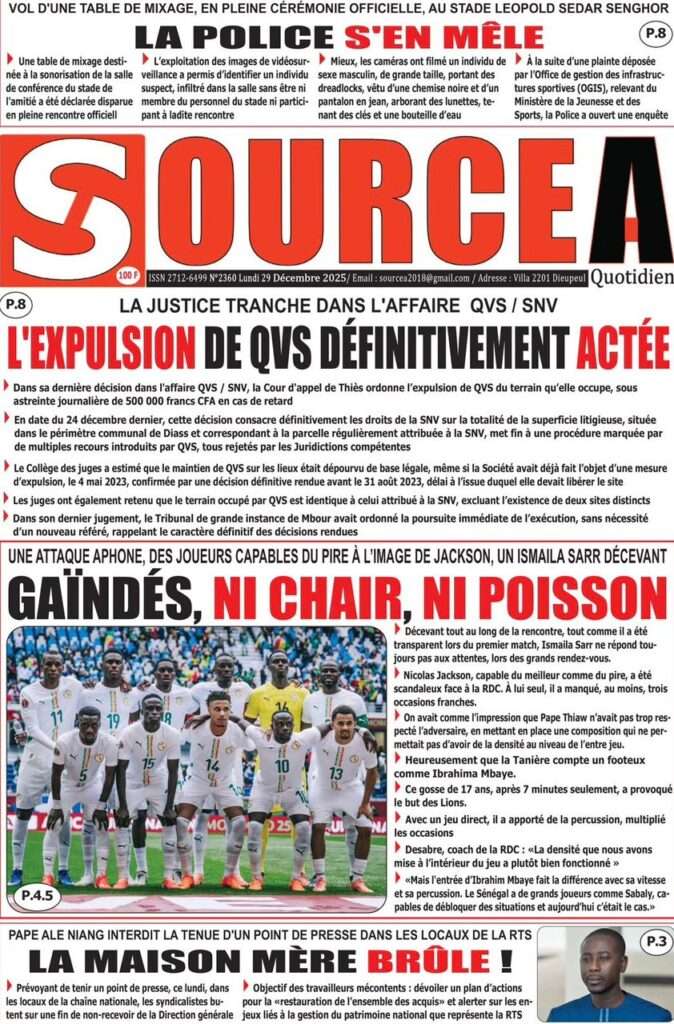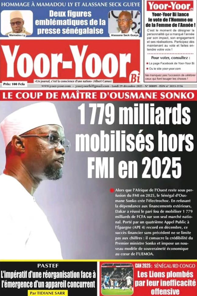 Uncategorized La Une Des Quotidiens – Lundi 29 Décembre 2025 (Avec Ma Revue De Presse) Bour Sine décembre 29, 2025 0 Post navigation Previous: « Le meilleur moment de l’émission Jakaarlo de ce vendredi a été cette communication du Ministre Thierno LO », Ronald Christian KanfoudyNext: Dualité au sommet de l’Etat : l’analyse sans complaisance de Thierno Lo More Stories Uncategorized FADP : Le CDPS dénonce vigoureusement la répartition et saisit l’ONAC Bour Sine avril 10, 2026 0 Uncategorized Sa Thiès bat Modou LÔ et devient le 8e Roi des Arènes de l’histoire Bour Sine avril 5, 2026 0 Uncategorized Durcissement des sanctions contre l’homosexualité : la loi promulguée par le président Diomaye Bour Sine mars 31, 2026 0 Laisser un commentaire Annuler la réponseVotre adresse e-mail ne sera pas publiée. Les champs obligatoires sont indiqués avec *Commentaire * Nom * E-mail * Site web Enregistrer mon nom, mon e-mail et mon site dans le navigateur pour mon prochain commentaire.