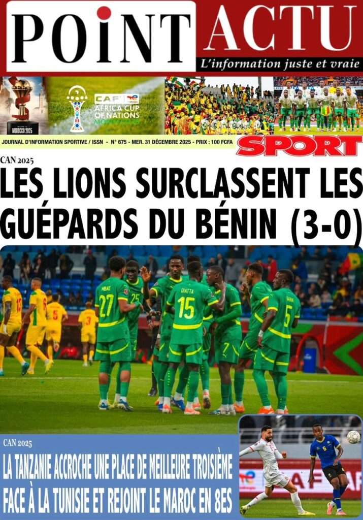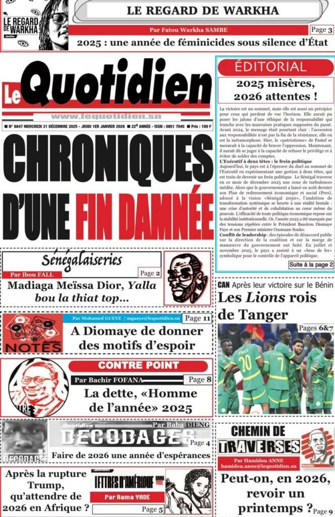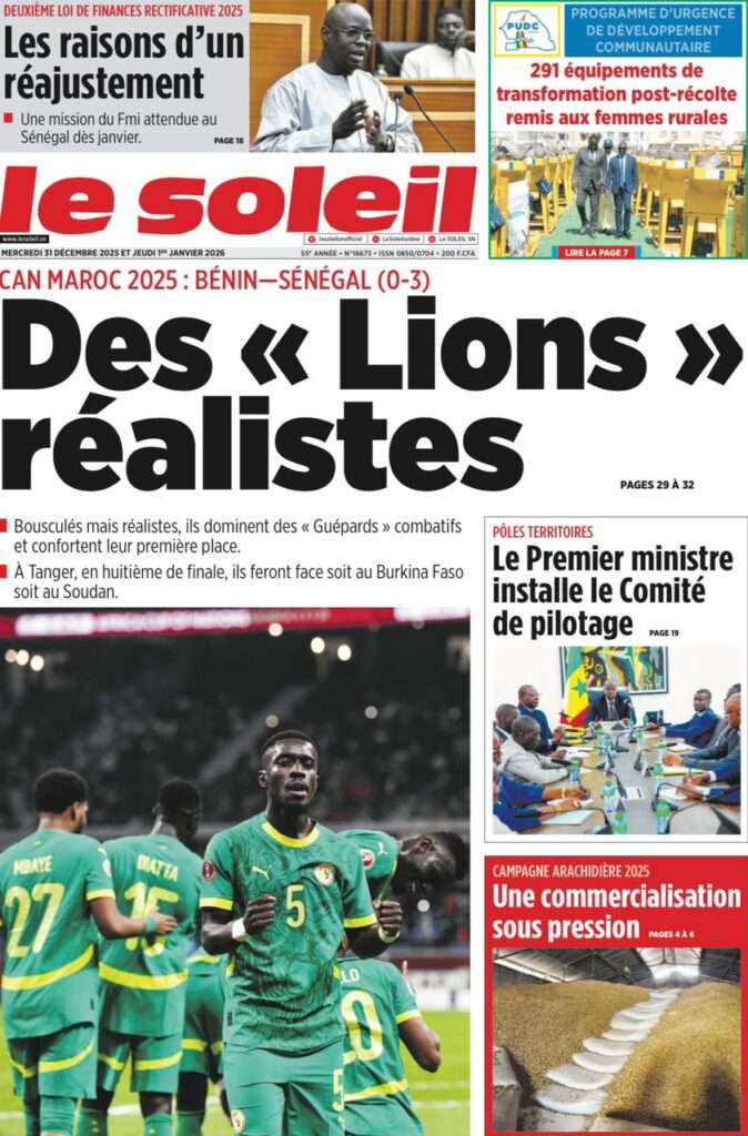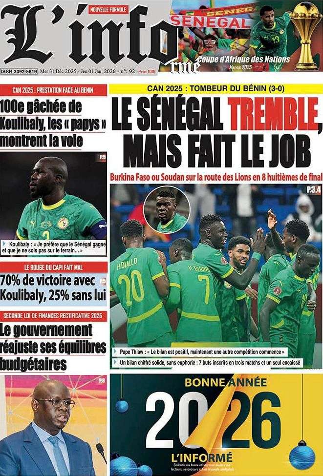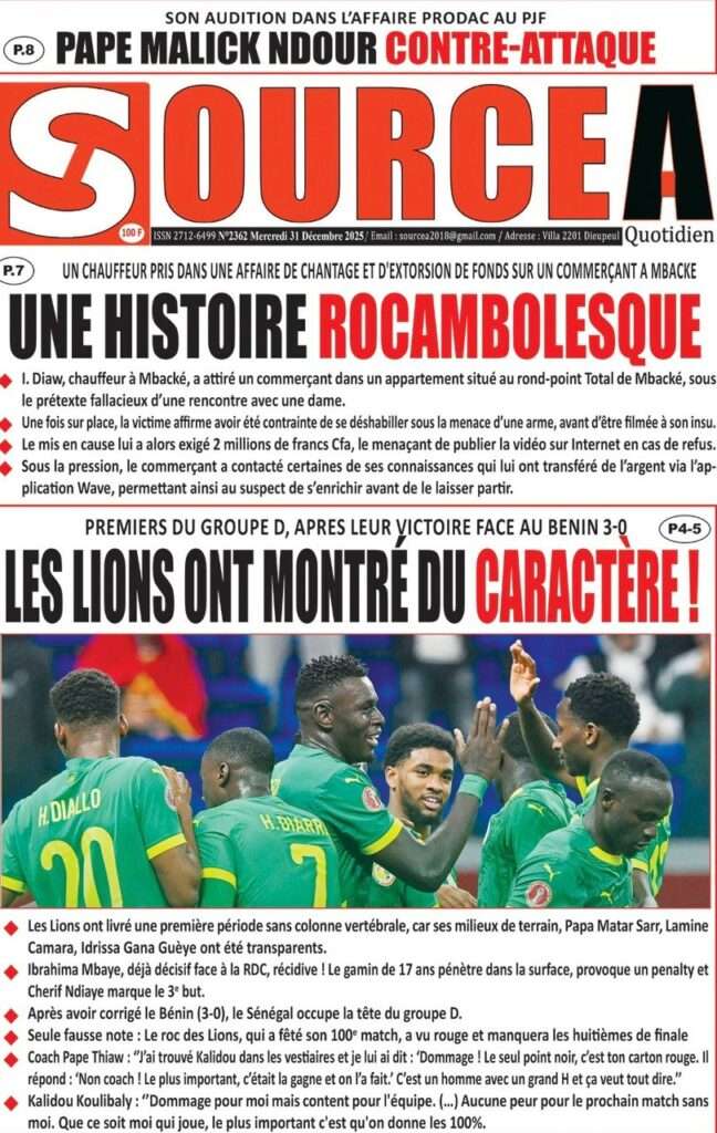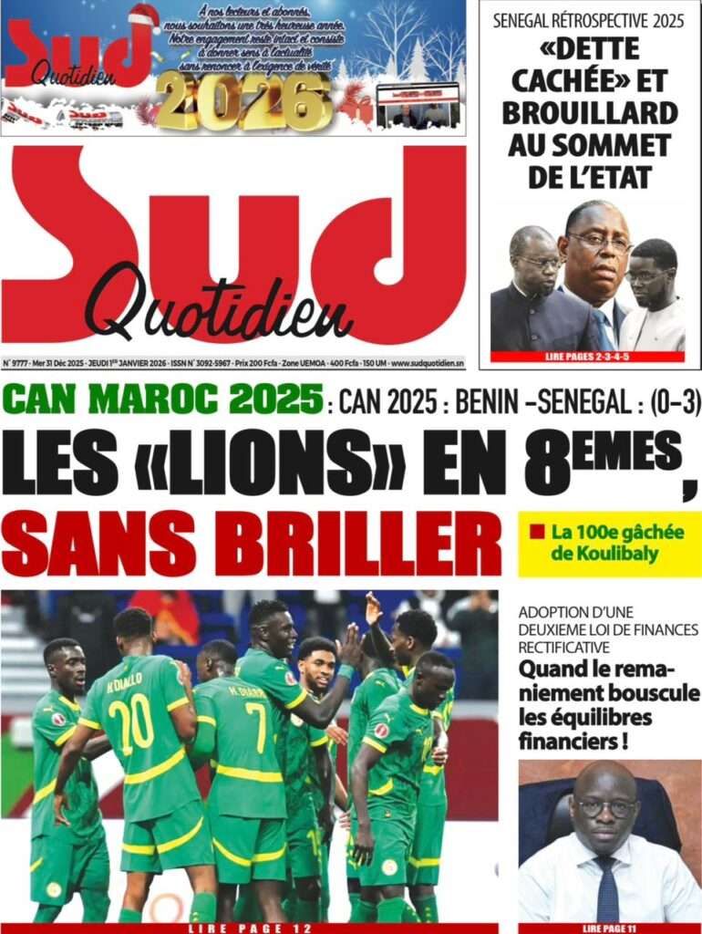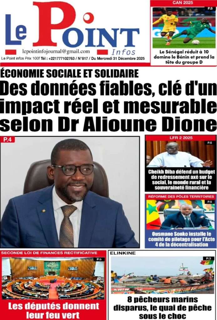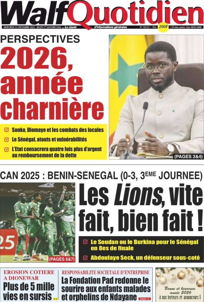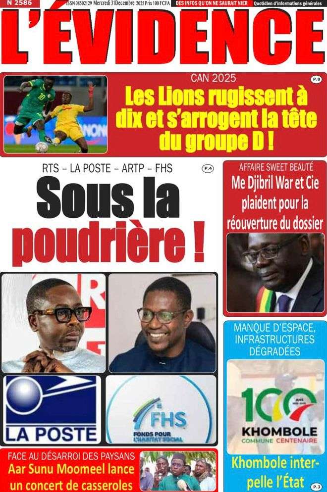 A la Une Actualité La Une Des Quotidiens – Mercredi 31 Décembre 2025 (Avec Ma Revue De Presse) Bour Sine décembre 31, 2025 0 Post navigation Previous: DIRECT – BÉNIN VS SÉNÉGAL – CAN 2025 MAROCNext: La Une Des Quotidiens – Vendredi 02 Janvier 2026 (Avec Ma Revue De Presse) More Stories A la Une Actualité Politique Ce que change la nouvelle loi électorale adoptée par les députés Bour Sine avril 28, 2026 0 A la Une Actualité Politique « Ensemble, nous sommes une force »Par Hamidou Thiaw, Président du MPR Bour Sine avril 28, 2026 0 A la Une Actualité Pape Malick Ndour envoyé en prison Bour Sine avril 28, 2026 0 Laisser un commentaire Annuler la réponseVotre adresse e-mail ne sera pas publiée. Les champs obligatoires sont indiqués avec *Commentaire * Nom * E-mail * Site web Enregistrer mon nom, mon e-mail et mon site dans le navigateur pour mon prochain commentaire.