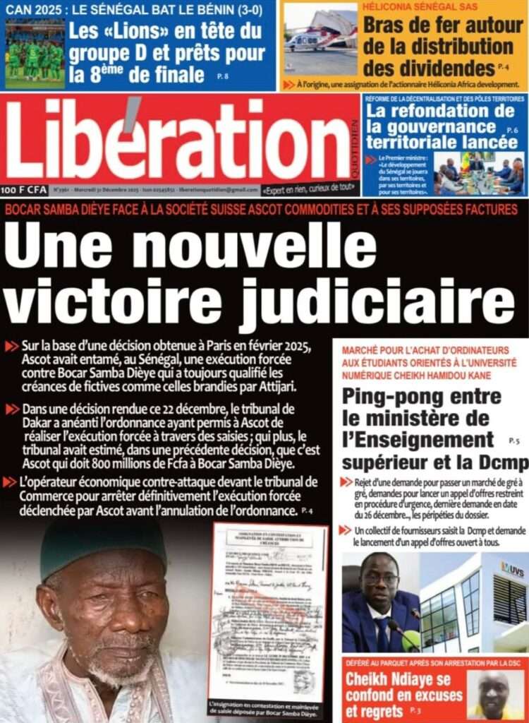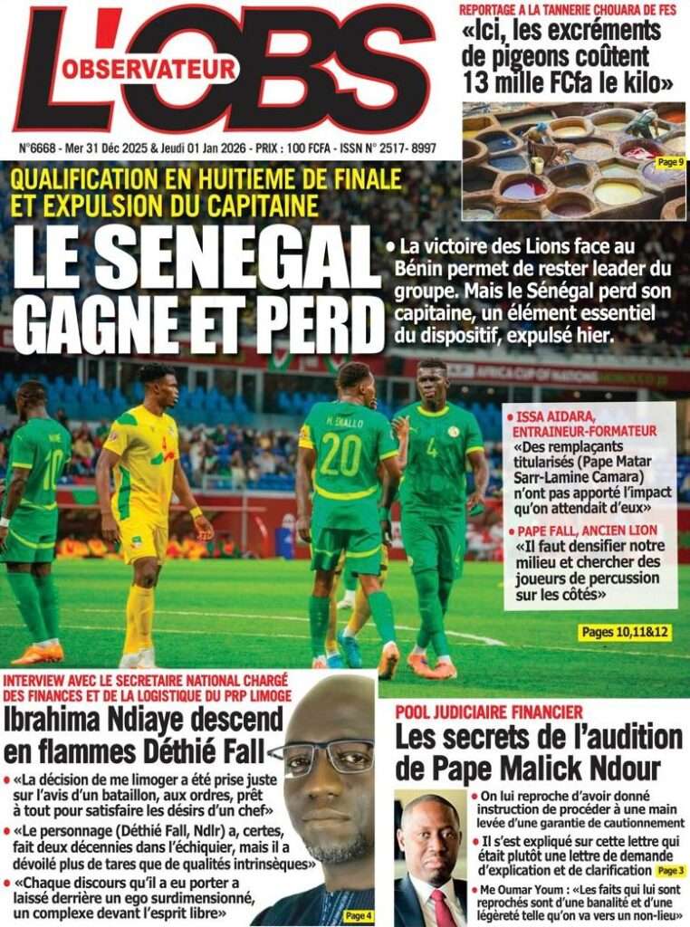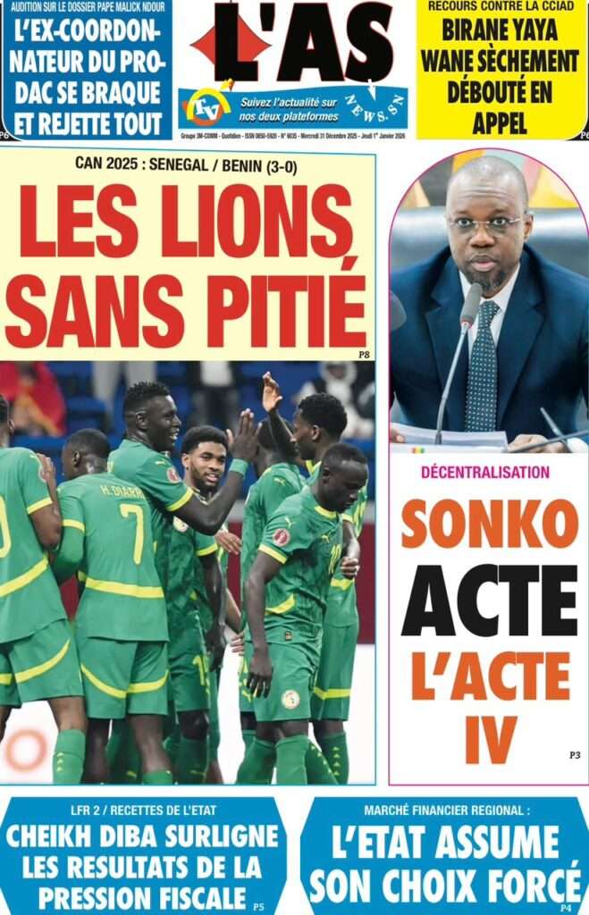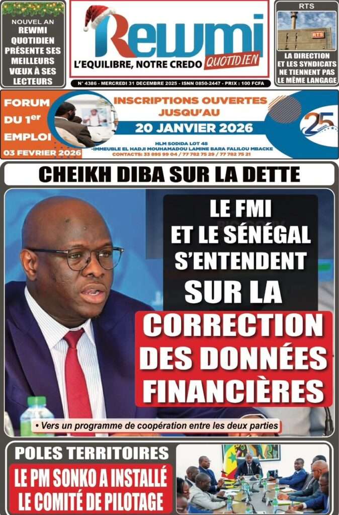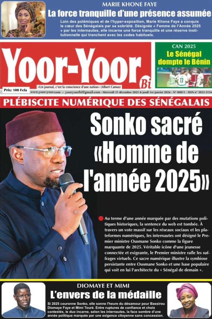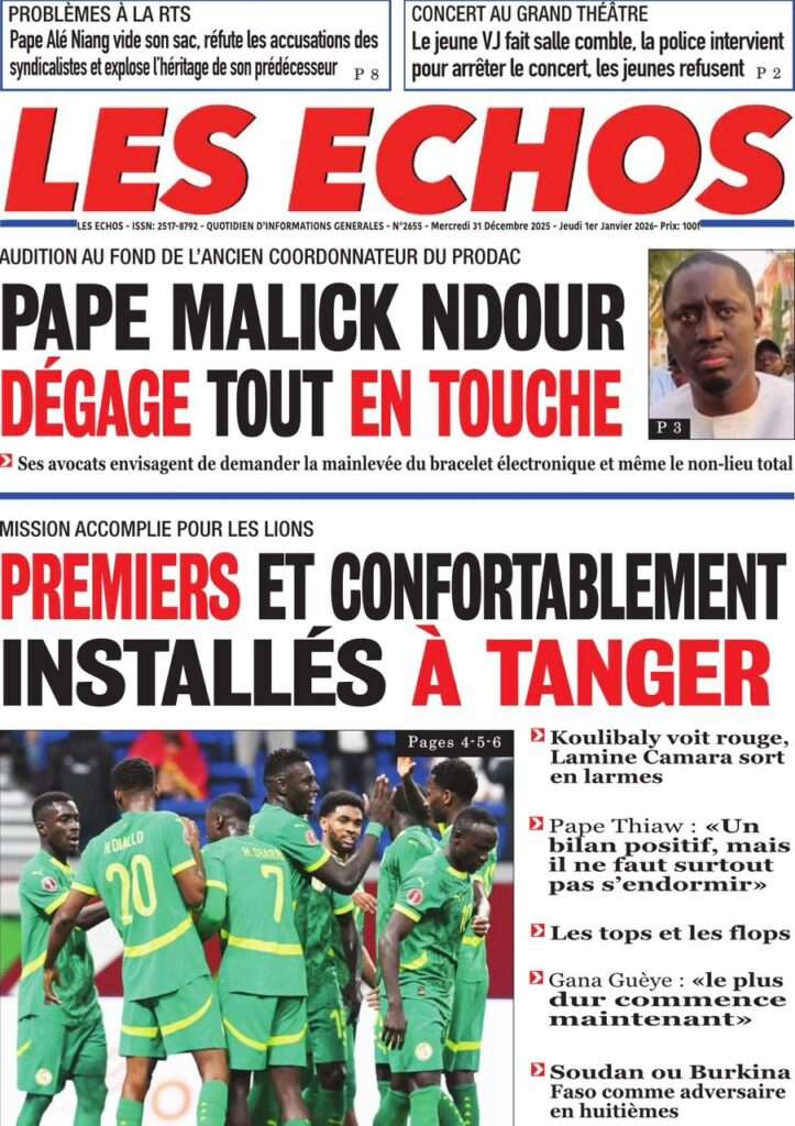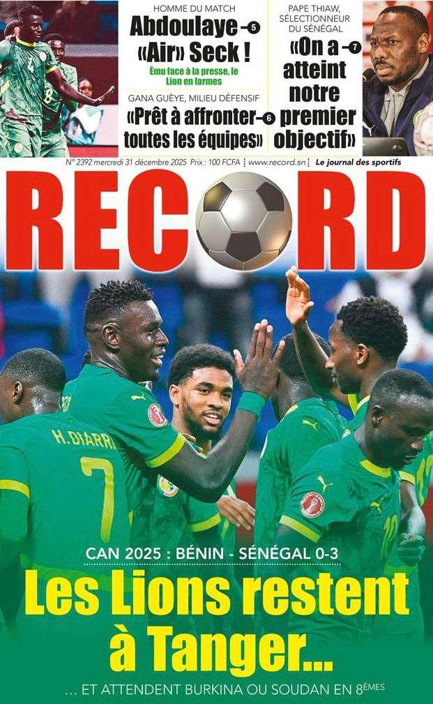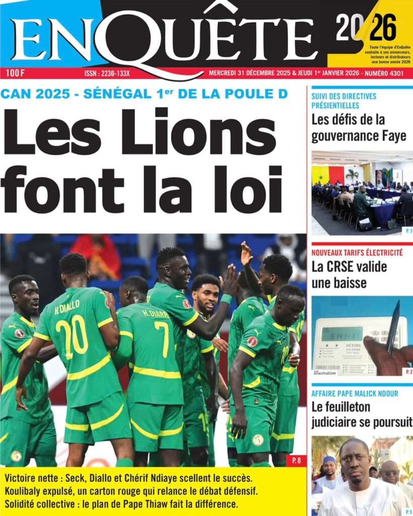 A la Une Actualité La Une Des Quotidiens – Mercredi 31 Décembre 2025 (Avec Ma Revue De Presse) Bour Sine décembre 31, 2025 0 Post navigation Previous: DIRECT – BÉNIN VS SÉNÉGAL – CAN 2025 MAROCNext: La Une Des Quotidiens – Vendredi 02 Janvier 2026 (Avec Ma Revue De Presse) More Stories A la Une Actualité Politique Ce que change la nouvelle loi électorale adoptée par les députés Bour Sine avril 28, 2026 0 A la Une Actualité Politique « Ensemble, nous sommes une force »Par Hamidou Thiaw, Président du MPR Bour Sine avril 28, 2026 0 A la Une Actualité Pape Malick Ndour envoyé en prison Bour Sine avril 28, 2026 0 Laisser un commentaire Annuler la réponseVotre adresse e-mail ne sera pas publiée. Les champs obligatoires sont indiqués avec *Commentaire * Nom * E-mail * Site web Enregistrer mon nom, mon e-mail et mon site dans le navigateur pour mon prochain commentaire.