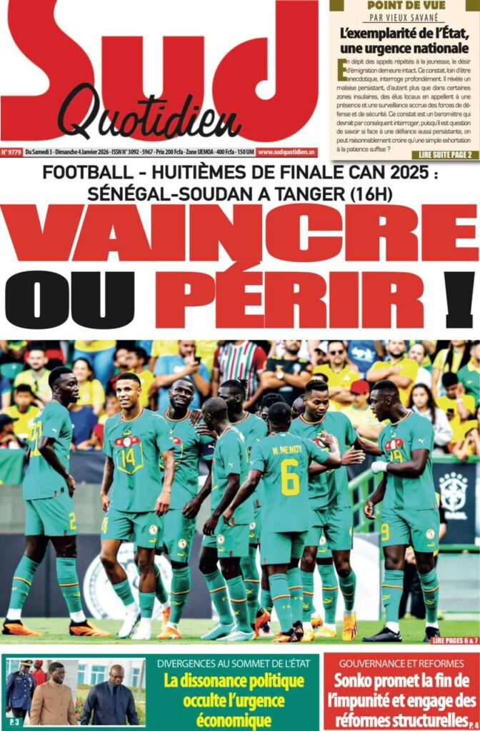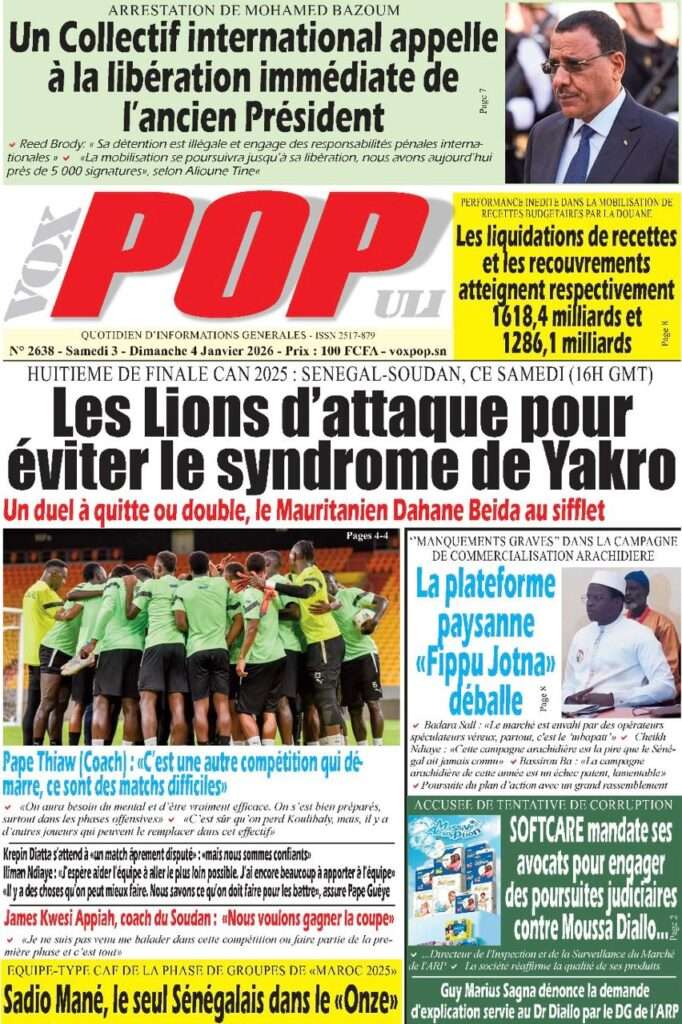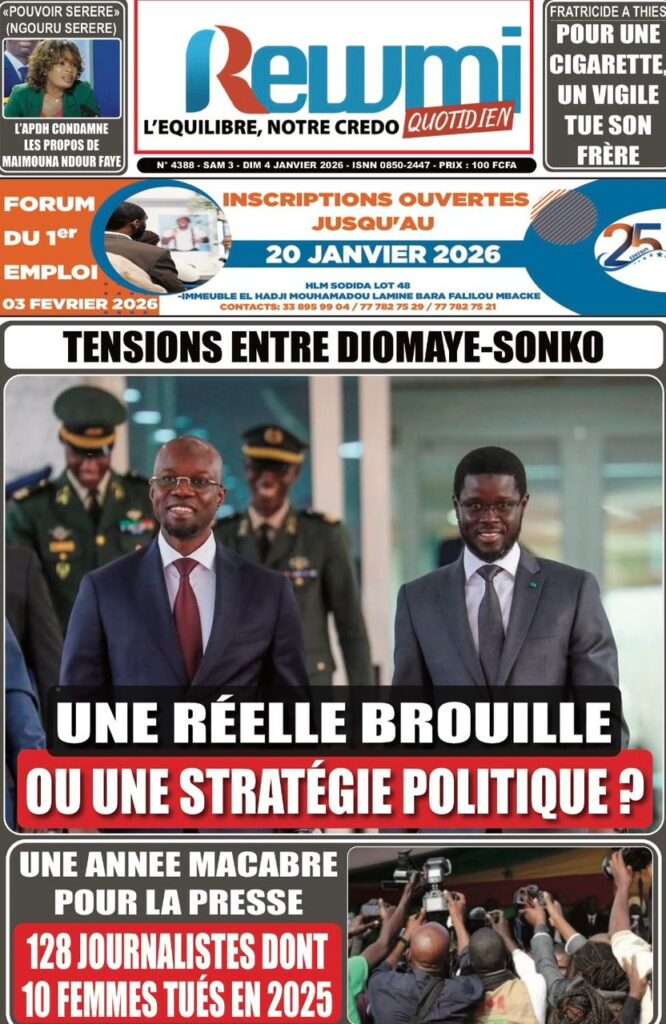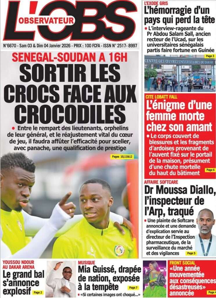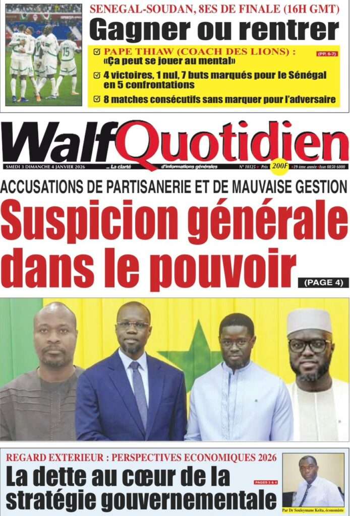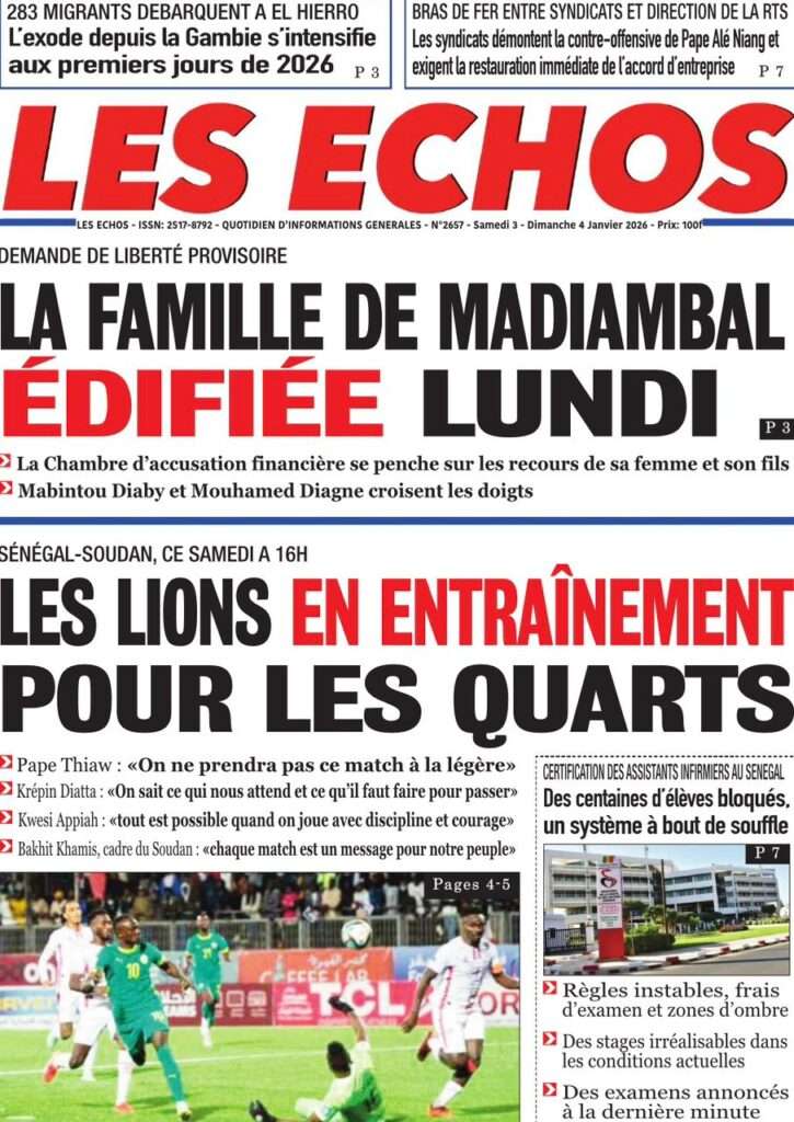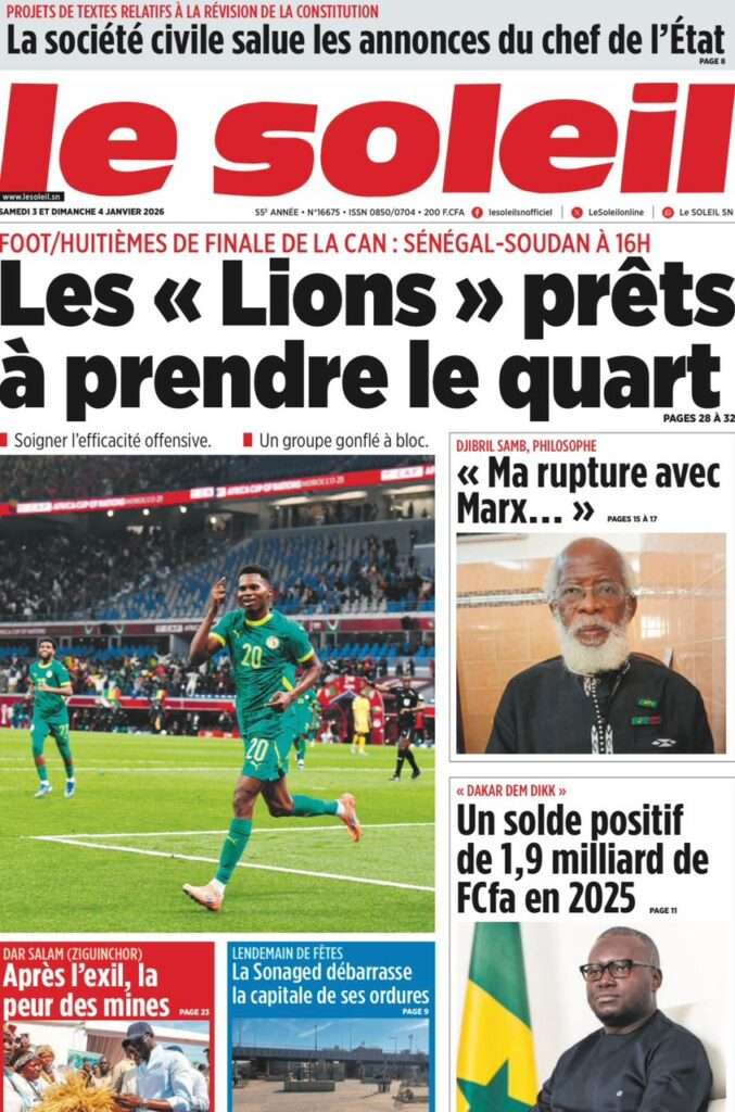 A la Une Actualité La Une Des Quotidiens – Samedi 03 Janvier 2026 (Avec Ma Revue De Presse) Bour Sine janvier 3, 2026 0 Post navigation Previous: NICOLAS JACKSON : LE BANC N’EST PAS LA SOLUTION (Par Dr Papa Abdoulaye Seck)Next: « Il est temps de se dire une vérité simple, mais essentielle, sans faux-semblants », martèle Thierno Lo More Stories A la Une Actualité Politique Ce que change la nouvelle loi électorale adoptée par les députés Bour Sine avril 28, 2026 0 A la Une Actualité Politique « Ensemble, nous sommes une force »Par Hamidou Thiaw, Président du MPR Bour Sine avril 28, 2026 0 A la Une Actualité Pape Malick Ndour envoyé en prison Bour Sine avril 28, 2026 0 Laisser un commentaire Annuler la réponseVotre adresse e-mail ne sera pas publiée. Les champs obligatoires sont indiqués avec *Commentaire * Nom * E-mail * Site web Enregistrer mon nom, mon e-mail et mon site dans le navigateur pour mon prochain commentaire.