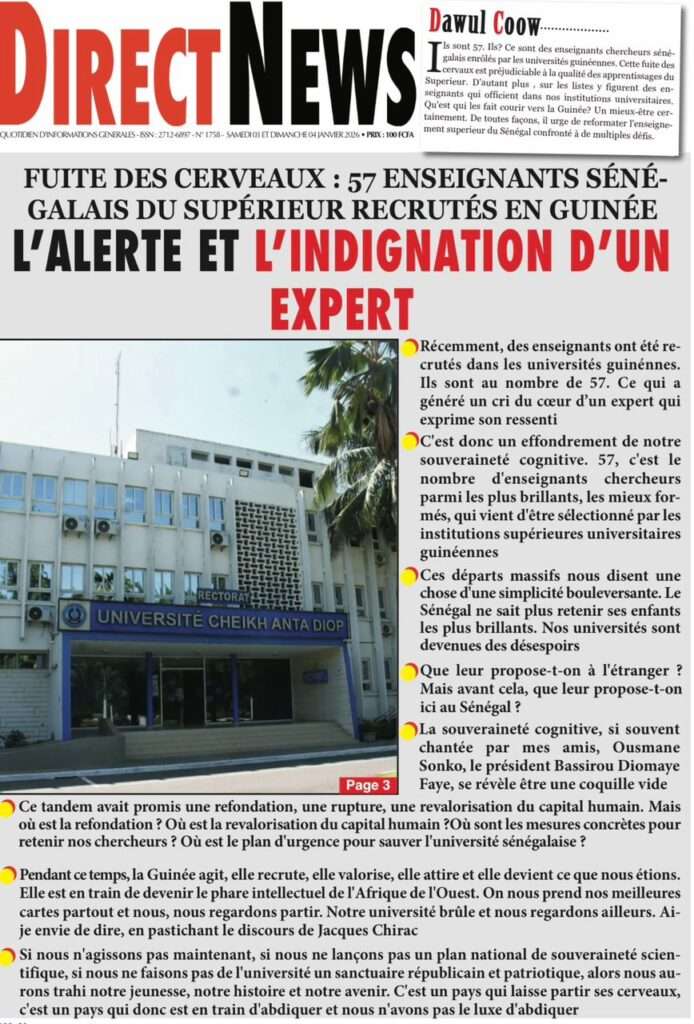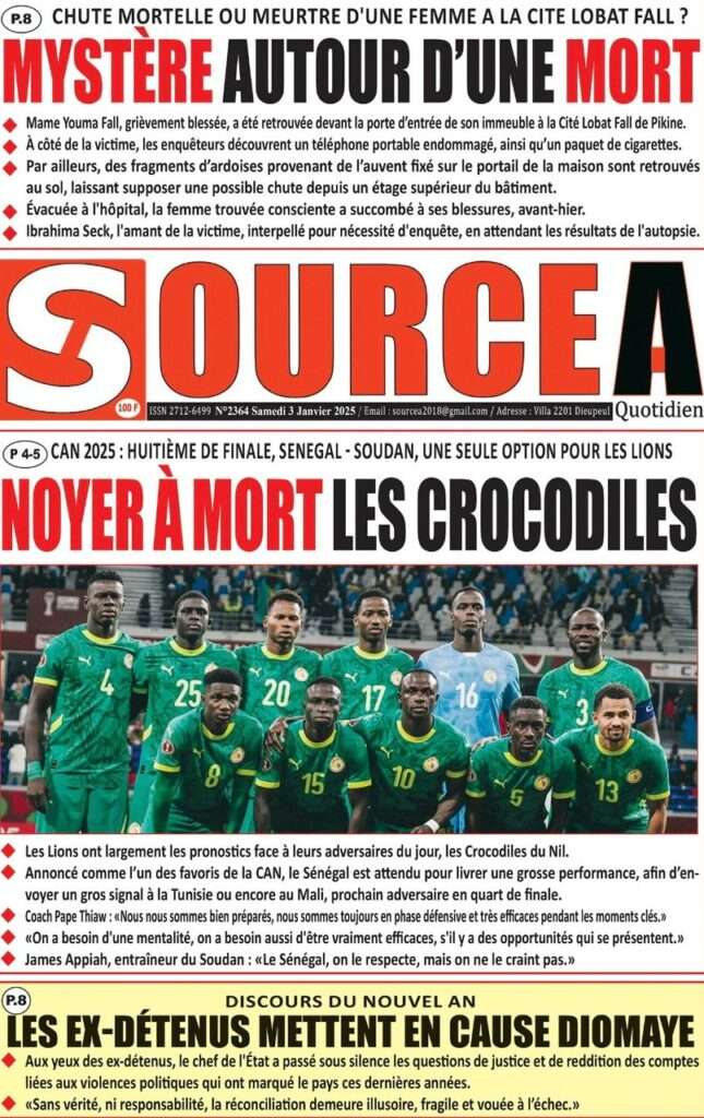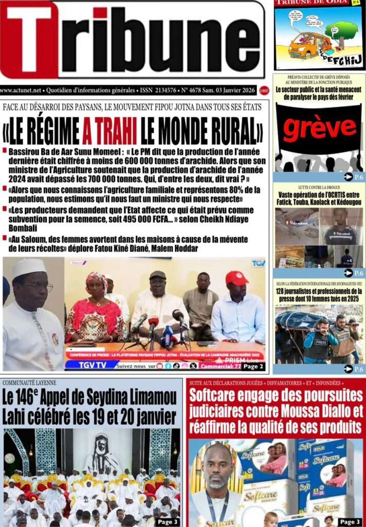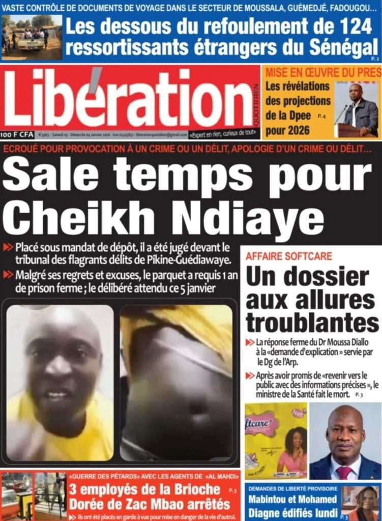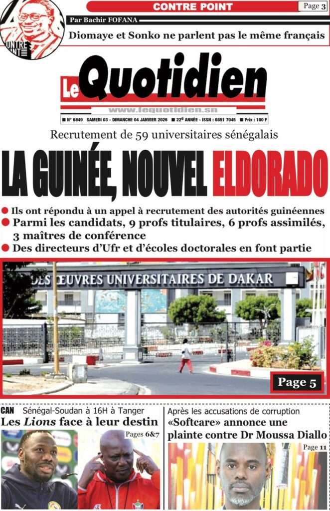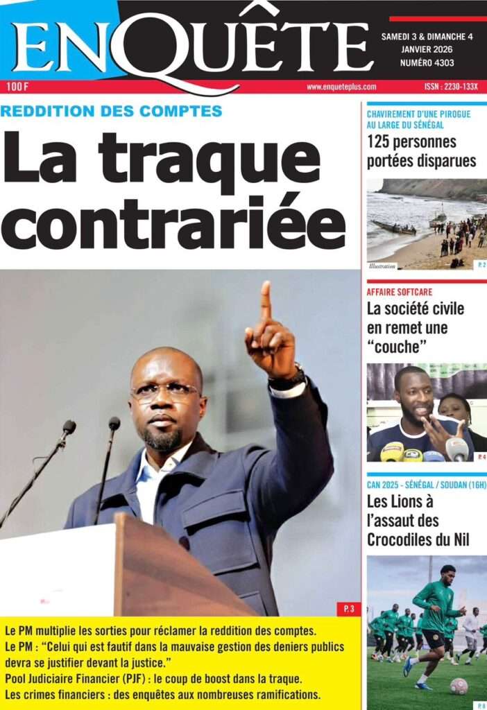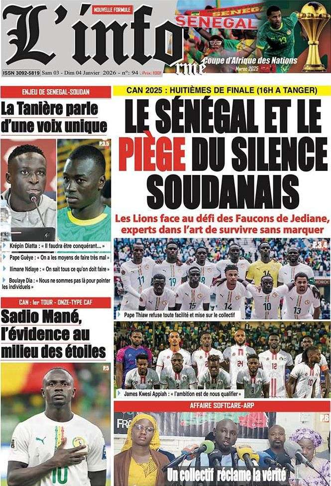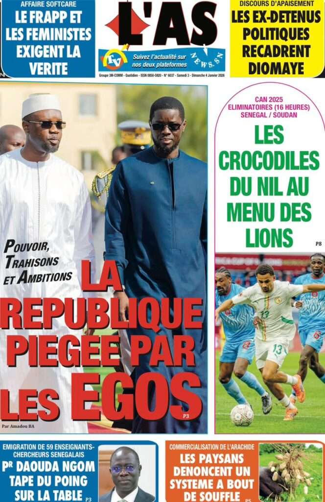 A la Une Actualité La Une Des Quotidiens – Samedi 03 Janvier 2026 (Avec Ma Revue De Presse) Bour Sine janvier 3, 2026 0 Post navigation Previous: NICOLAS JACKSON : LE BANC N’EST PAS LA SOLUTION (Par Dr Papa Abdoulaye Seck)Next: « Il est temps de se dire une vérité simple, mais essentielle, sans faux-semblants », martèle Thierno Lo More Stories A la Une Actualité Politique Ce que change la nouvelle loi électorale adoptée par les députés Bour Sine avril 28, 2026 0 A la Une Actualité Politique « Ensemble, nous sommes une force »Par Hamidou Thiaw, Président du MPR Bour Sine avril 28, 2026 0 A la Une Actualité Pape Malick Ndour envoyé en prison Bour Sine avril 28, 2026 0 Laisser un commentaire Annuler la réponseVotre adresse e-mail ne sera pas publiée. Les champs obligatoires sont indiqués avec *Commentaire * Nom * E-mail * Site web Enregistrer mon nom, mon e-mail et mon site dans le navigateur pour mon prochain commentaire.