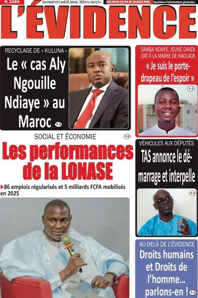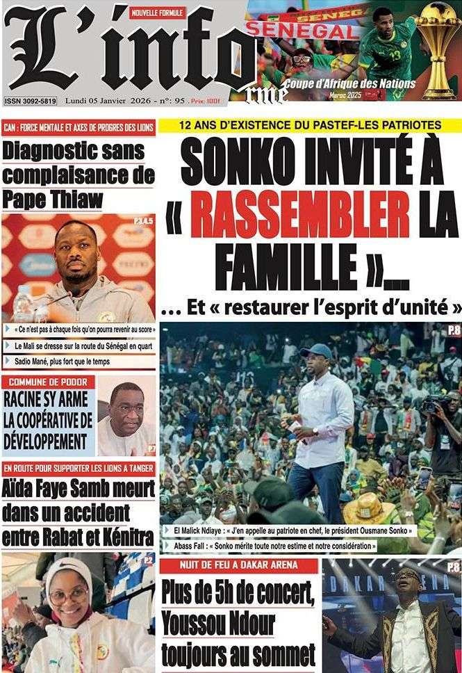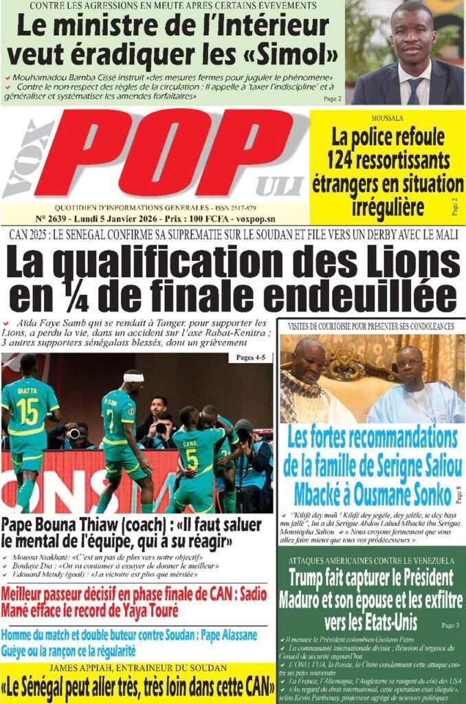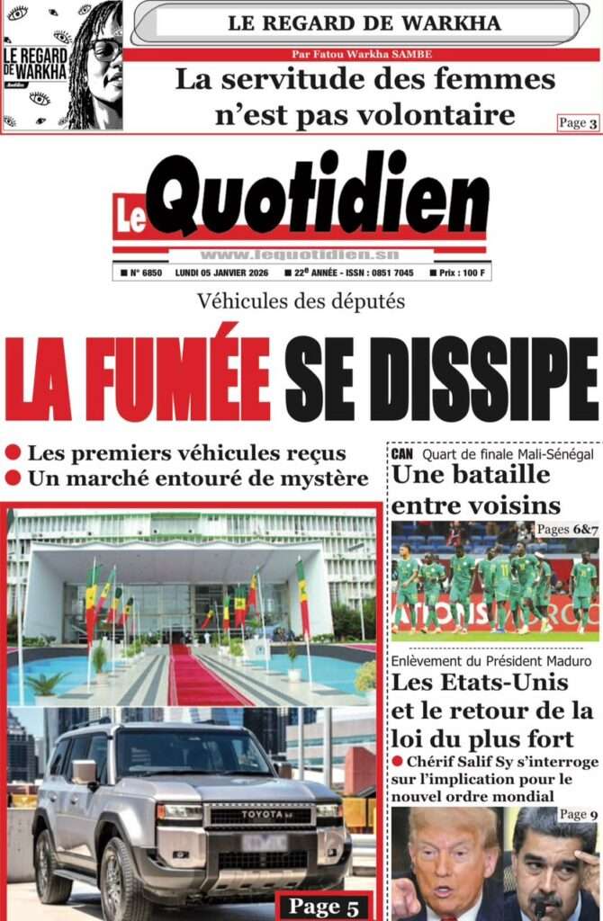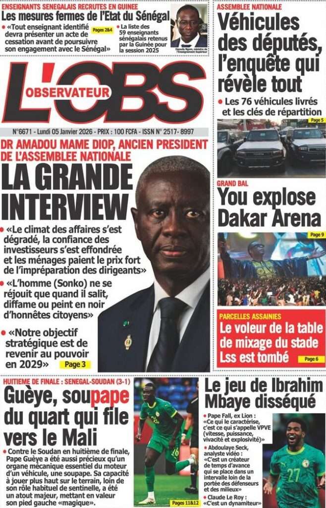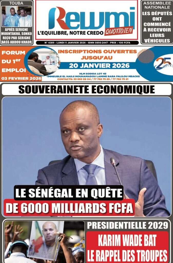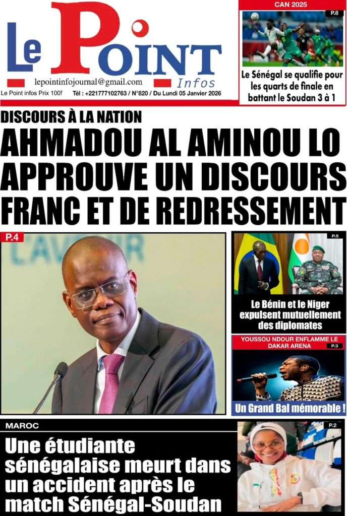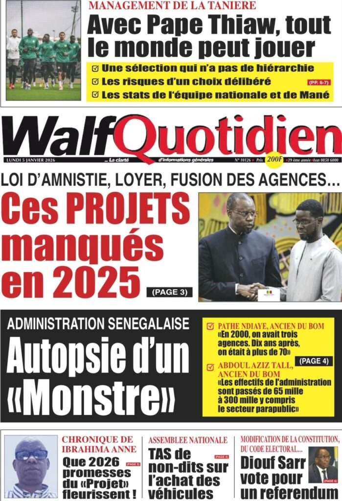 A la Une Actualité La Une Des Quotidiens – Lundi 05 Janvier 2026 (Avec Ma Revue De Presse) Bour Sine janvier 5, 2026 0 Post navigation Previous: Réformes administratives : le problème n’est pas le système, mais l’autoritéNext: Quand la puissance humilie les peuples et enterre le droit international More Stories A la Une Actualité Politique Ce que change la nouvelle loi électorale adoptée par les députés Bour Sine avril 28, 2026 0 A la Une Actualité Politique « Ensemble, nous sommes une force »Par Hamidou Thiaw, Président du MPR Bour Sine avril 28, 2026 0 A la Une Actualité Pape Malick Ndour envoyé en prison Bour Sine avril 28, 2026 0 Laisser un commentaire Annuler la réponseVotre adresse e-mail ne sera pas publiée. Les champs obligatoires sont indiqués avec *Commentaire * Nom * E-mail * Site web Enregistrer mon nom, mon e-mail et mon site dans le navigateur pour mon prochain commentaire.