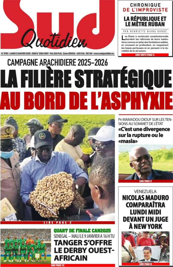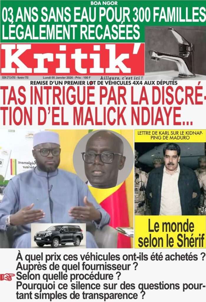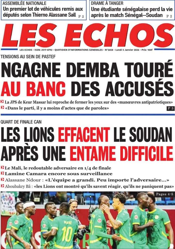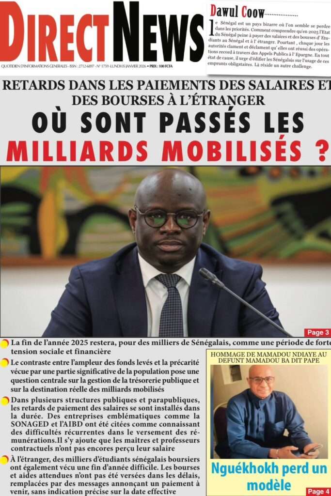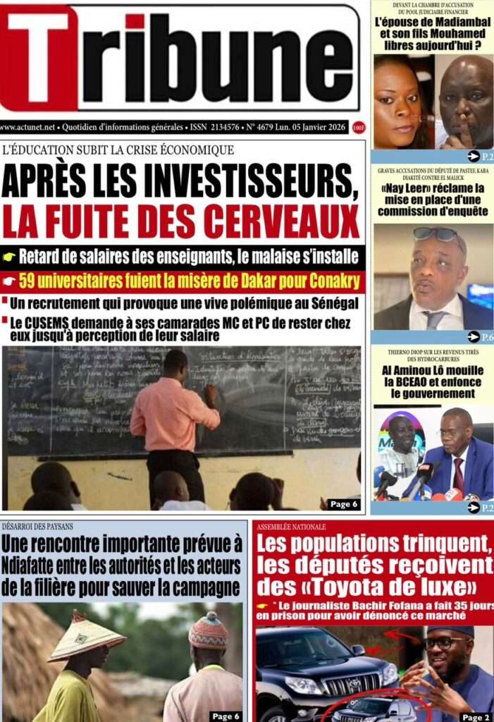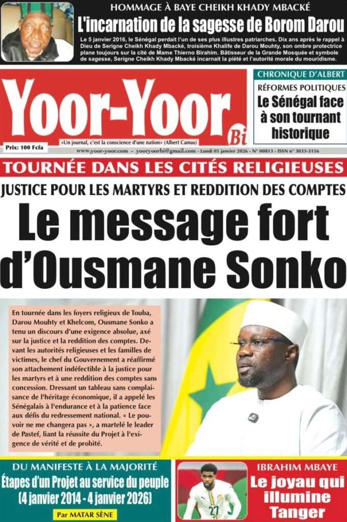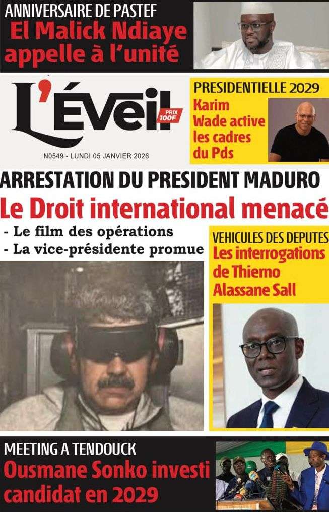A la Une Actualité La Une Des Quotidiens – Lundi 05 Janvier 2026 (Avec Ma Revue De Presse) Bour Sine janvier 5, 2026 0 Post navigation Previous: Réformes administratives : le problème n’est pas le système, mais l’autoritéNext: Quand la puissance humilie les peuples et enterre le droit international More Stories A la Une Actualité Politique Ce que change la nouvelle loi électorale adoptée par les députés Bour Sine avril 28, 2026 0 A la Une Actualité Politique « Ensemble, nous sommes une force »Par Hamidou Thiaw, Président du MPR Bour Sine avril 28, 2026 0 A la Une Actualité Pape Malick Ndour envoyé en prison Bour Sine avril 28, 2026 0 Laisser un commentaire Annuler la réponseVotre adresse e-mail ne sera pas publiée. Les champs obligatoires sont indiqués avec *Commentaire * Nom * E-mail * Site web Enregistrer mon nom, mon e-mail et mon site dans le navigateur pour mon prochain commentaire.