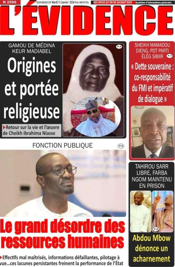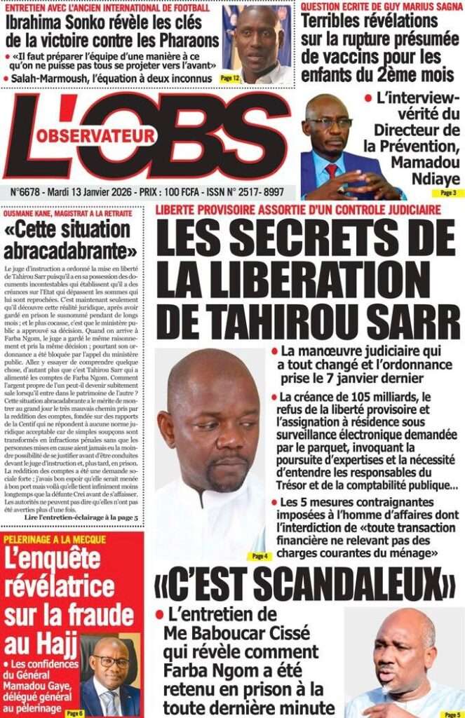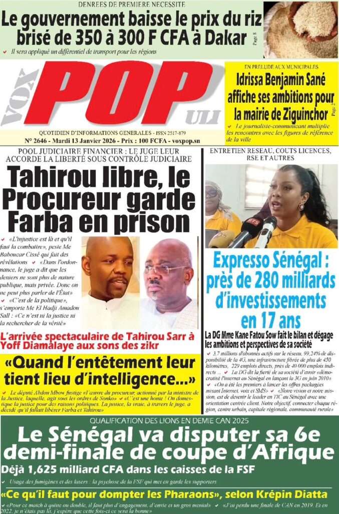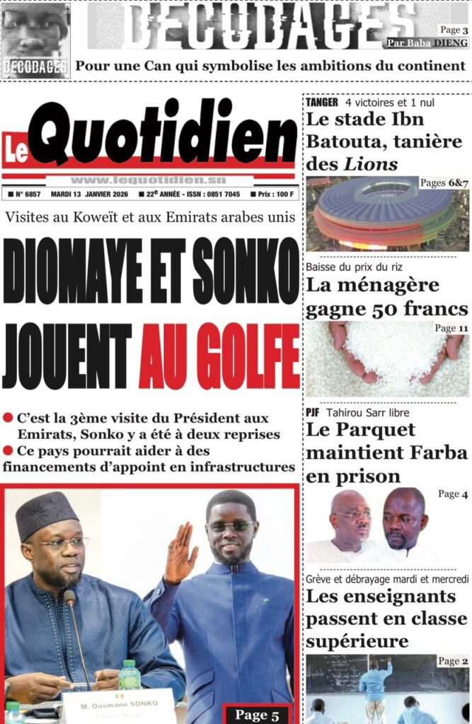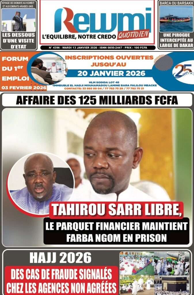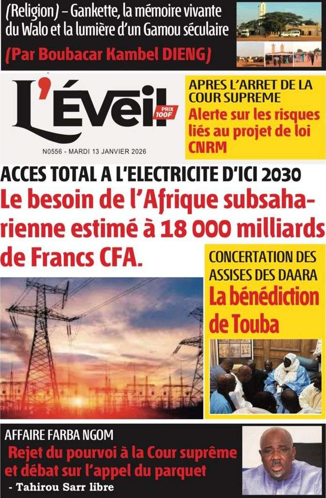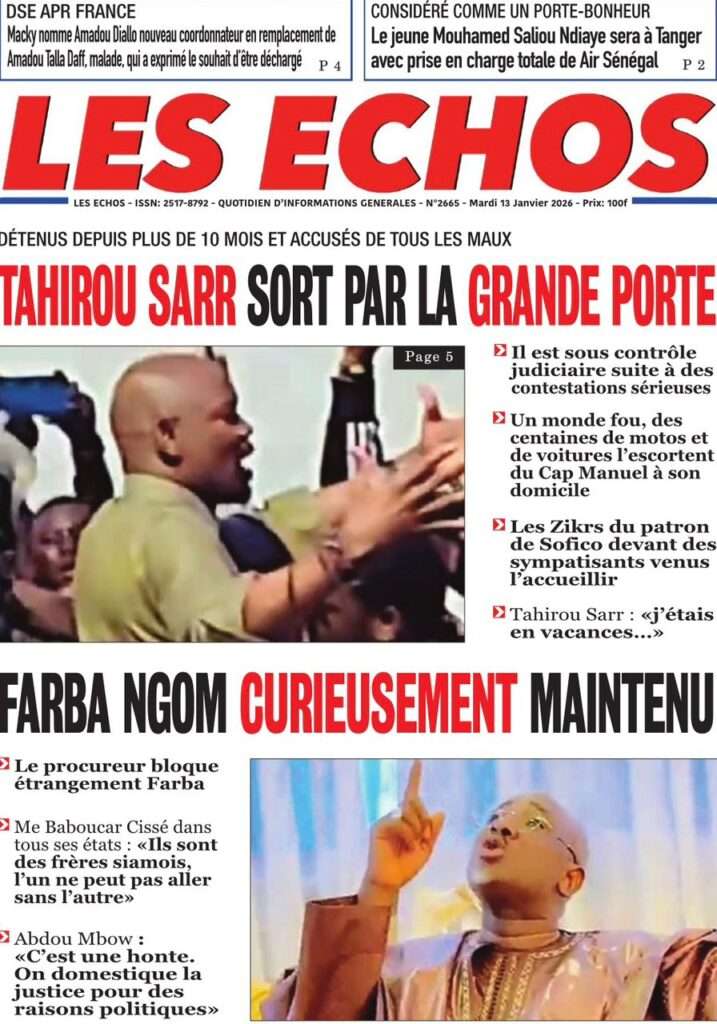 A la Une Actualité La Une Des Quotidiens – Mardi 13 Janvier 2026 (Avec Ma Revue De Presse) Bour Sine janvier 13, 2026 0 Post navigation Previous: Liberté provisoire : Farba Ngom reste en prisonNext: La revanche de la géographie ou l’Afrique face au réveil brutal de l’Histoire – Par Thierno LO More Stories A la Une Actualité Politique Ce que change la nouvelle loi électorale adoptée par les députés Bour Sine avril 28, 2026 0 A la Une Actualité Politique « Ensemble, nous sommes une force »Par Hamidou Thiaw, Président du MPR Bour Sine avril 28, 2026 0 A la Une Actualité Pape Malick Ndour envoyé en prison Bour Sine avril 28, 2026 0 Laisser un commentaire Annuler la réponseVotre adresse e-mail ne sera pas publiée. Les champs obligatoires sont indiqués avec *Commentaire * Nom * E-mail * Site web Enregistrer mon nom, mon e-mail et mon site dans le navigateur pour mon prochain commentaire.