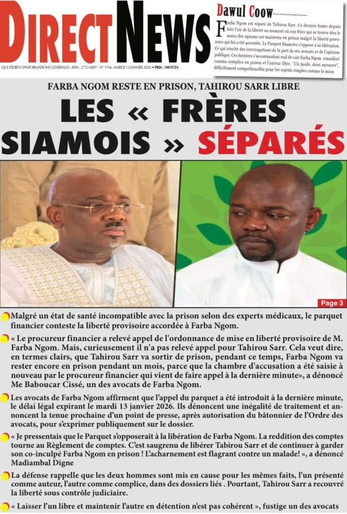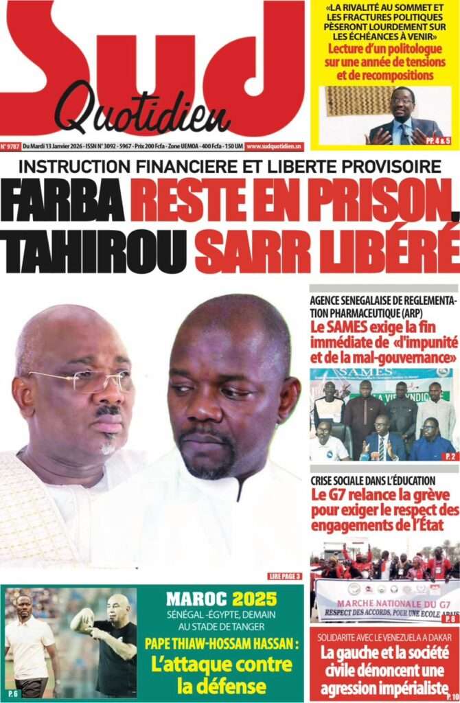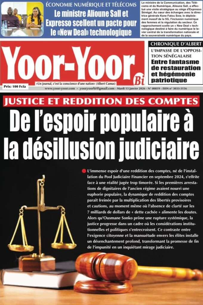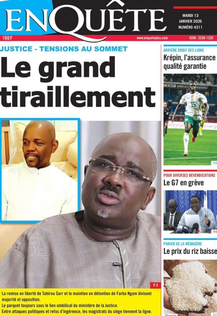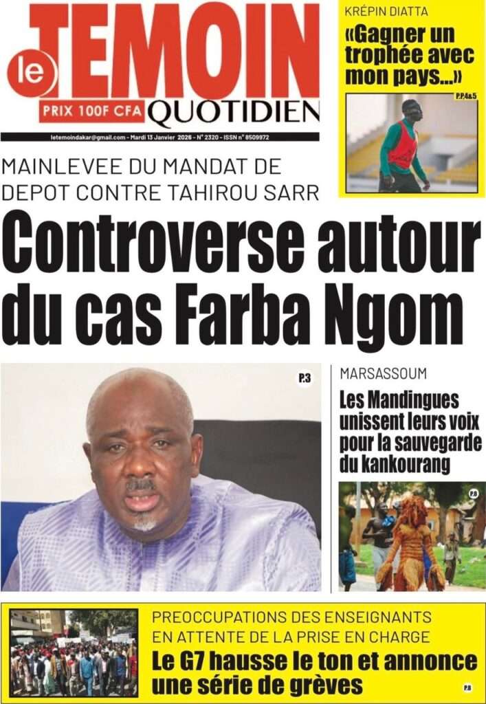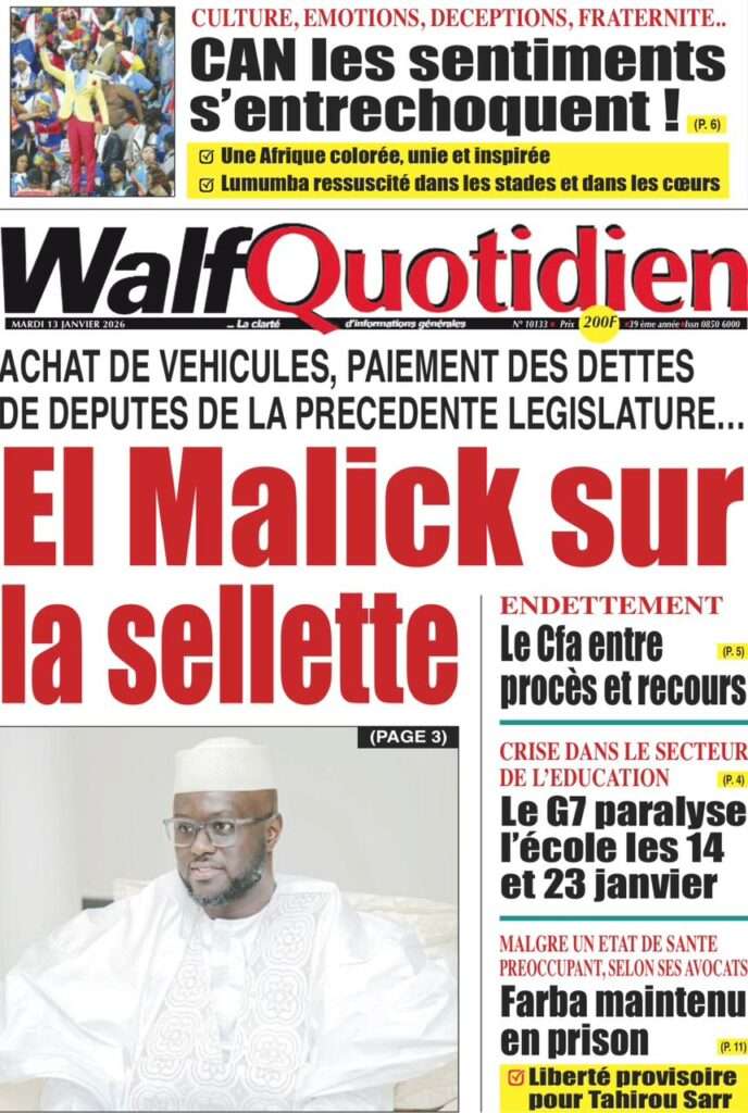 A la Une Actualité La Une Des Quotidiens – Mardi 13 Janvier 2026 (Avec Ma Revue De Presse) Bour Sine janvier 13, 2026 0 Post navigation Previous: Liberté provisoire : Farba Ngom reste en prisonNext: La revanche de la géographie ou l’Afrique face au réveil brutal de l’Histoire – Par Thierno LO More Stories A la Une Actualité Politique Ce que change la nouvelle loi électorale adoptée par les députés Bour Sine avril 28, 2026 0 A la Une Actualité Politique « Ensemble, nous sommes une force »Par Hamidou Thiaw, Président du MPR Bour Sine avril 28, 2026 0 A la Une Actualité Pape Malick Ndour envoyé en prison Bour Sine avril 28, 2026 0 Laisser un commentaire Annuler la réponseVotre adresse e-mail ne sera pas publiée. Les champs obligatoires sont indiqués avec *Commentaire * Nom * E-mail * Site web Enregistrer mon nom, mon e-mail et mon site dans le navigateur pour mon prochain commentaire.