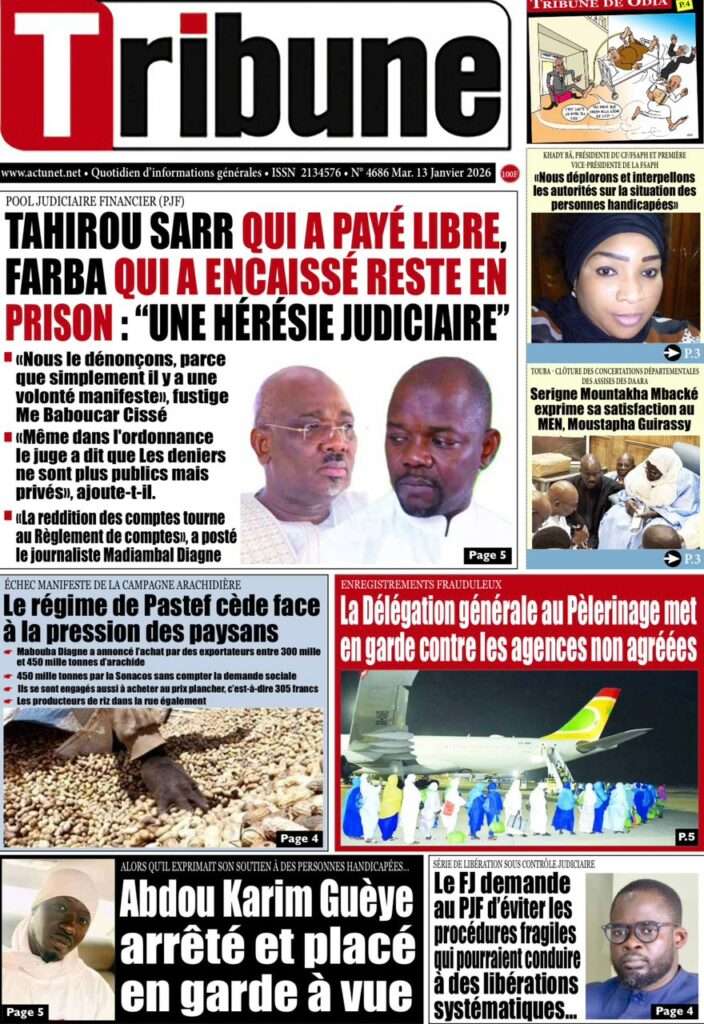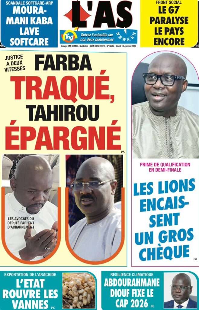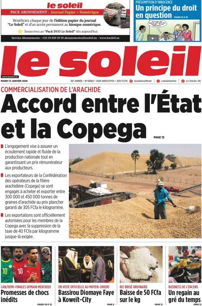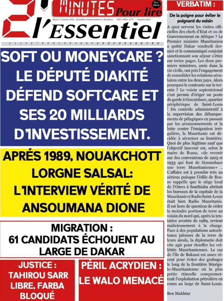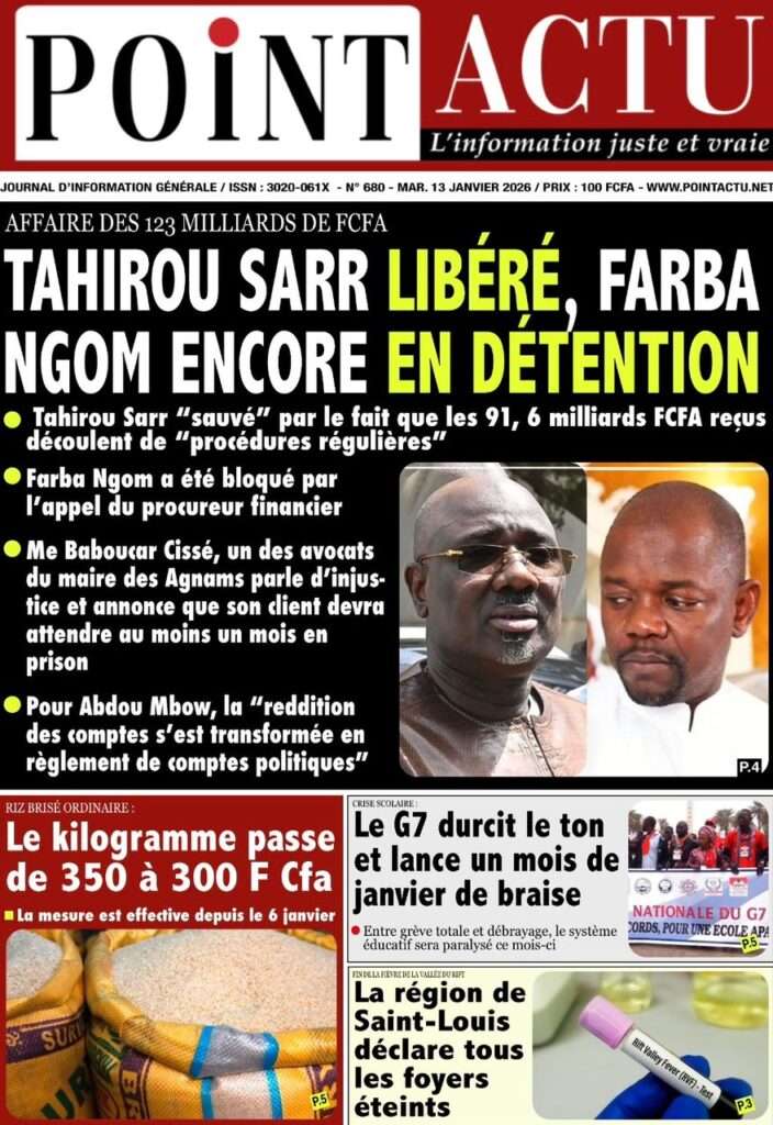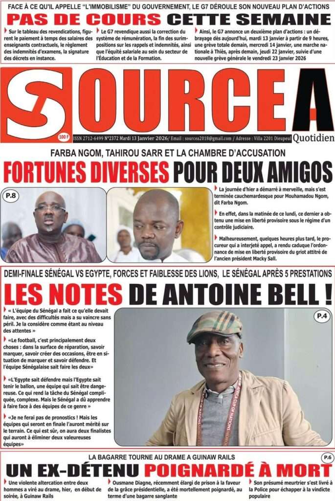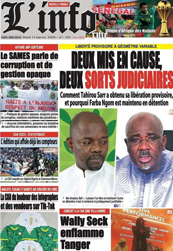 A la Une Actualité La Une Des Quotidiens – Mardi 13 Janvier 2026 (Avec Ma Revue De Presse) Bour Sine janvier 13, 2026 0 Post navigation Previous: Liberté provisoire : Farba Ngom reste en prisonNext: La revanche de la géographie ou l’Afrique face au réveil brutal de l’Histoire – Par Thierno LO More Stories A la Une Actualité Politique Ce que change la nouvelle loi électorale adoptée par les députés Bour Sine avril 28, 2026 0 A la Une Actualité Politique « Ensemble, nous sommes une force »Par Hamidou Thiaw, Président du MPR Bour Sine avril 28, 2026 0 A la Une Actualité Pape Malick Ndour envoyé en prison Bour Sine avril 28, 2026 0 Laisser un commentaire Annuler la réponseVotre adresse e-mail ne sera pas publiée. Les champs obligatoires sont indiqués avec *Commentaire * Nom * E-mail * Site web Enregistrer mon nom, mon e-mail et mon site dans le navigateur pour mon prochain commentaire.