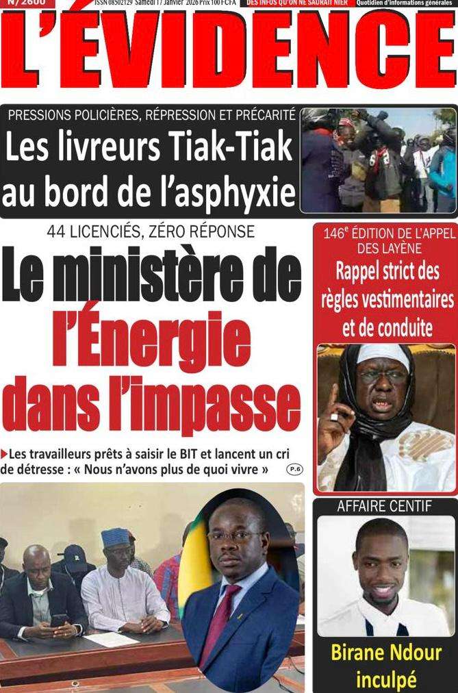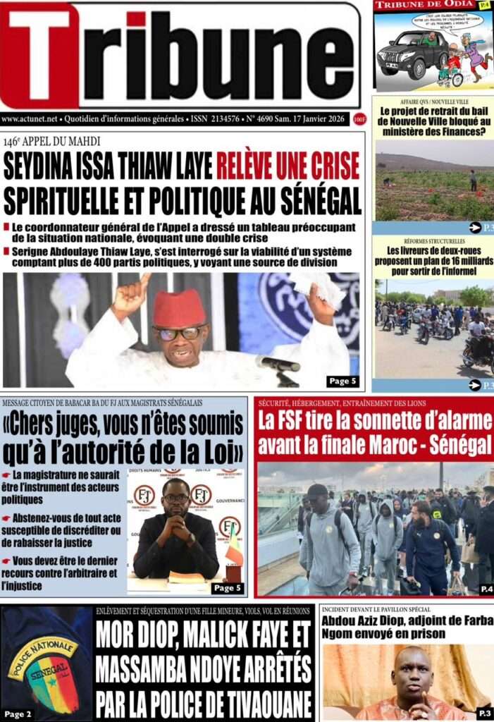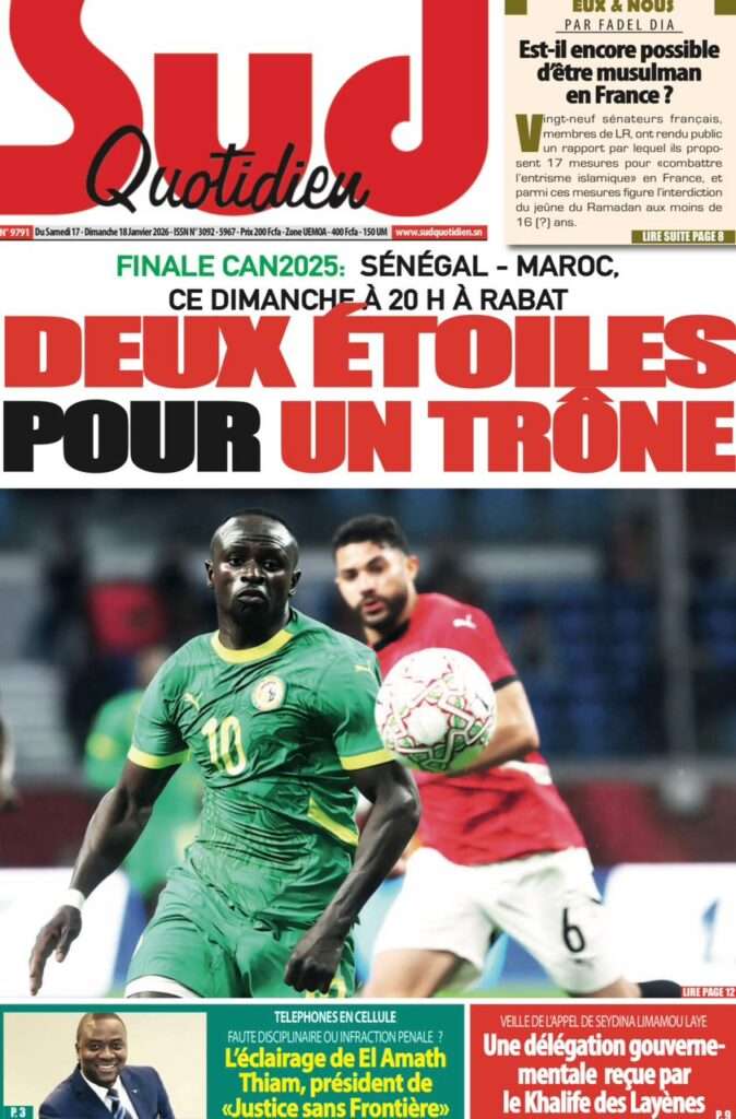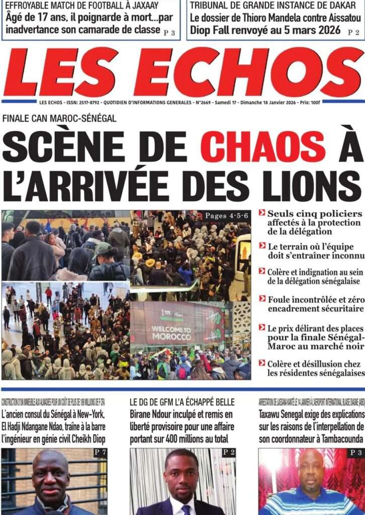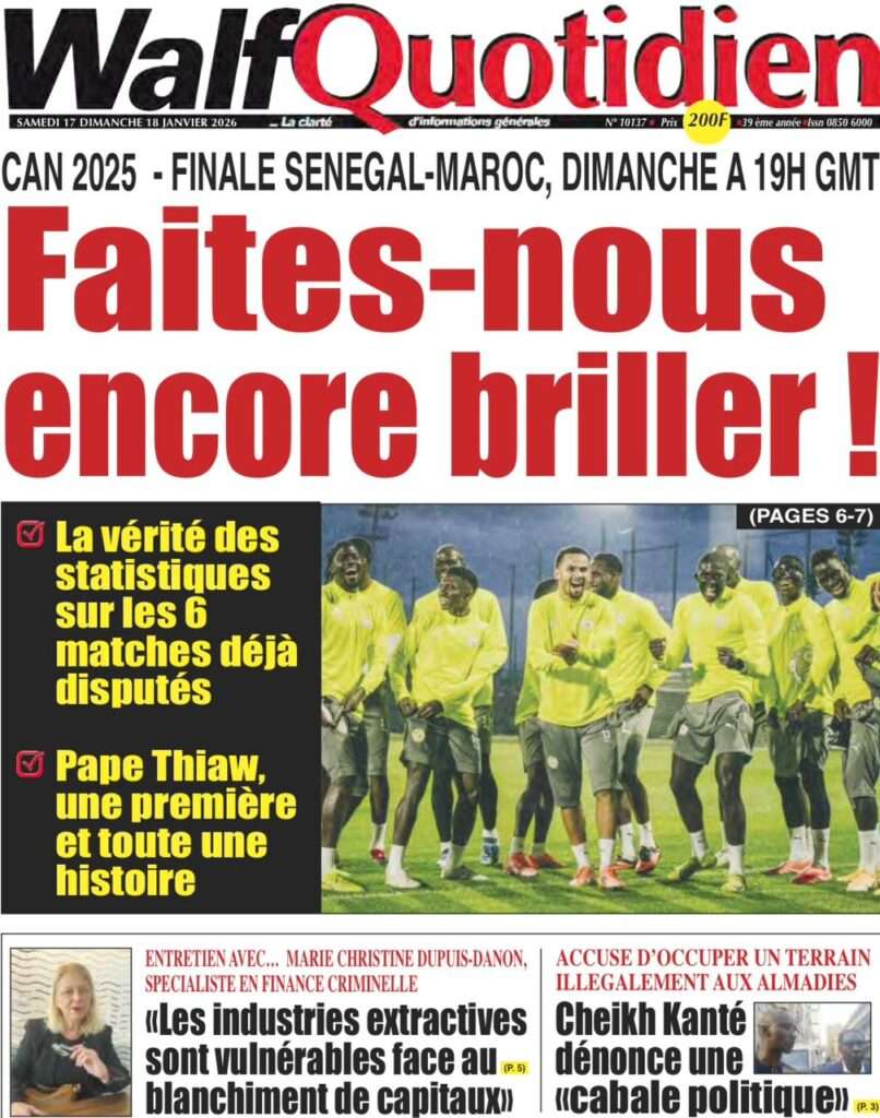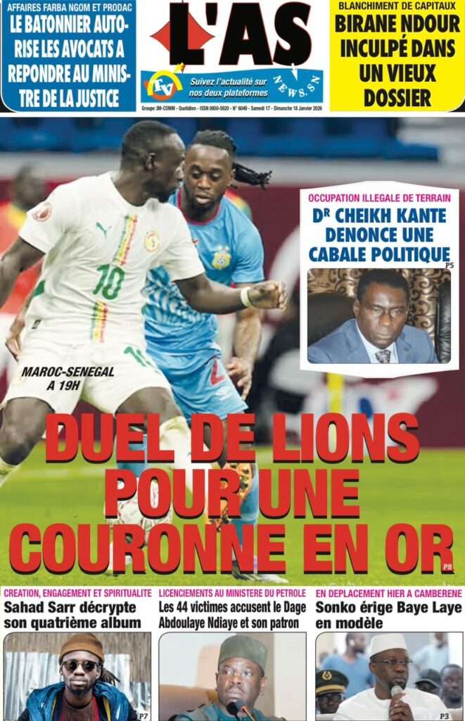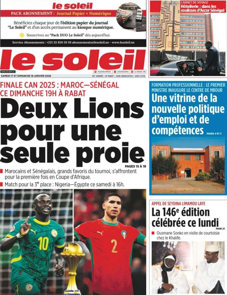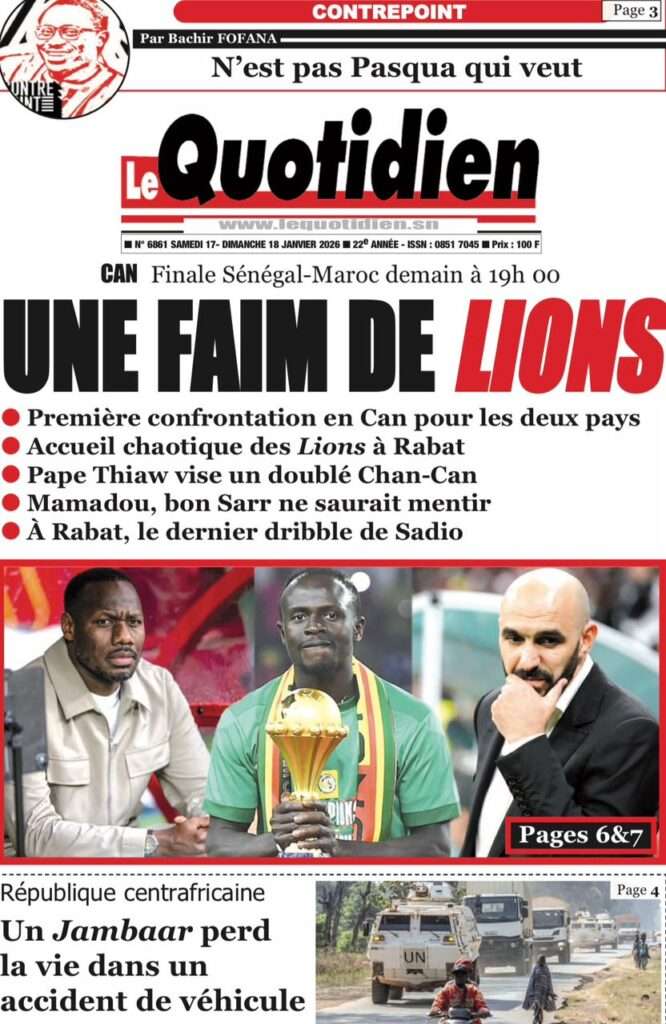 A la Une Actualité La Une Des Quotidiens – Samedi 17 Janvier 2026 (Avec Ma Revue De Presse) Bour Sine janvier 17, 2026 0 Post navigation Previous: La métamorphose du pouvoir : du projet du peuple à son reniementNext: Sénégal-Émirats : un centre de formation inauguré à Mbour pour forger la jeunesse de demain More Stories A la Une Actualité Politique Ce que change la nouvelle loi électorale adoptée par les députés Bour Sine avril 28, 2026 0 A la Une Actualité Politique « Ensemble, nous sommes une force »Par Hamidou Thiaw, Président du MPR Bour Sine avril 28, 2026 0 A la Une Actualité Pape Malick Ndour envoyé en prison Bour Sine avril 28, 2026 0 Laisser un commentaire Annuler la réponseVotre adresse e-mail ne sera pas publiée. Les champs obligatoires sont indiqués avec *Commentaire * Nom * E-mail * Site web Enregistrer mon nom, mon e-mail et mon site dans le navigateur pour mon prochain commentaire.
