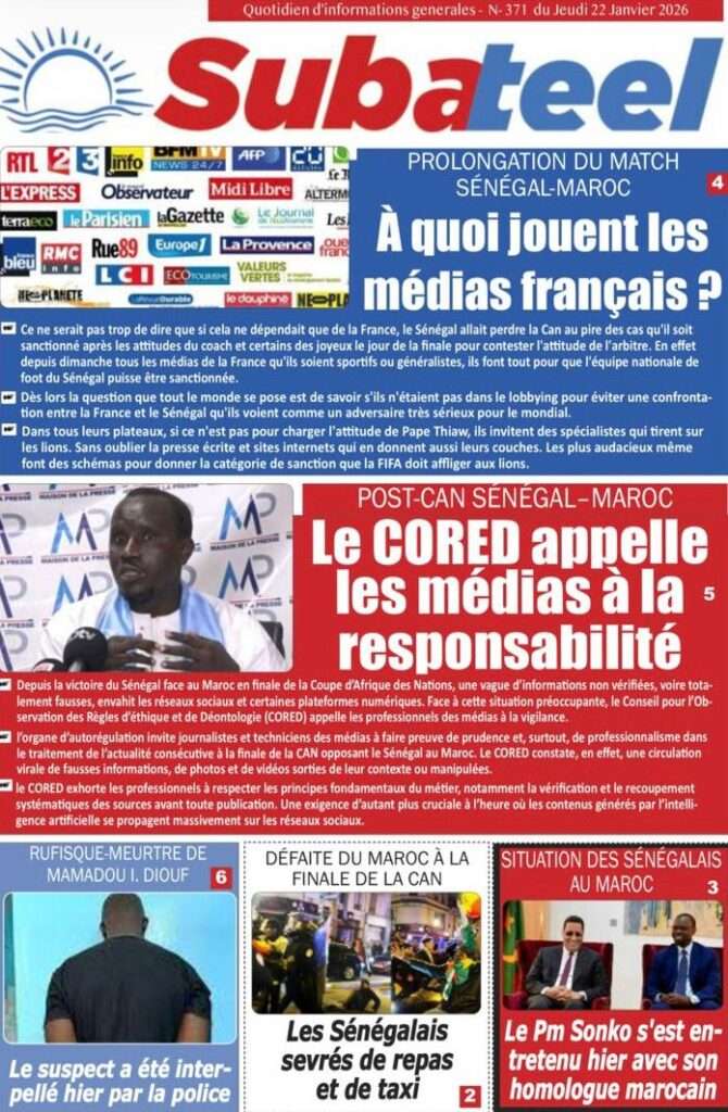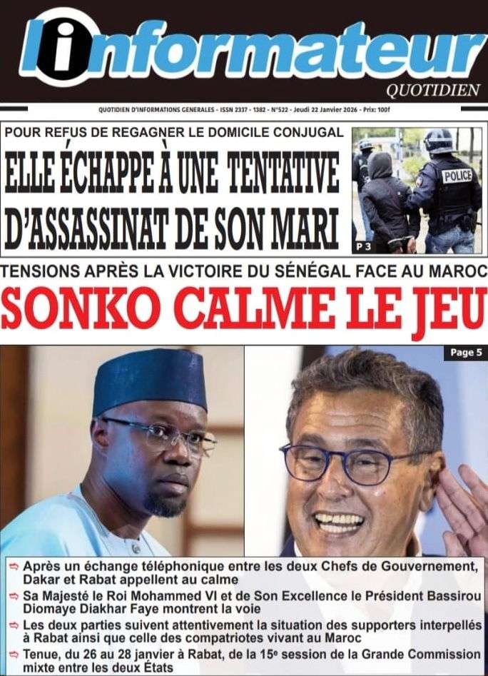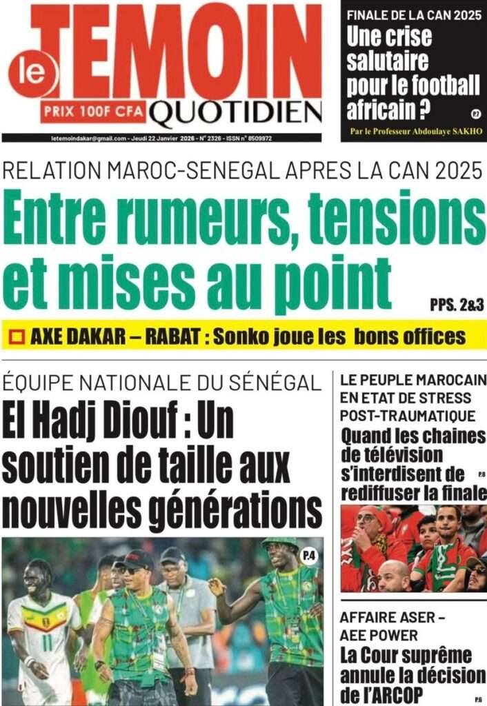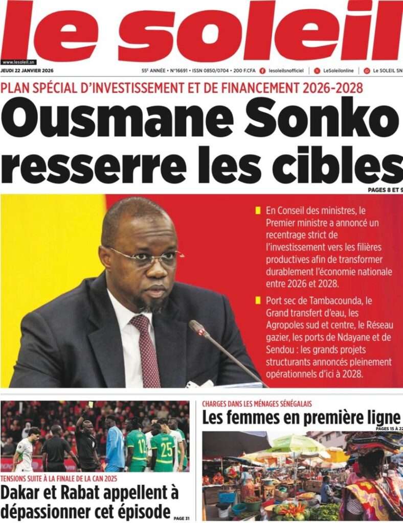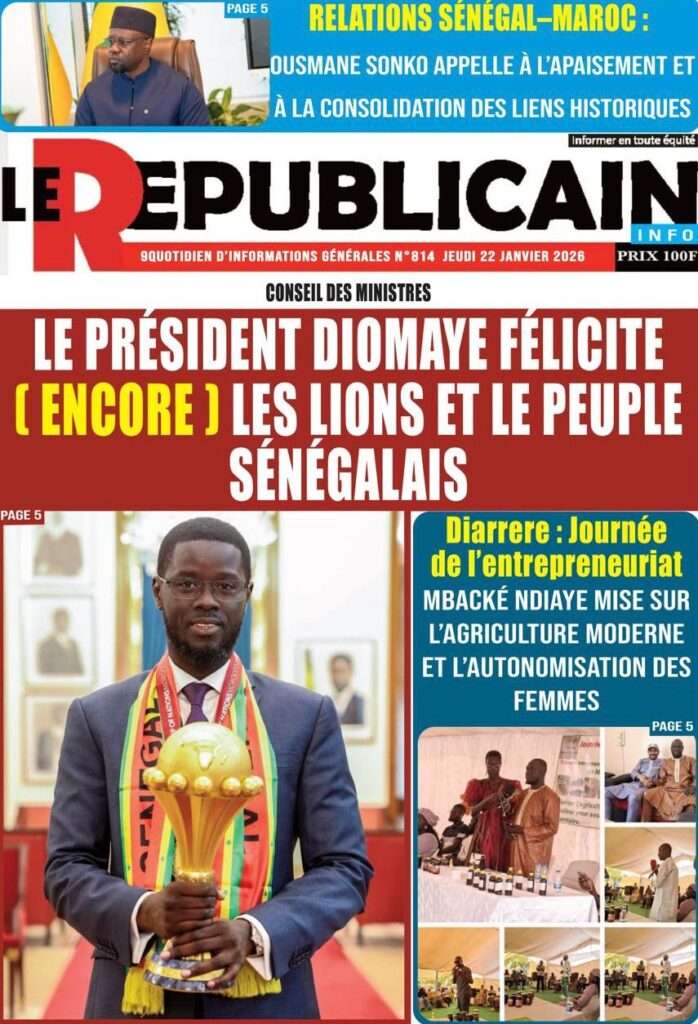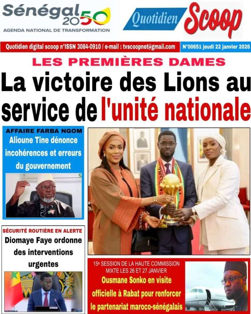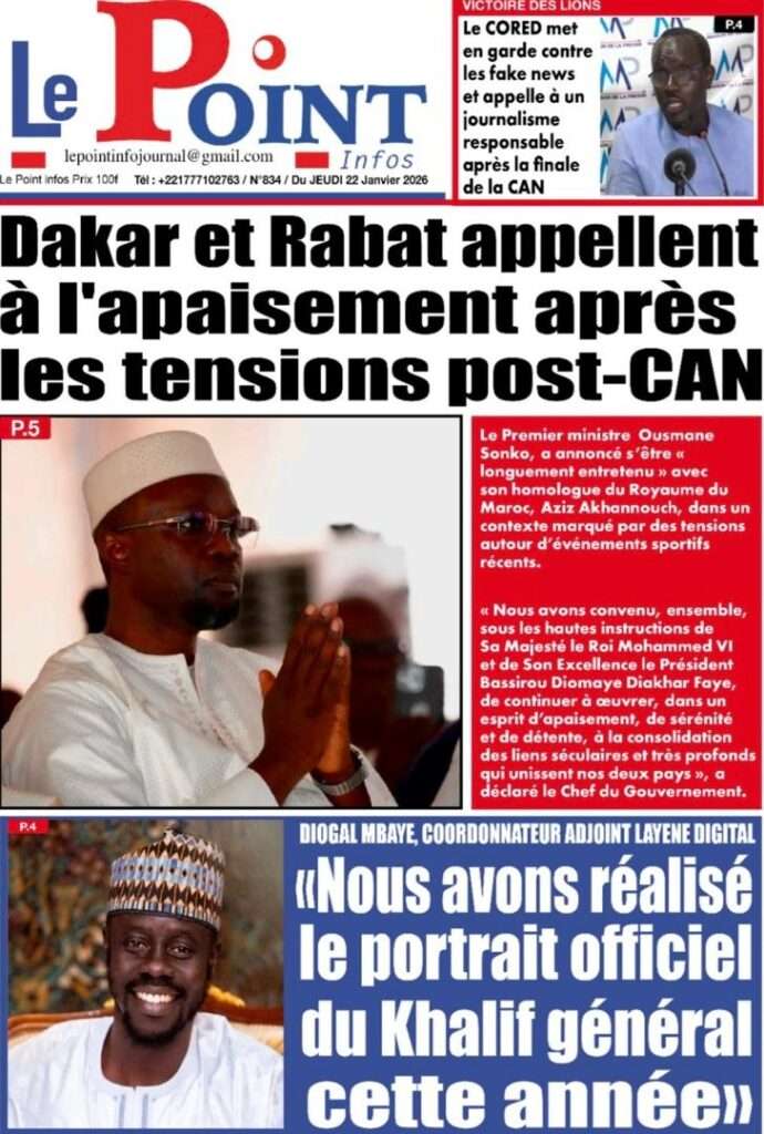 A la Une Actualité La Une Des Quotidiens – Jeudi 22 Janvier 2026 (Ave Ma Revue De Presse) Bour Sine janvier 22, 2026 0 Post navigation Previous: Gouvernement : Communiqué du Conseil des ministres du mercredi 21 janvier 2026Next: Sadio Mané, le Nianthio magnifique – Par Abdoulaye Dieng, Entrepreneur More Stories A la Une Actualité Politique Ce que change la nouvelle loi électorale adoptée par les députés Bour Sine avril 28, 2026 0 A la Une Actualité Politique « Ensemble, nous sommes une force »Par Hamidou Thiaw, Président du MPR Bour Sine avril 28, 2026 0 A la Une Actualité Pape Malick Ndour envoyé en prison Bour Sine avril 28, 2026 0 Laisser un commentaire Annuler la réponseVotre adresse e-mail ne sera pas publiée. Les champs obligatoires sont indiqués avec *Commentaire * Nom * E-mail * Site web Enregistrer mon nom, mon e-mail et mon site dans le navigateur pour mon prochain commentaire.