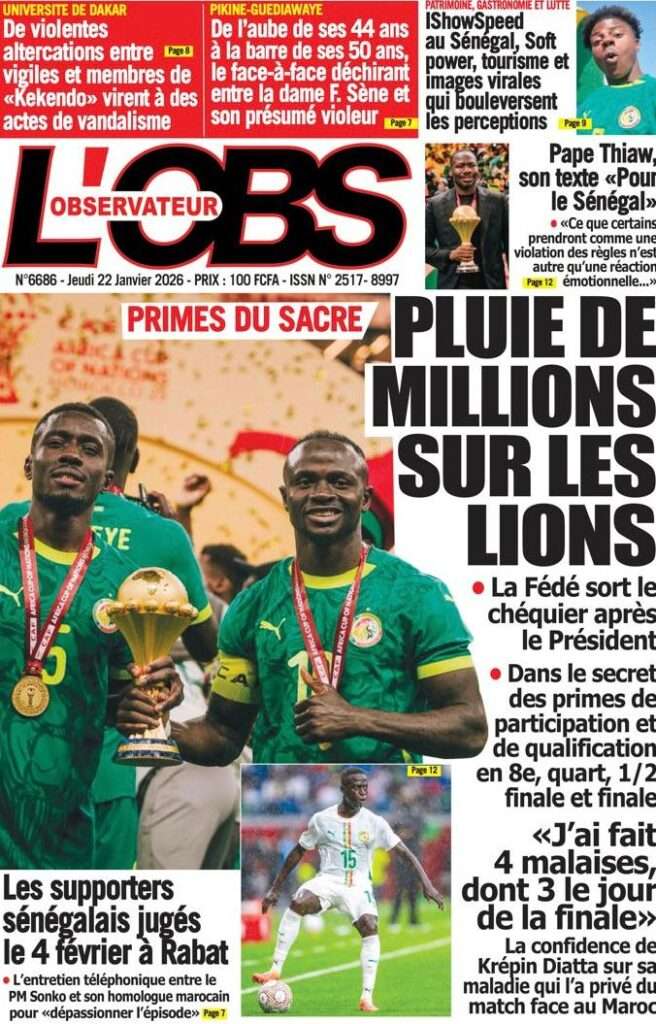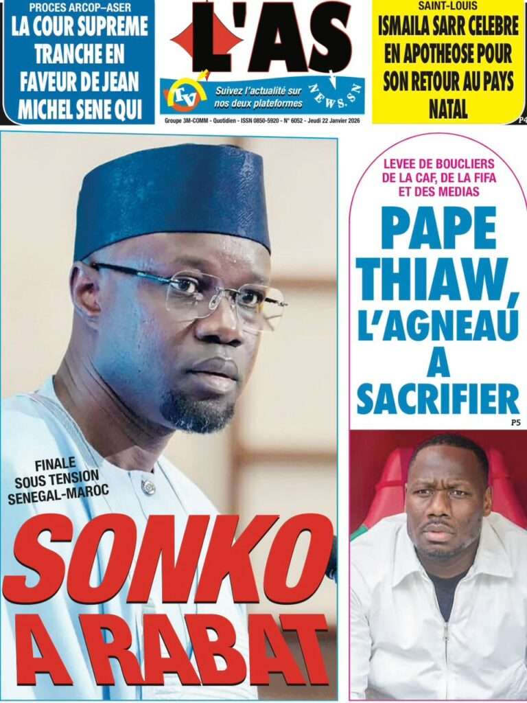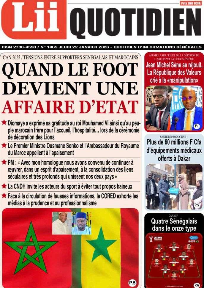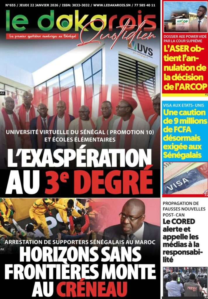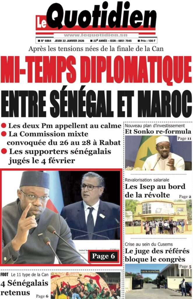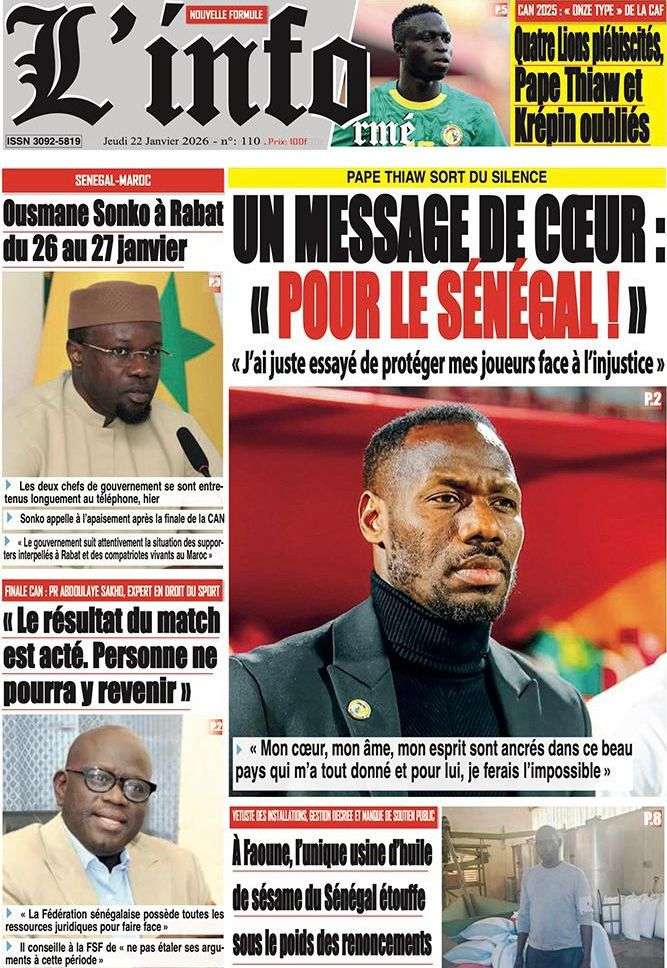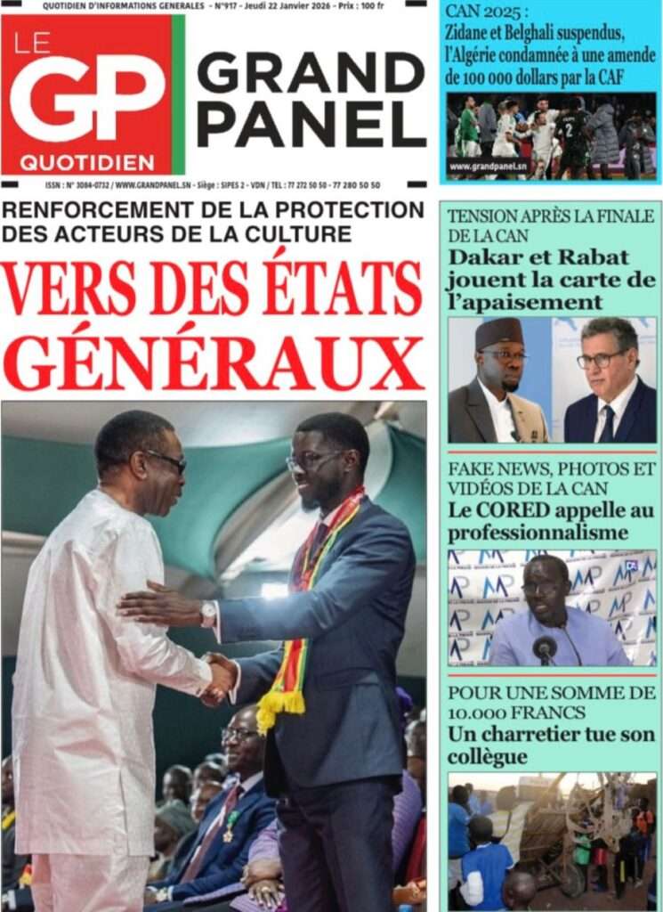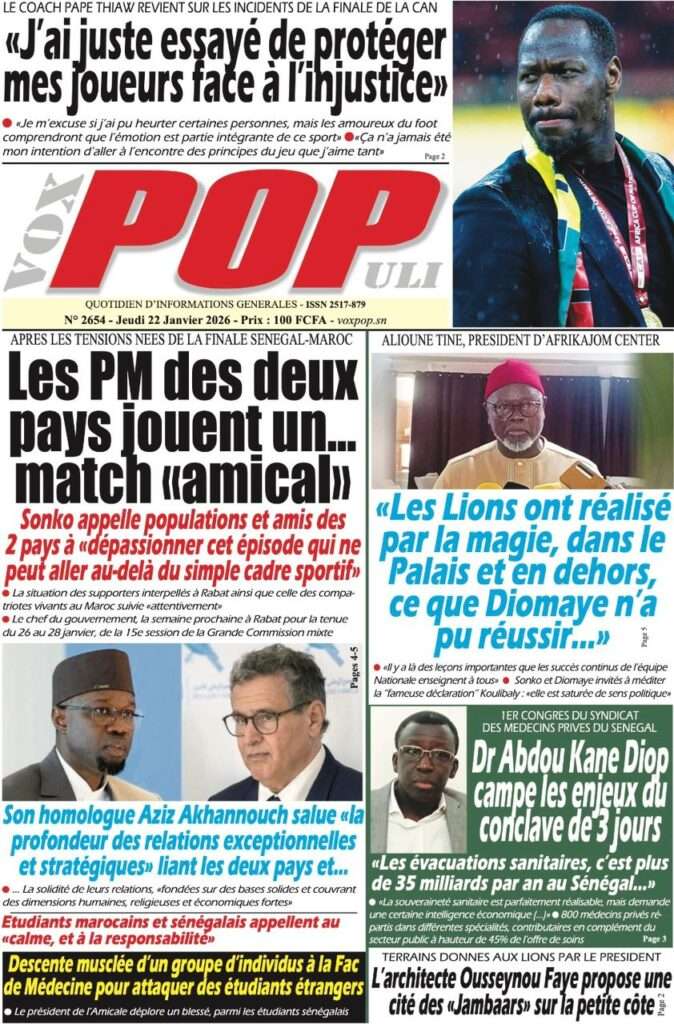 A la Une Actualité La Une Des Quotidiens – Jeudi 22 Janvier 2026 (Ave Ma Revue De Presse) Bour Sine janvier 22, 2026 0 Post navigation Previous: Gouvernement : Communiqué du Conseil des ministres du mercredi 21 janvier 2026Next: Sadio Mané, le Nianthio magnifique – Par Abdoulaye Dieng, Entrepreneur More Stories A la Une Actualité Politique Ce que change la nouvelle loi électorale adoptée par les députés Bour Sine avril 28, 2026 0 A la Une Actualité Politique « Ensemble, nous sommes une force »Par Hamidou Thiaw, Président du MPR Bour Sine avril 28, 2026 0 A la Une Actualité Pape Malick Ndour envoyé en prison Bour Sine avril 28, 2026 0 Laisser un commentaire Annuler la réponseVotre adresse e-mail ne sera pas publiée. Les champs obligatoires sont indiqués avec *Commentaire * Nom * E-mail * Site web Enregistrer mon nom, mon e-mail et mon site dans le navigateur pour mon prochain commentaire.