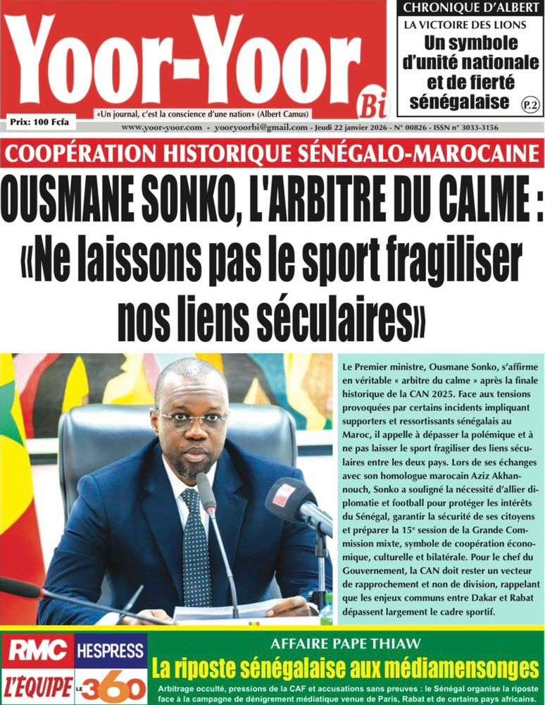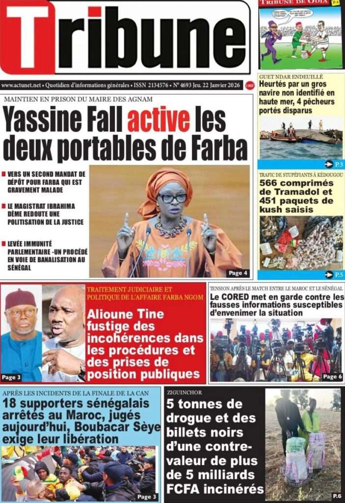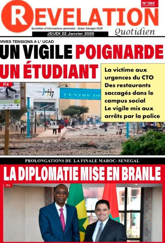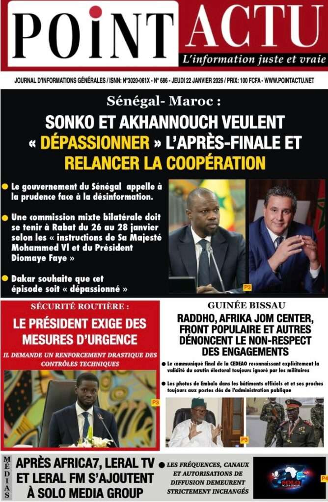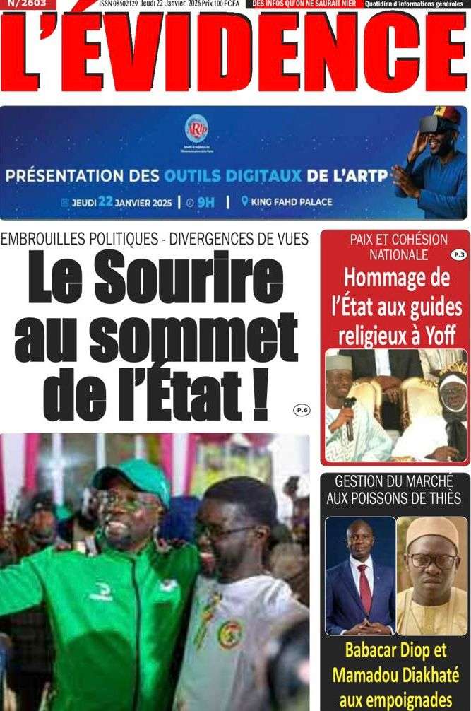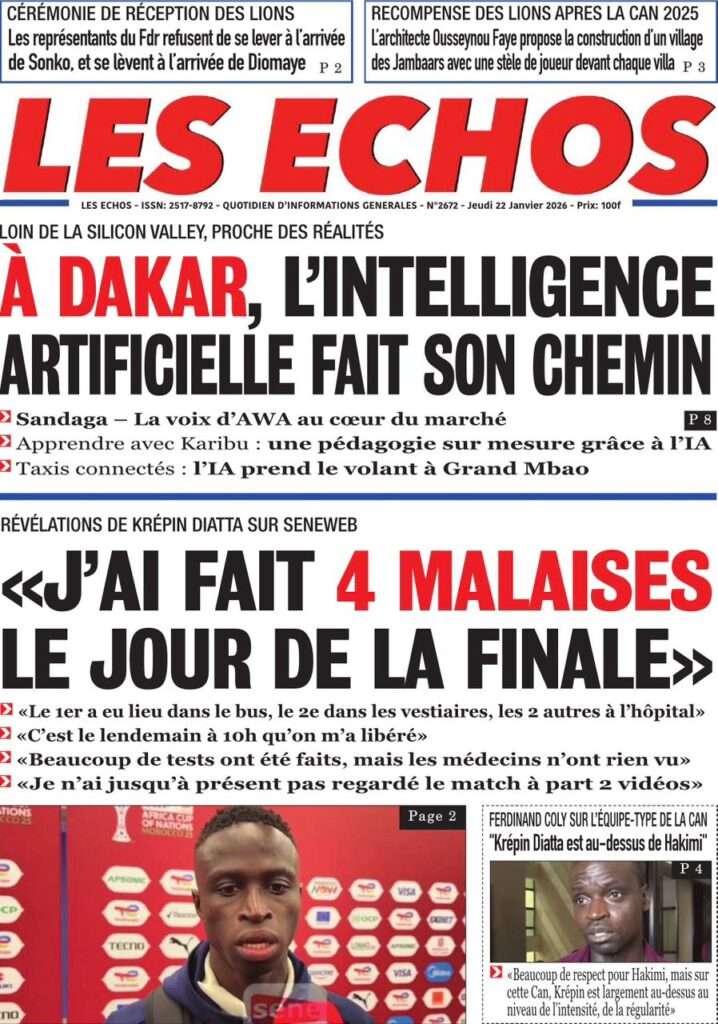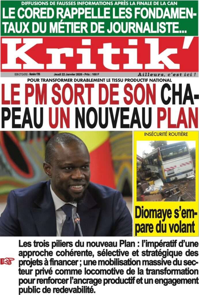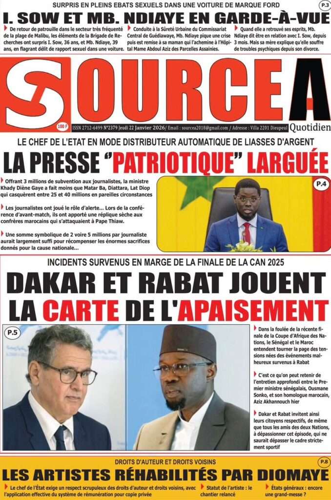 A la Une Actualité La Une Des Quotidiens – Jeudi 22 Janvier 2026 (Ave Ma Revue De Presse) Bour Sine janvier 22, 2026 0 Post navigation Previous: Gouvernement : Communiqué du Conseil des ministres du mercredi 21 janvier 2026Next: Sadio Mané, le Nianthio magnifique – Par Abdoulaye Dieng, Entrepreneur More Stories A la Une Actualité Politique Ce que change la nouvelle loi électorale adoptée par les députés Bour Sine avril 28, 2026 0 A la Une Actualité Politique « Ensemble, nous sommes une force »Par Hamidou Thiaw, Président du MPR Bour Sine avril 28, 2026 0 A la Une Actualité Pape Malick Ndour envoyé en prison Bour Sine avril 28, 2026 0 Laisser un commentaire Annuler la réponseVotre adresse e-mail ne sera pas publiée. Les champs obligatoires sont indiqués avec *Commentaire * Nom * E-mail * Site web Enregistrer mon nom, mon e-mail et mon site dans le navigateur pour mon prochain commentaire.