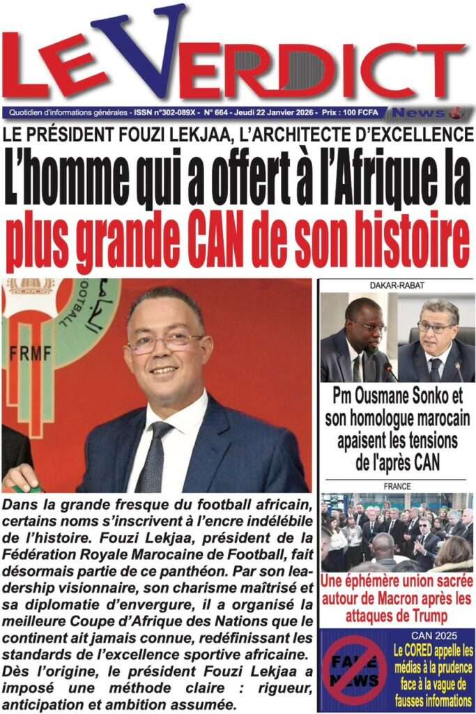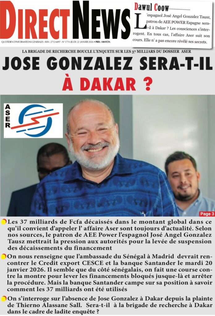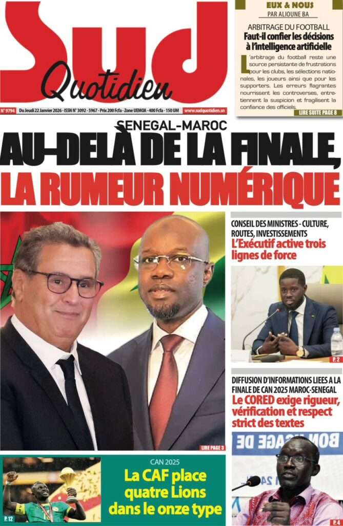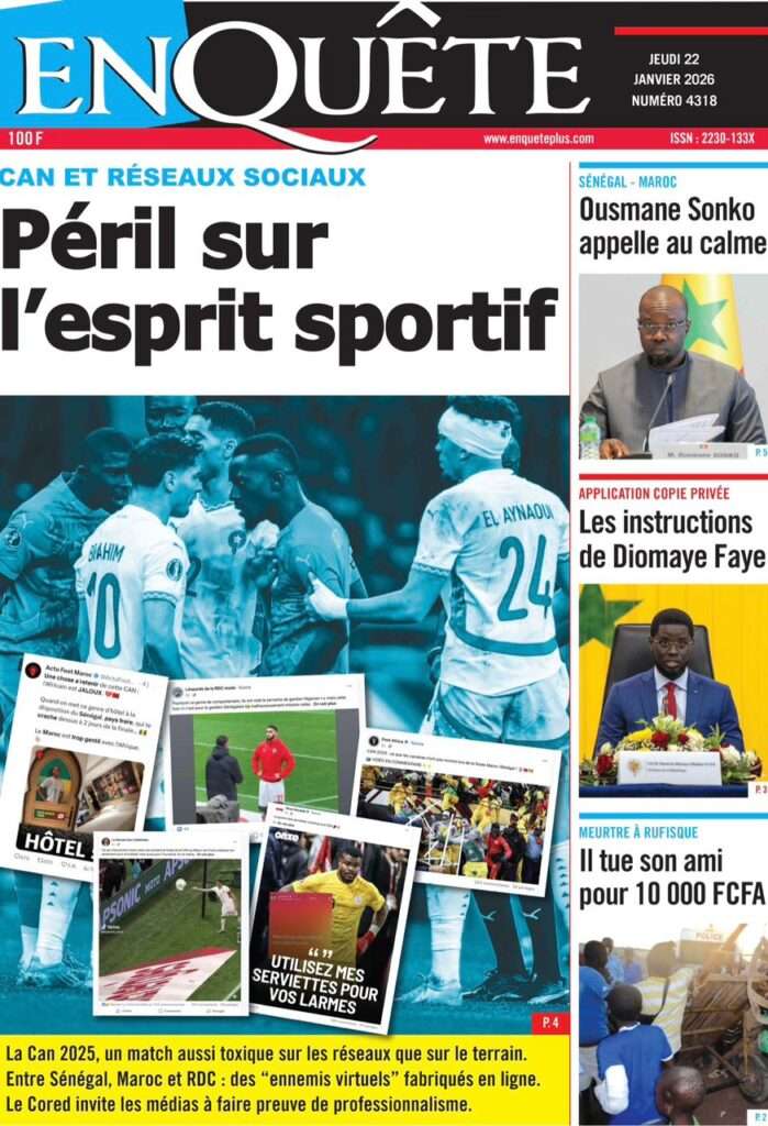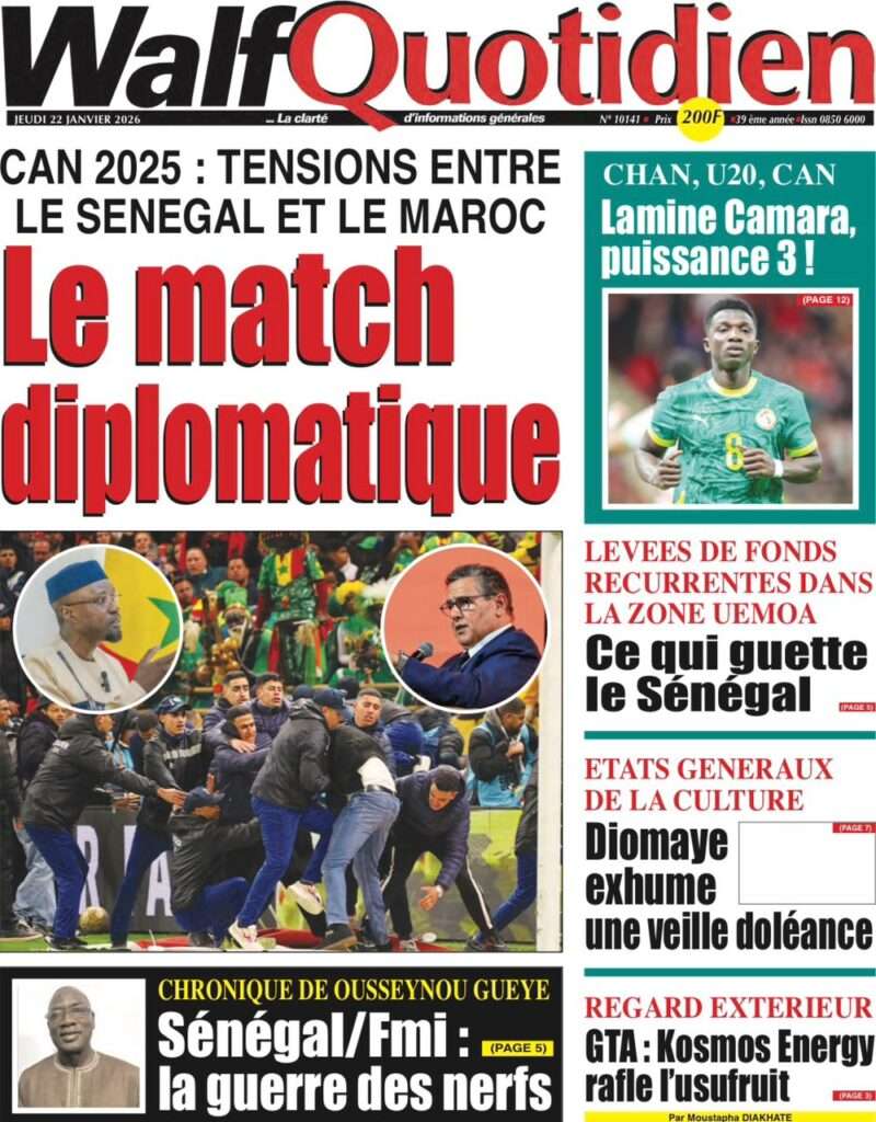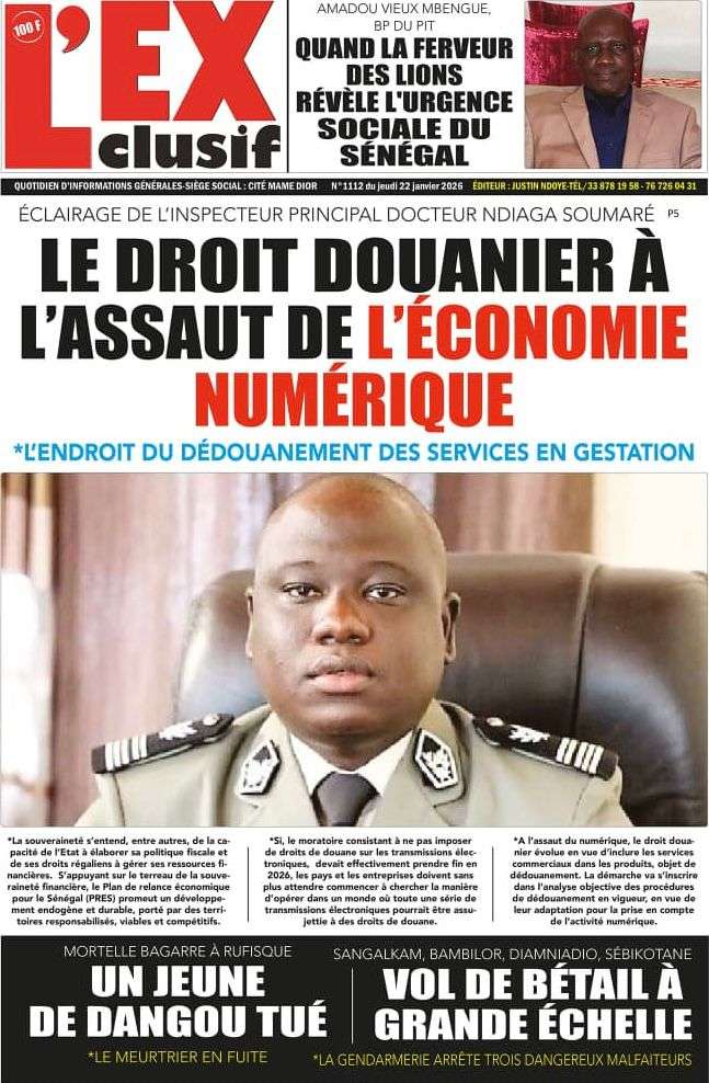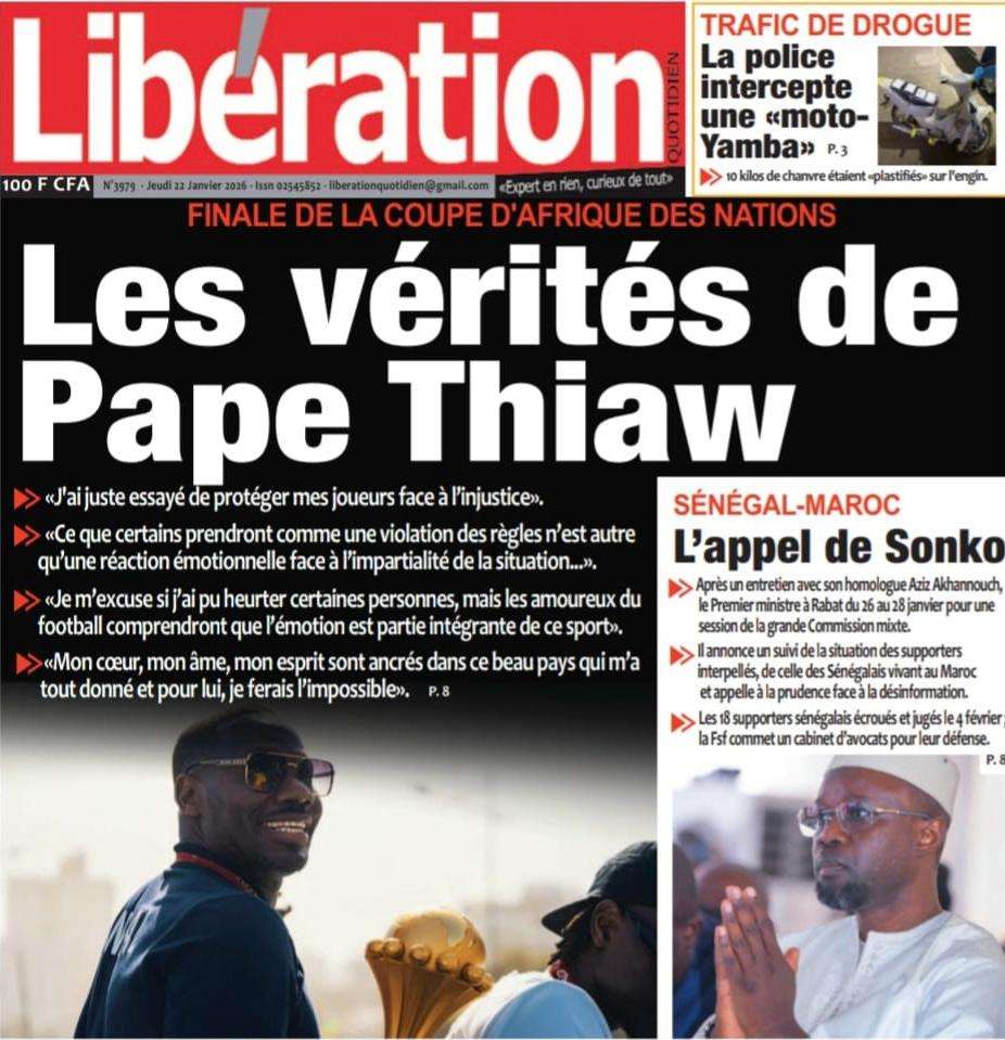 A la Une Actualité La Une Des Quotidiens – Jeudi 22 Janvier 2026 (Ave Ma Revue De Presse) Bour Sine janvier 22, 2026 0 Post navigation Previous: Gouvernement : Communiqué du Conseil des ministres du mercredi 21 janvier 2026Next: Sadio Mané, le Nianthio magnifique – Par Abdoulaye Dieng, Entrepreneur More Stories A la Une Actualité Politique Ce que change la nouvelle loi électorale adoptée par les députés Bour Sine avril 28, 2026 0 A la Une Actualité Politique « Ensemble, nous sommes une force »Par Hamidou Thiaw, Président du MPR Bour Sine avril 28, 2026 0 A la Une Actualité Pape Malick Ndour envoyé en prison Bour Sine avril 28, 2026 0 Laisser un commentaire Annuler la réponseVotre adresse e-mail ne sera pas publiée. Les champs obligatoires sont indiqués avec *Commentaire * Nom * E-mail * Site web Enregistrer mon nom, mon e-mail et mon site dans le navigateur pour mon prochain commentaire.