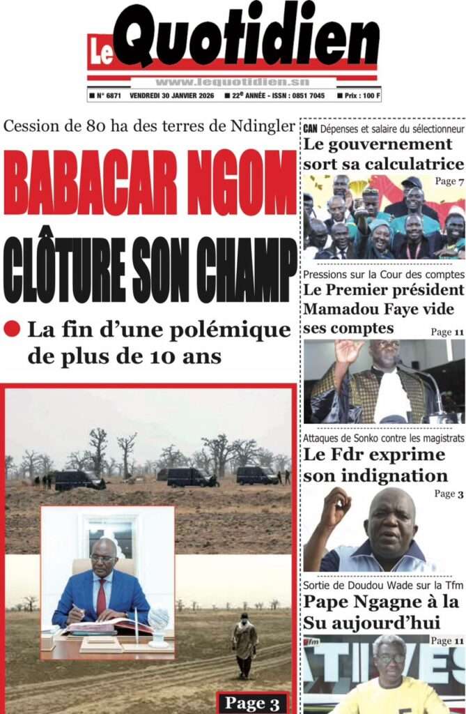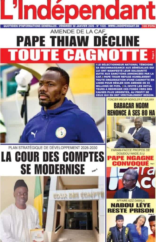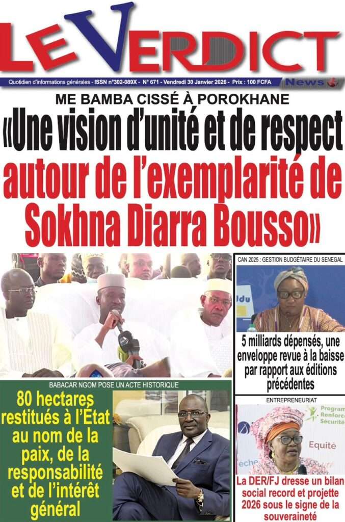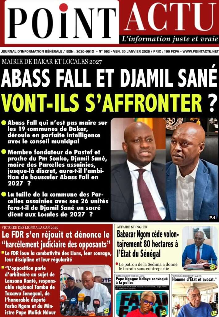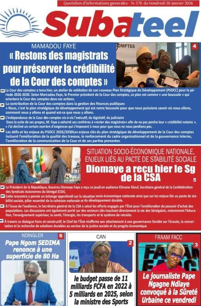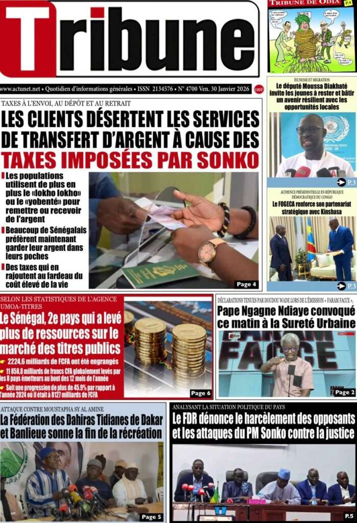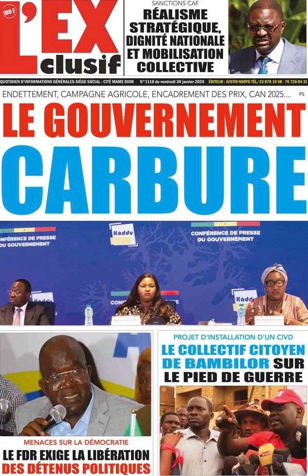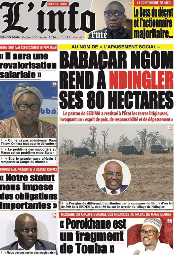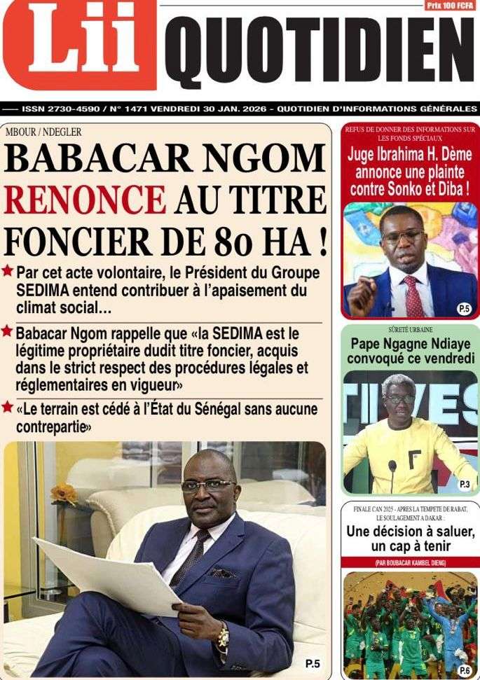 A la Une Actualité La Une Des Quotidiens – Vendredi 30 Janvier 2026 (Avec Ma Revue De Presse) Bour Sine janvier 30, 2026 0 Post navigation Previous: ÉPHÉMÉRIDES DU 29 JANVIERNext: Madiambal Diagne fait l’objet d’une plainte de son fils Mouhamed Diagne More Stories A la Une Actualité Politique Ce que change la nouvelle loi électorale adoptée par les députés Bour Sine avril 28, 2026 0 A la Une Actualité Politique « Ensemble, nous sommes une force »Par Hamidou Thiaw, Président du MPR Bour Sine avril 28, 2026 0 A la Une Actualité Pape Malick Ndour envoyé en prison Bour Sine avril 28, 2026 0 Laisser un commentaire Annuler la réponseVotre adresse e-mail ne sera pas publiée. Les champs obligatoires sont indiqués avec *Commentaire * Nom * E-mail * Site web Enregistrer mon nom, mon e-mail et mon site dans le navigateur pour mon prochain commentaire.