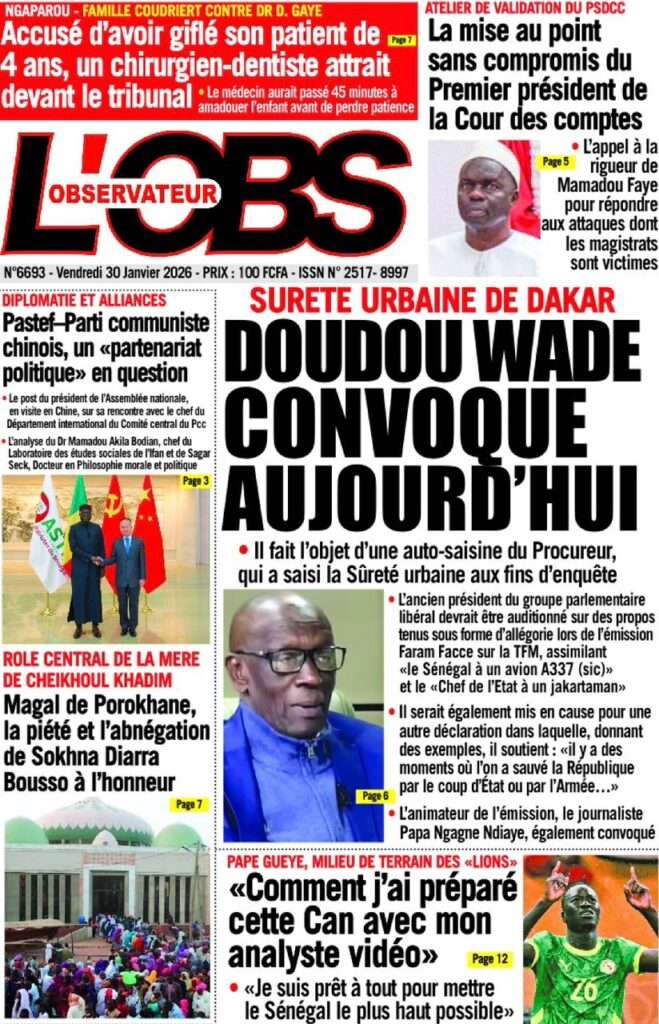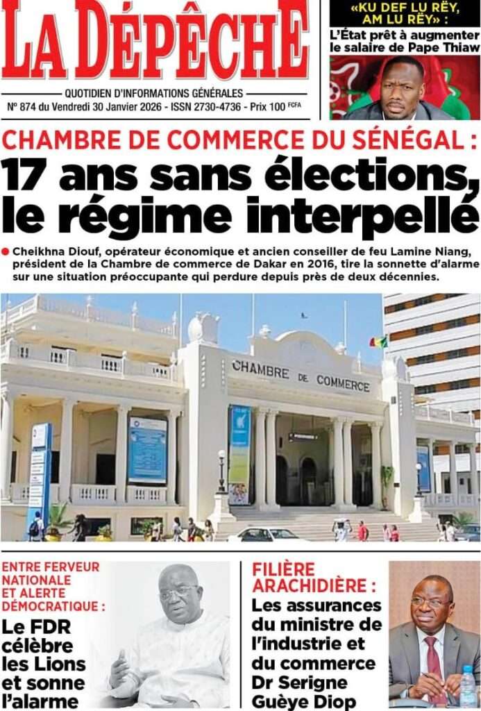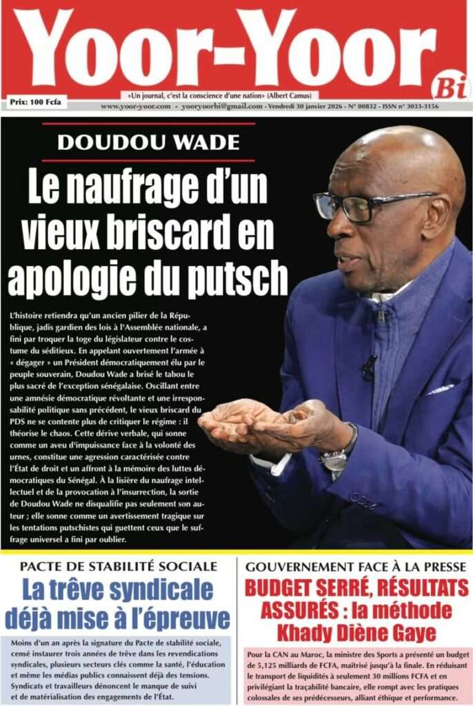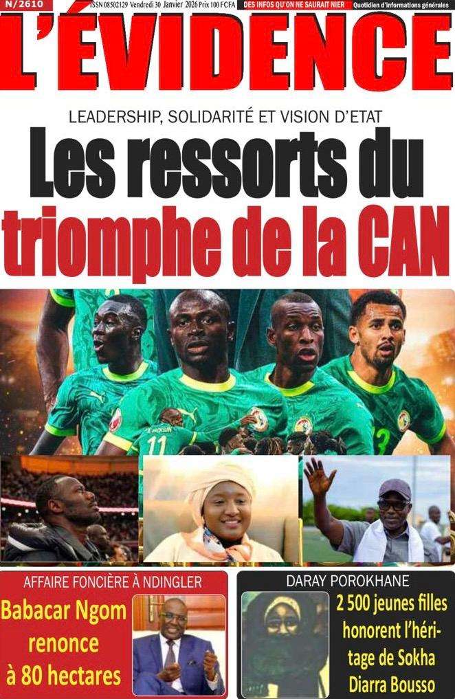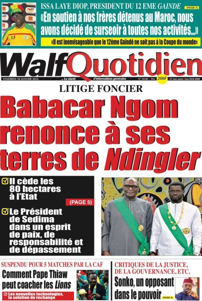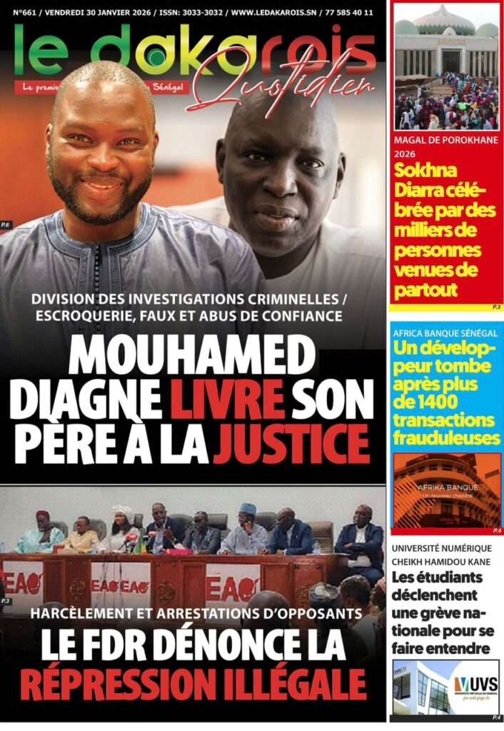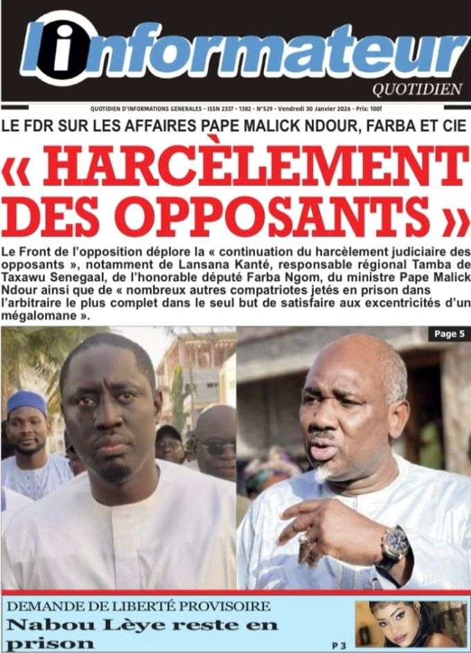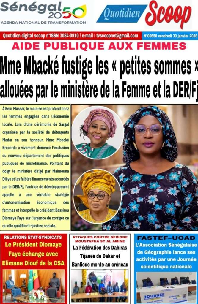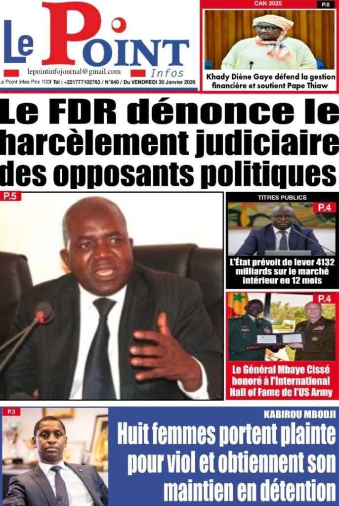 A la Une Actualité La Une Des Quotidiens – Vendredi 30 Janvier 2026 (Avec Ma Revue De Presse) Bour Sine janvier 30, 2026 0 Post navigation Previous: ÉPHÉMÉRIDES DU 29 JANVIERNext: Madiambal Diagne fait l’objet d’une plainte de son fils Mouhamed Diagne More Stories A la Une Actualité Politique Ce que change la nouvelle loi électorale adoptée par les députés Bour Sine avril 28, 2026 0 A la Une Actualité Politique « Ensemble, nous sommes une force »Par Hamidou Thiaw, Président du MPR Bour Sine avril 28, 2026 0 A la Une Actualité Pape Malick Ndour envoyé en prison Bour Sine avril 28, 2026 0 Laisser un commentaire Annuler la réponseVotre adresse e-mail ne sera pas publiée. Les champs obligatoires sont indiqués avec *Commentaire * Nom * E-mail * Site web Enregistrer mon nom, mon e-mail et mon site dans le navigateur pour mon prochain commentaire.