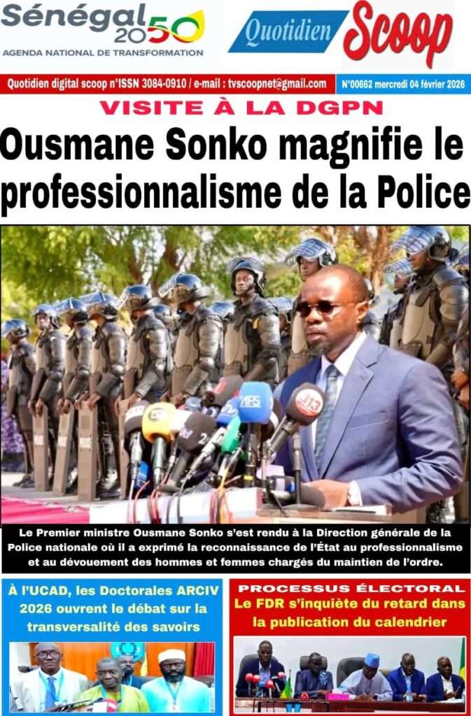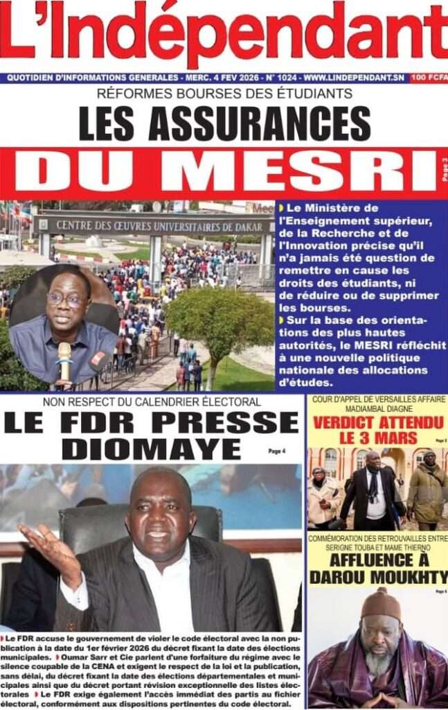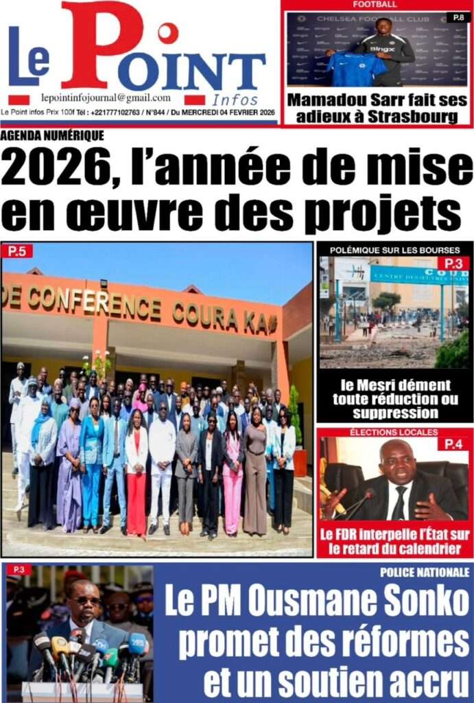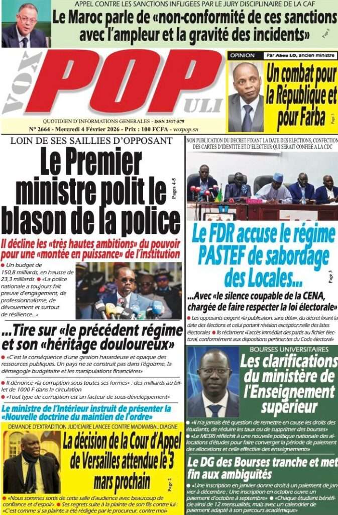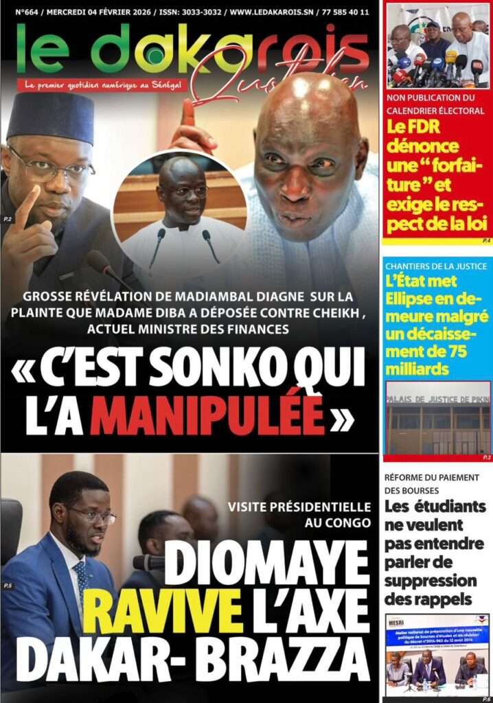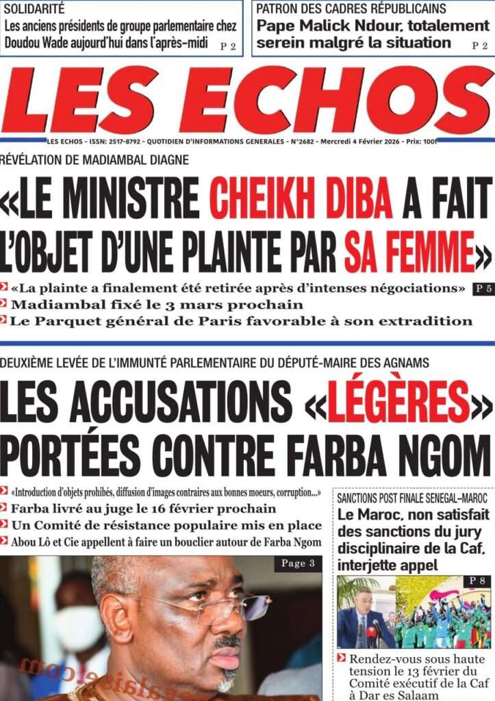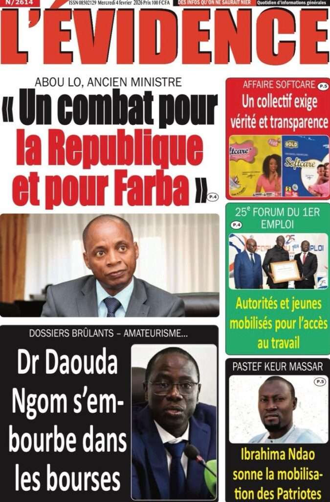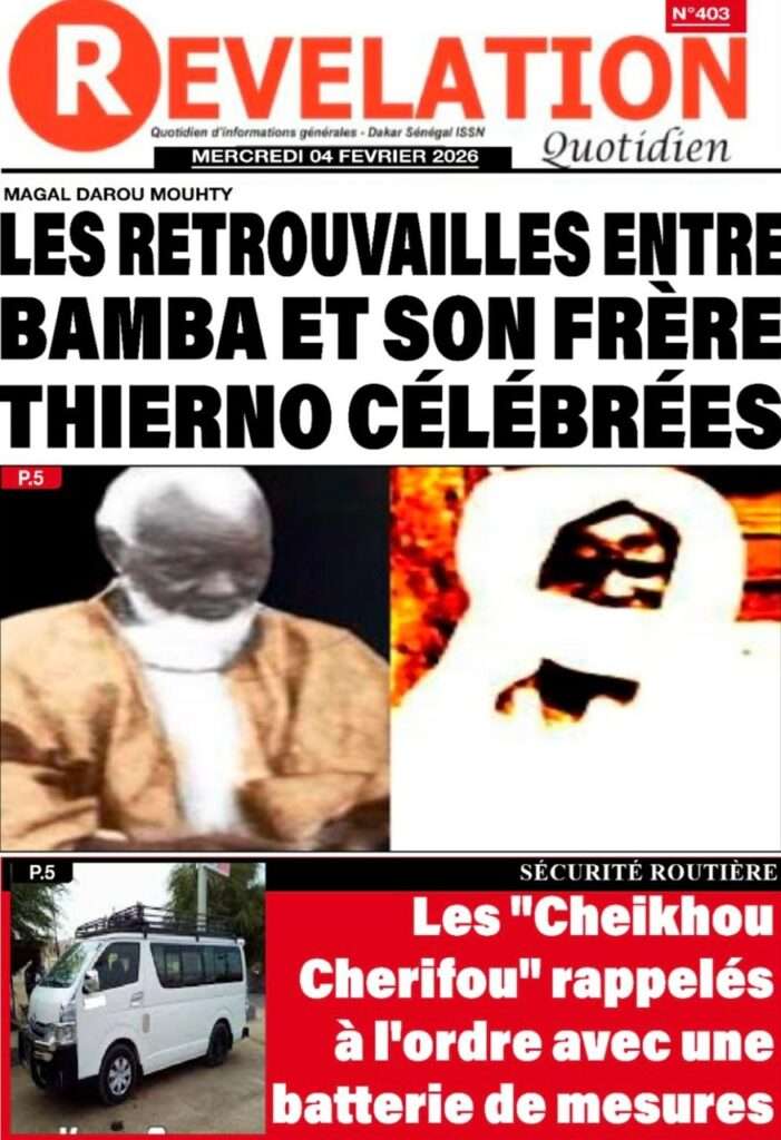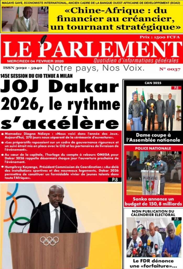 A la Une Actualité La Une Des Quotidiens – Mercredi 05 Février 2026 (Avec Ma Revue De Presse) Bour Sine février 4, 2026 0 Post navigation Previous: WAX I PICC : Protection des oiseaux en cage ou quand l’État donne priorité au symbolique sur l’essentielNext: ÉPHÉMÉRIDES DU 04 FÉVRIER More Stories A la Une Actualité La Une Des Quotidiens – Mercredi 29 Avril 2026 (Avec Ma Revue De Presse) Bour Sine avril 29, 2026 0 A la Une Actualité Politique Ce que change la nouvelle loi électorale adoptée par les députés Bour Sine avril 28, 2026 0 A la Une Actualité Politique « Ensemble, nous sommes une force »Par Hamidou Thiaw, Président du MPR Bour Sine avril 28, 2026 0 Laisser un commentaire Annuler la réponseVotre adresse e-mail ne sera pas publiée. Les champs obligatoires sont indiqués avec *Commentaire * Nom * E-mail * Site web Enregistrer mon nom, mon e-mail et mon site dans le navigateur pour mon prochain commentaire.