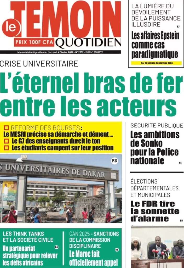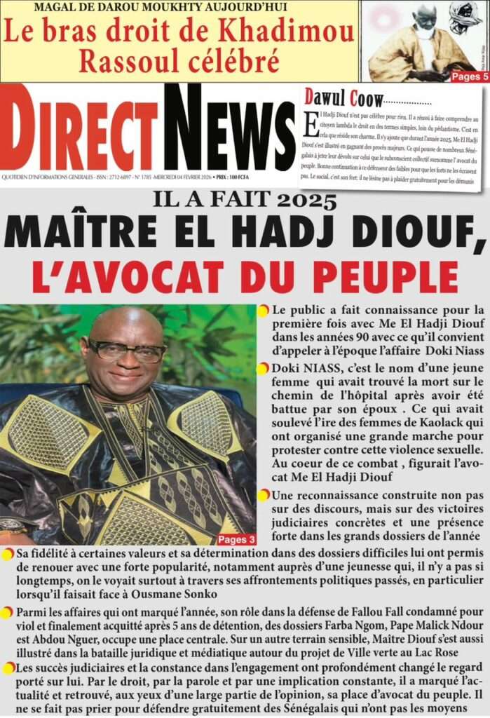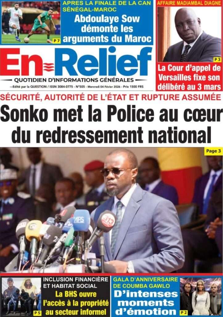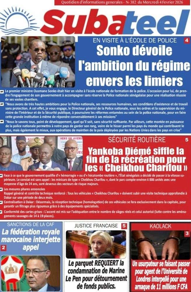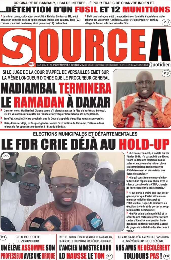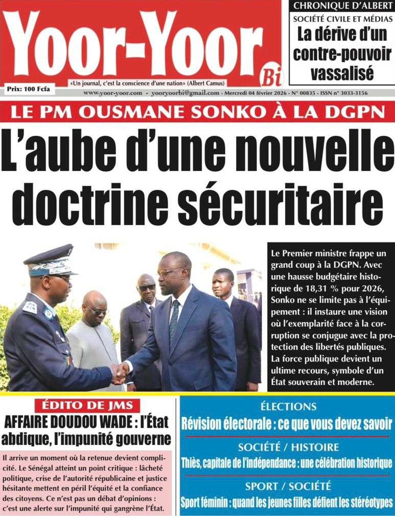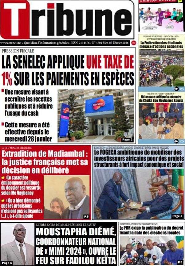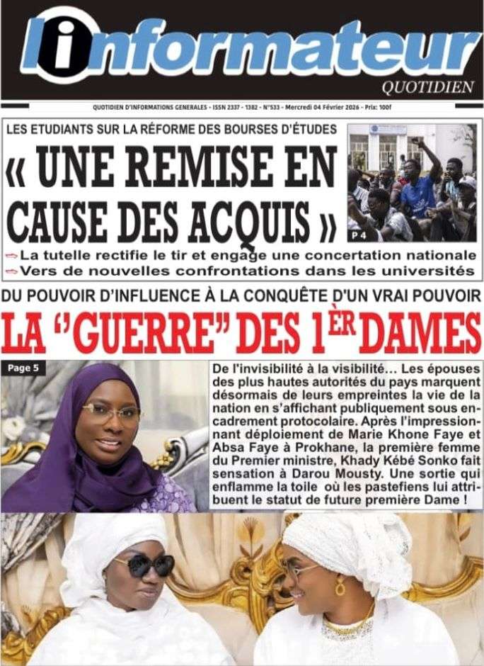 A la Une Actualité La Une Des Quotidiens – Mercredi 05 Février 2026 (Avec Ma Revue De Presse) Bour Sine février 4, 2026 0 Post navigation Previous: WAX I PICC : Protection des oiseaux en cage ou quand l’État donne priorité au symbolique sur l’essentielNext: ÉPHÉMÉRIDES DU 04 FÉVRIER More Stories A la Une Actualité La Une Des Quotidiens – Mercredi 29 Avril 2026 (Avec Ma Revue De Presse) Bour Sine avril 29, 2026 0 A la Une Actualité Politique Ce que change la nouvelle loi électorale adoptée par les députés Bour Sine avril 28, 2026 0 A la Une Actualité Politique « Ensemble, nous sommes une force »Par Hamidou Thiaw, Président du MPR Bour Sine avril 28, 2026 0 Laisser un commentaire Annuler la réponseVotre adresse e-mail ne sera pas publiée. Les champs obligatoires sont indiqués avec *Commentaire * Nom * E-mail * Site web Enregistrer mon nom, mon e-mail et mon site dans le navigateur pour mon prochain commentaire.