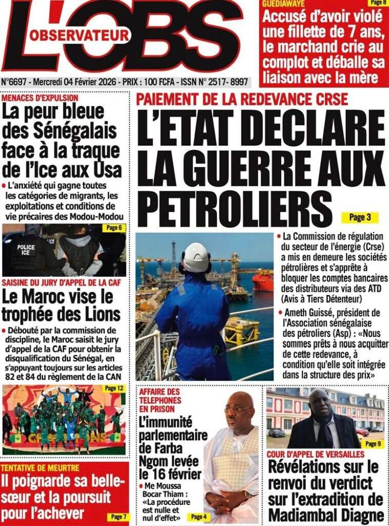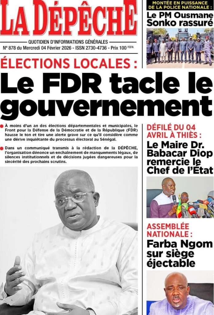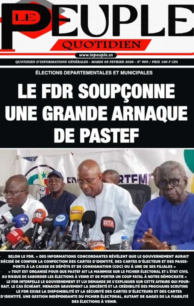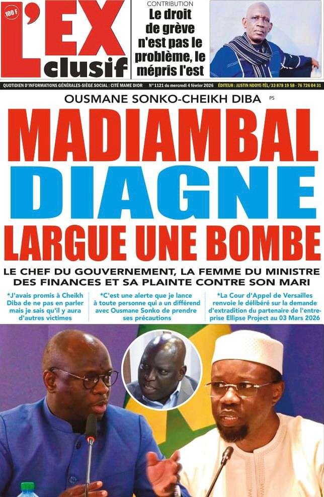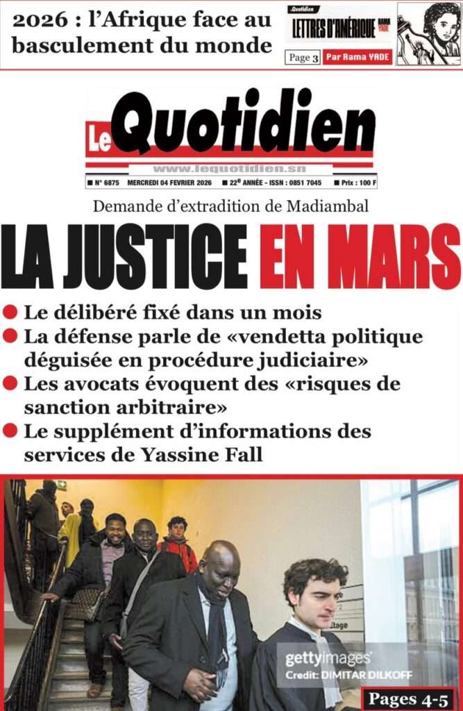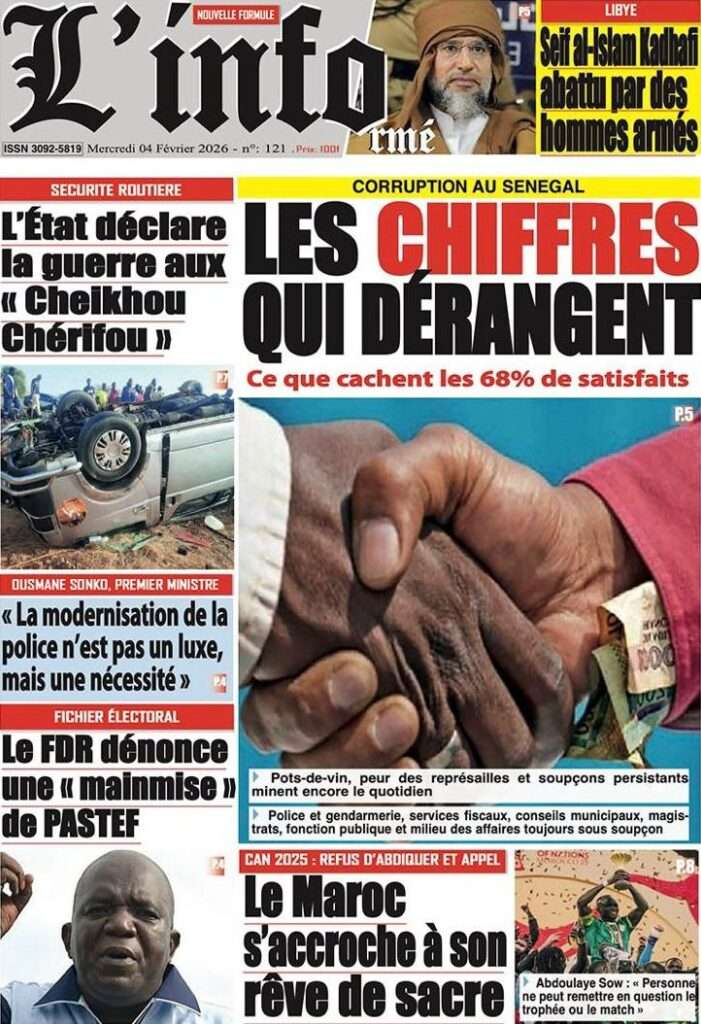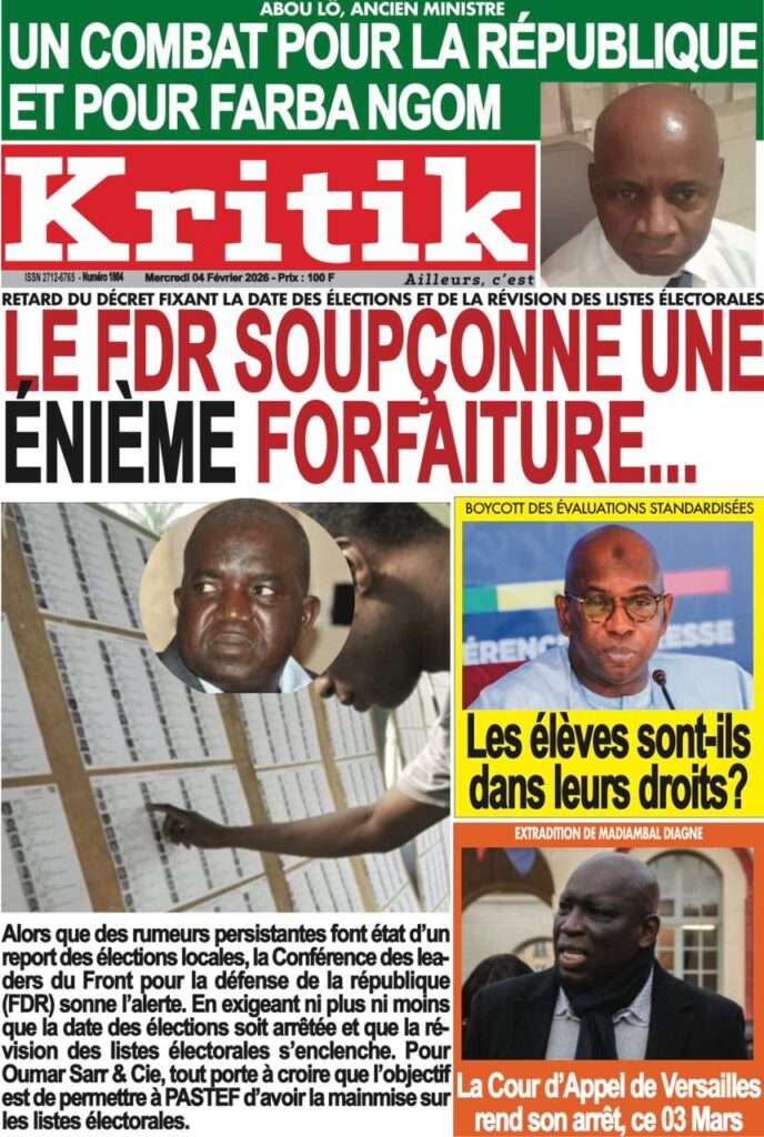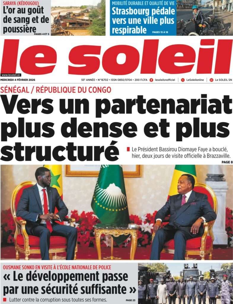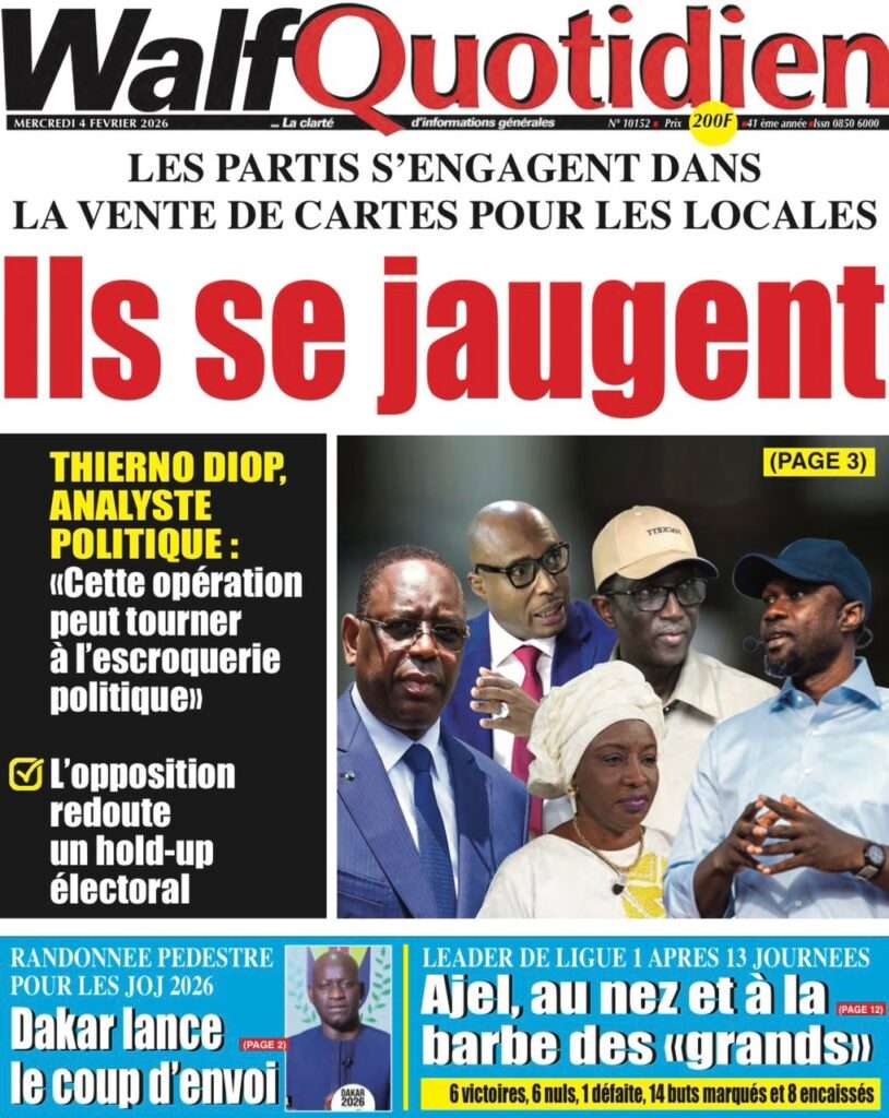 A la Une Actualité La Une Des Quotidiens – Mercredi 05 Février 2026 (Avec Ma Revue De Presse) Bour Sine février 4, 2026 0 Post navigation Previous: WAX I PICC : Protection des oiseaux en cage ou quand l’État donne priorité au symbolique sur l’essentielNext: ÉPHÉMÉRIDES DU 04 FÉVRIER More Stories A la Une Actualité La Une Des Quotidiens – Mercredi 29 Avril 2026 (Avec Ma Revue De Presse) Bour Sine avril 29, 2026 0 A la Une Actualité Politique Ce que change la nouvelle loi électorale adoptée par les députés Bour Sine avril 28, 2026 0 A la Une Actualité Politique « Ensemble, nous sommes une force »Par Hamidou Thiaw, Président du MPR Bour Sine avril 28, 2026 0 Laisser un commentaire Annuler la réponseVotre adresse e-mail ne sera pas publiée. Les champs obligatoires sont indiqués avec *Commentaire * Nom * E-mail * Site web Enregistrer mon nom, mon e-mail et mon site dans le navigateur pour mon prochain commentaire.