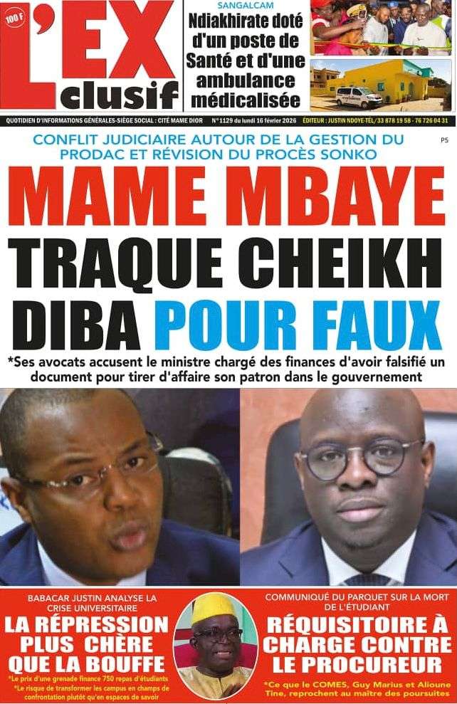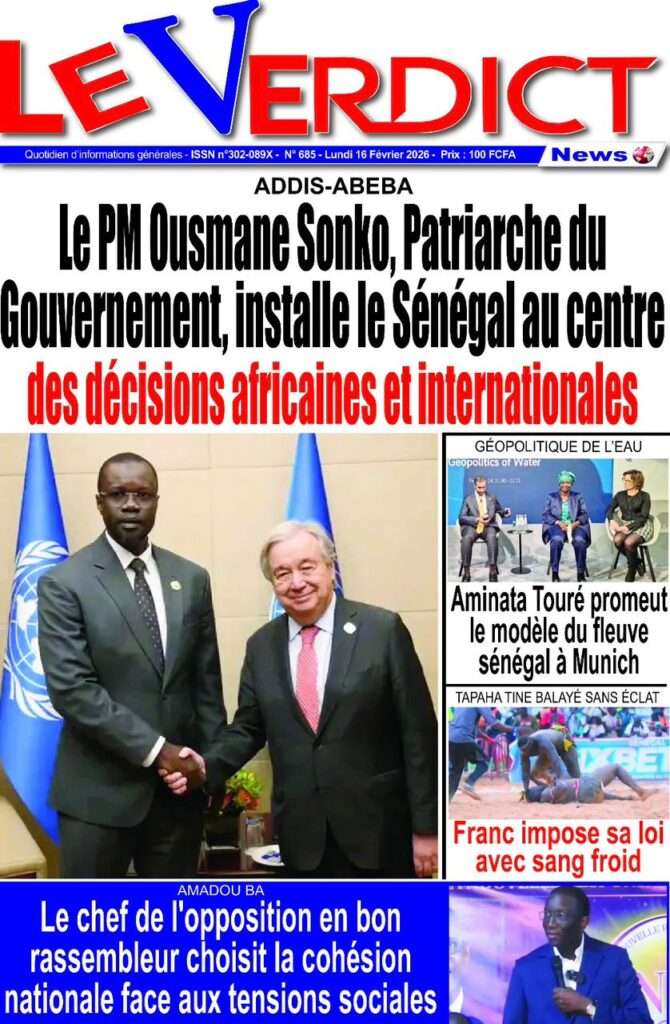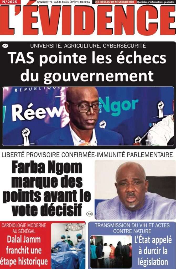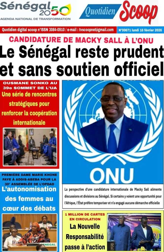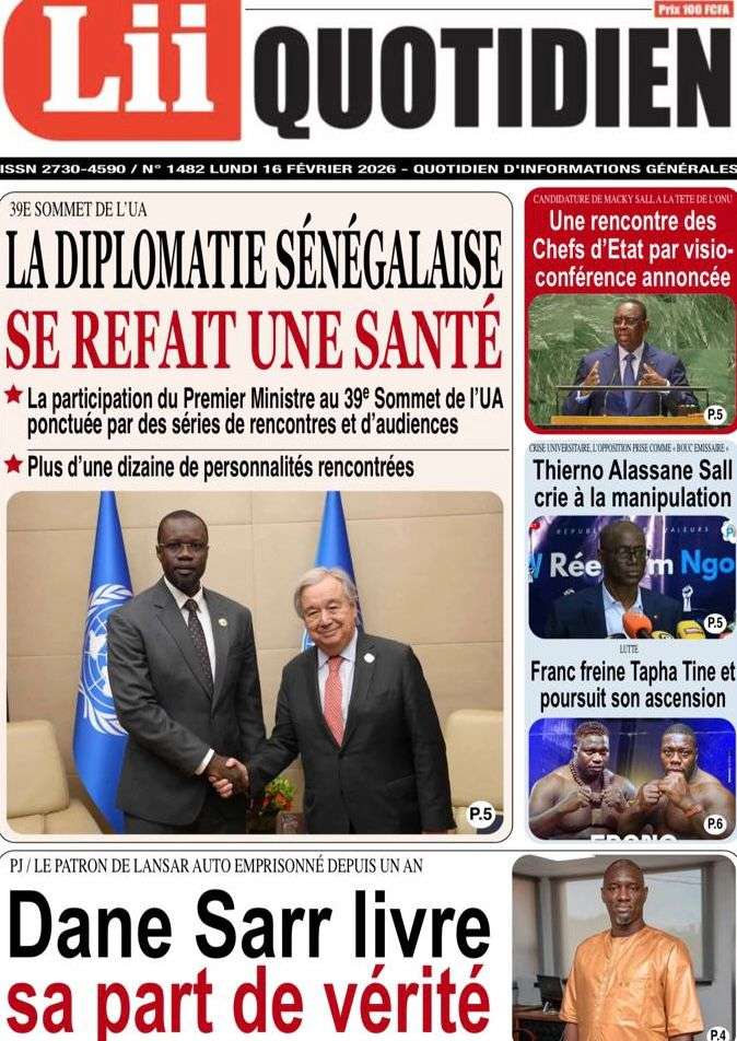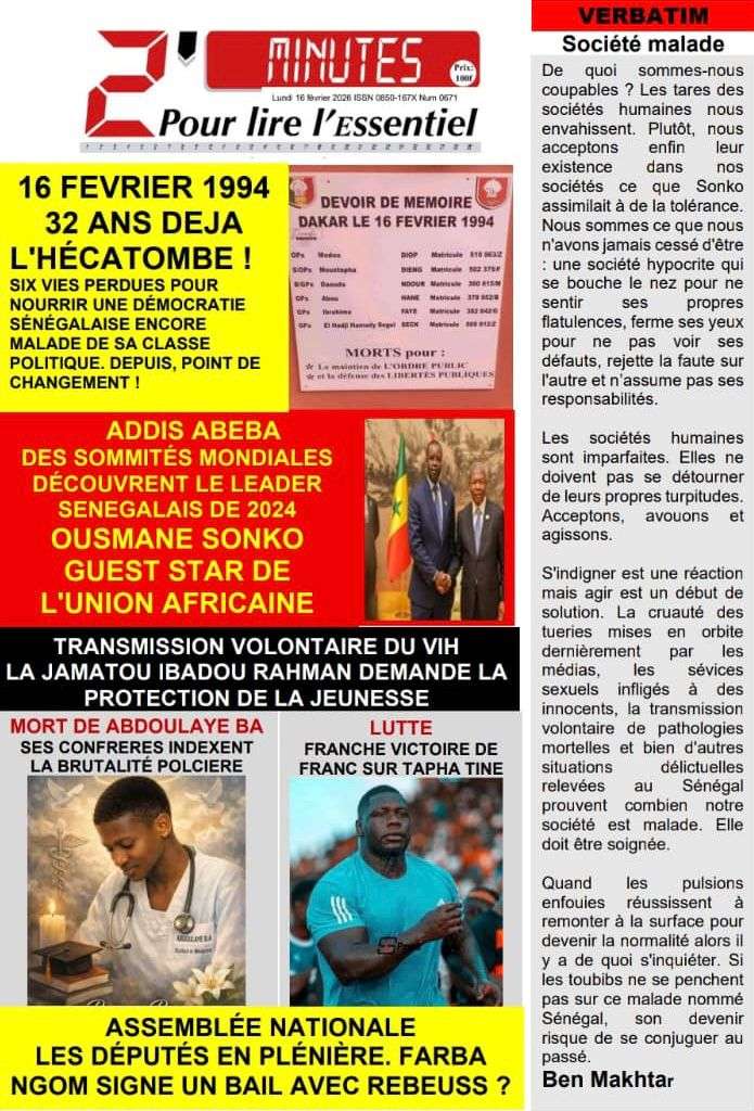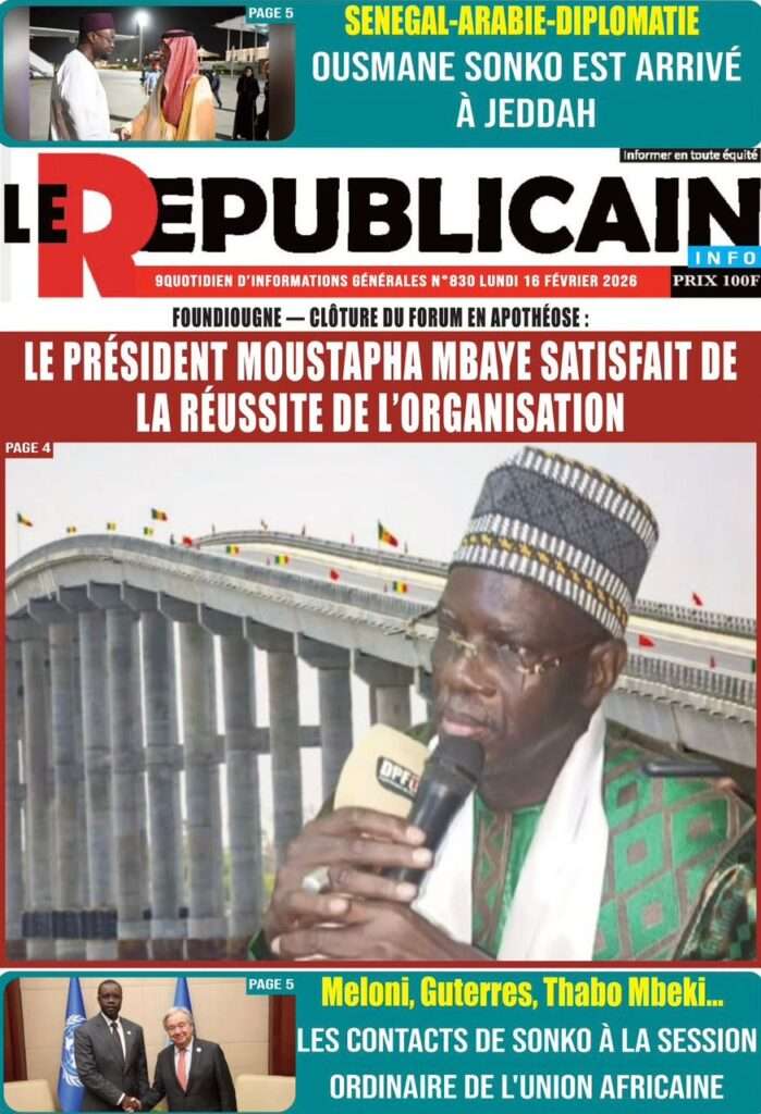 A la Une La Une Des Quotidiens – Lundi 16 Février 2026 (Avec Ma Revue De Presse) Bour Sine février 16, 2026 0 Post navigation Previous: REFONDATION DU SYSTÈME ÉDUCATIF : OSER ENFIN LA RÉFORME DE LA SÉLECTION DES ÉLITES (PAR SOREU MALICK DIOP)Next: Session chargée à l’Assemblée : trois jours pour trancher sur l’immunité, l’armée et les médias More Stories A la Une Actualité Politique Ce que change la nouvelle loi électorale adoptée par les députés Bour Sine avril 28, 2026 0 A la Une Actualité Politique « Ensemble, nous sommes une force »Par Hamidou Thiaw, Président du MPR Bour Sine avril 28, 2026 0 A la Une Actualité Pape Malick Ndour envoyé en prison Bour Sine avril 28, 2026 0 Laisser un commentaire Annuler la réponseVotre adresse e-mail ne sera pas publiée. Les champs obligatoires sont indiqués avec *Commentaire * Nom * E-mail * Site web Enregistrer mon nom, mon e-mail et mon site dans le navigateur pour mon prochain commentaire.