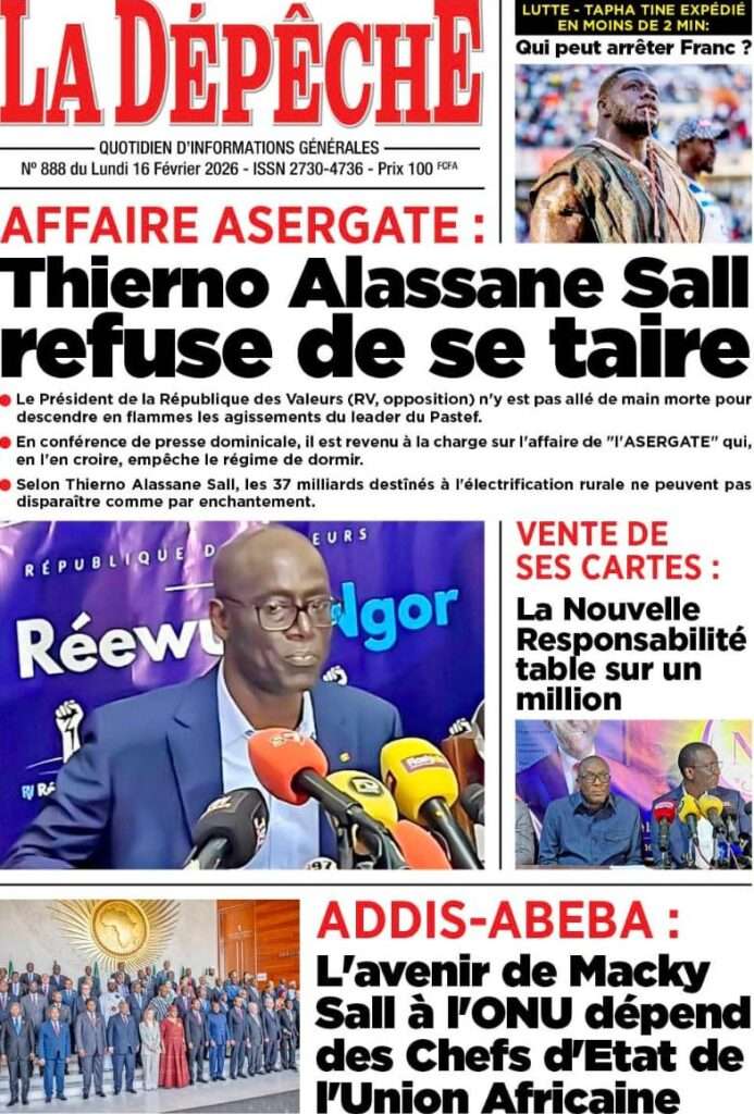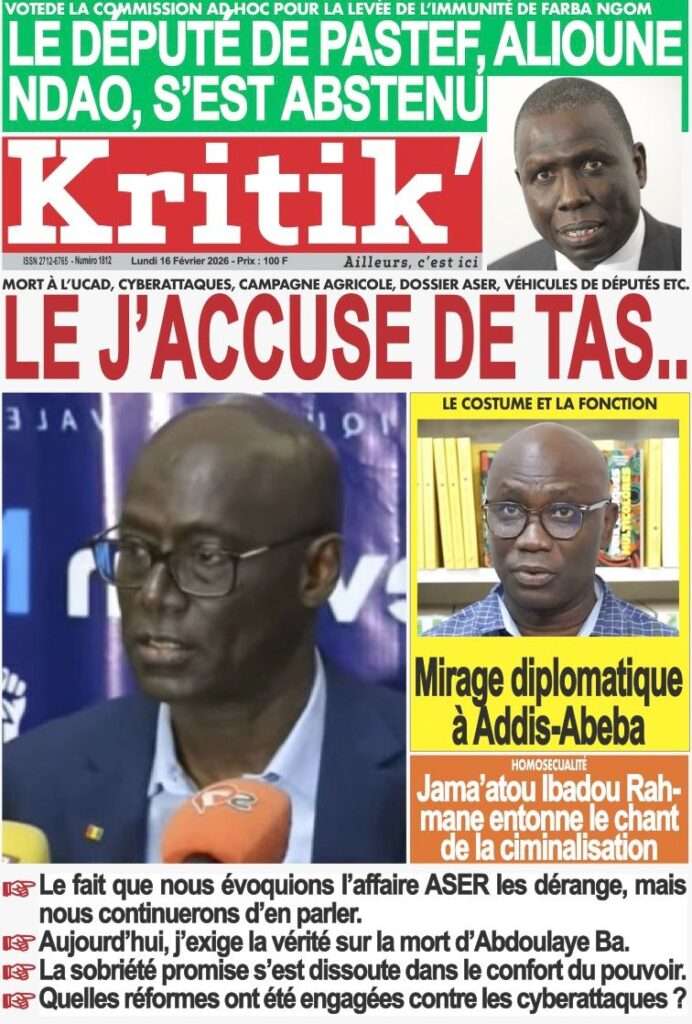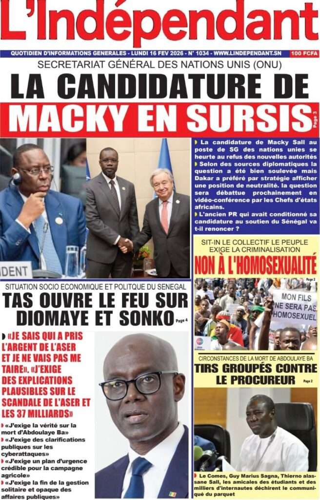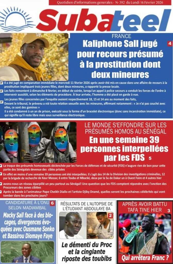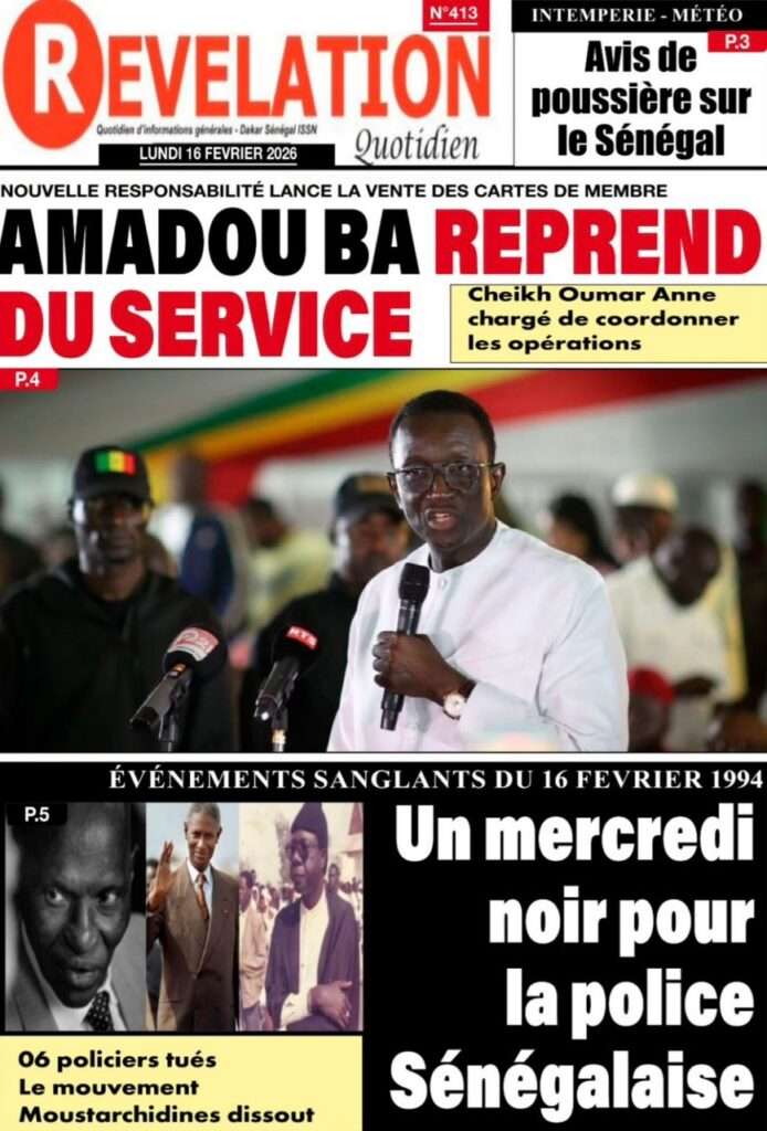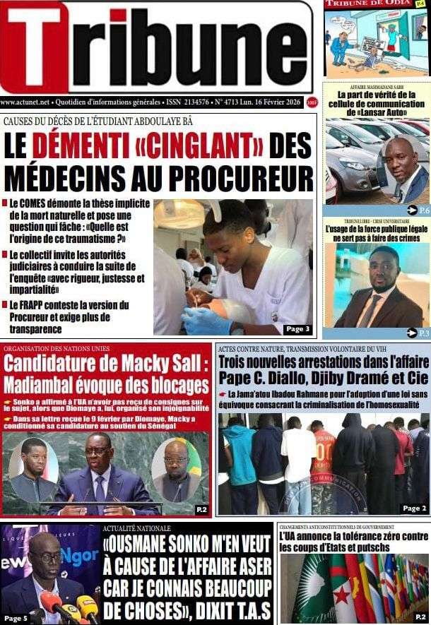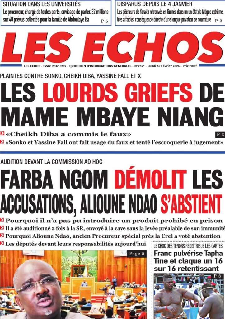 A la Une La Une Des Quotidiens – Lundi 16 Février 2026 (Avec Ma Revue De Presse) Bour Sine février 16, 2026 0 Post navigation Previous: REFONDATION DU SYSTÈME ÉDUCATIF : OSER ENFIN LA RÉFORME DE LA SÉLECTION DES ÉLITES (PAR SOREU MALICK DIOP)Next: Session chargée à l’Assemblée : trois jours pour trancher sur l’immunité, l’armée et les médias More Stories A la Une Actualité Politique Ce que change la nouvelle loi électorale adoptée par les députés Bour Sine avril 28, 2026 0 A la Une Actualité Politique « Ensemble, nous sommes une force »Par Hamidou Thiaw, Président du MPR Bour Sine avril 28, 2026 0 A la Une Actualité Pape Malick Ndour envoyé en prison Bour Sine avril 28, 2026 0 Laisser un commentaire Annuler la réponseVotre adresse e-mail ne sera pas publiée. Les champs obligatoires sont indiqués avec *Commentaire * Nom * E-mail * Site web Enregistrer mon nom, mon e-mail et mon site dans le navigateur pour mon prochain commentaire.